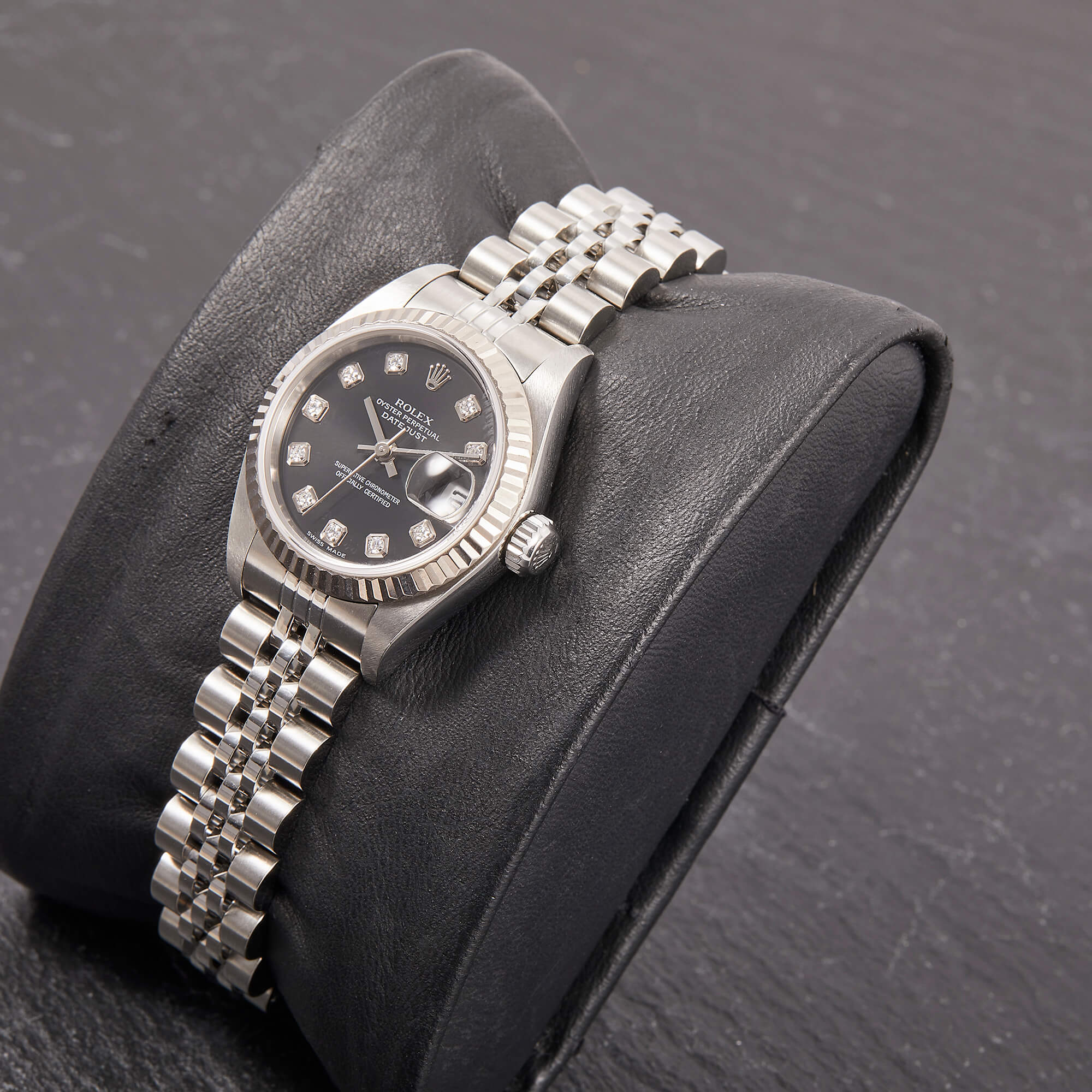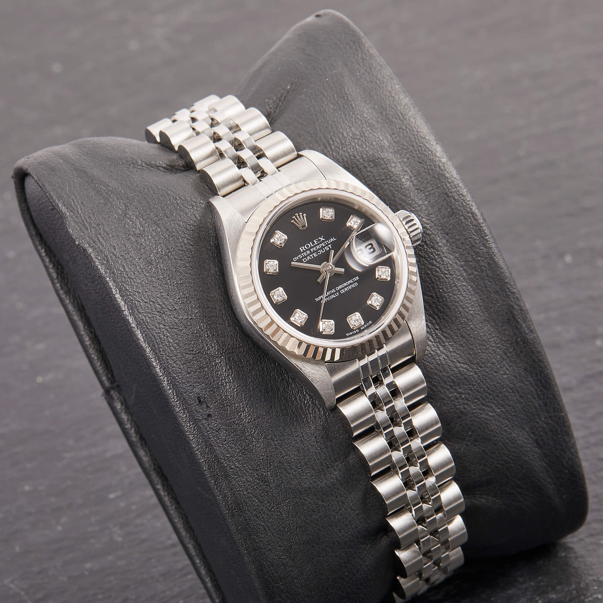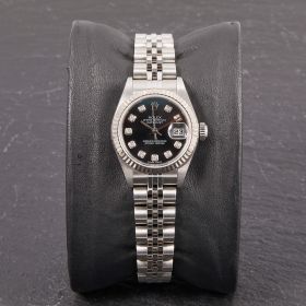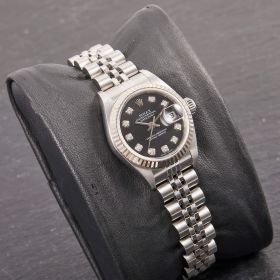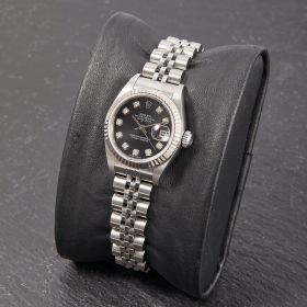Diese elegante Lady-Datejust 79174 überzeugt mit einem schönen schwarzen Zifferblatt inkl. funkelnden Diamantindizes und originalem Jubilee-Band. Die Uhr befindet sich in sehr schönem Zustand. Ein klassisches Damenmodell mit besonderem Charme.- Durchmesser