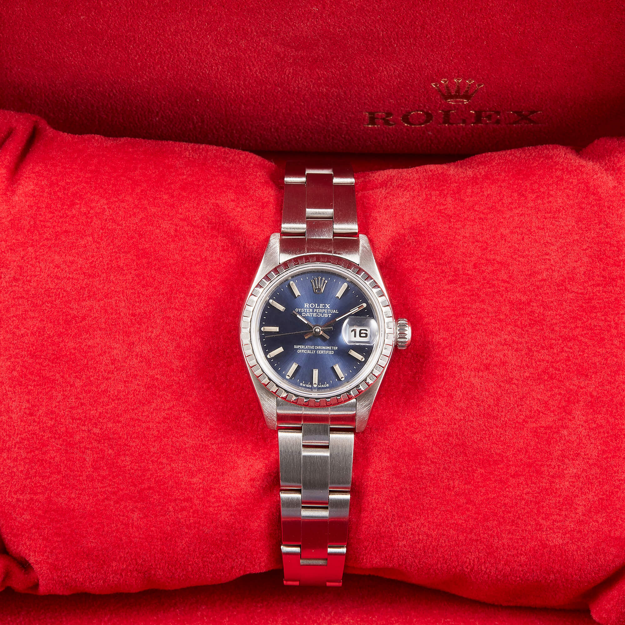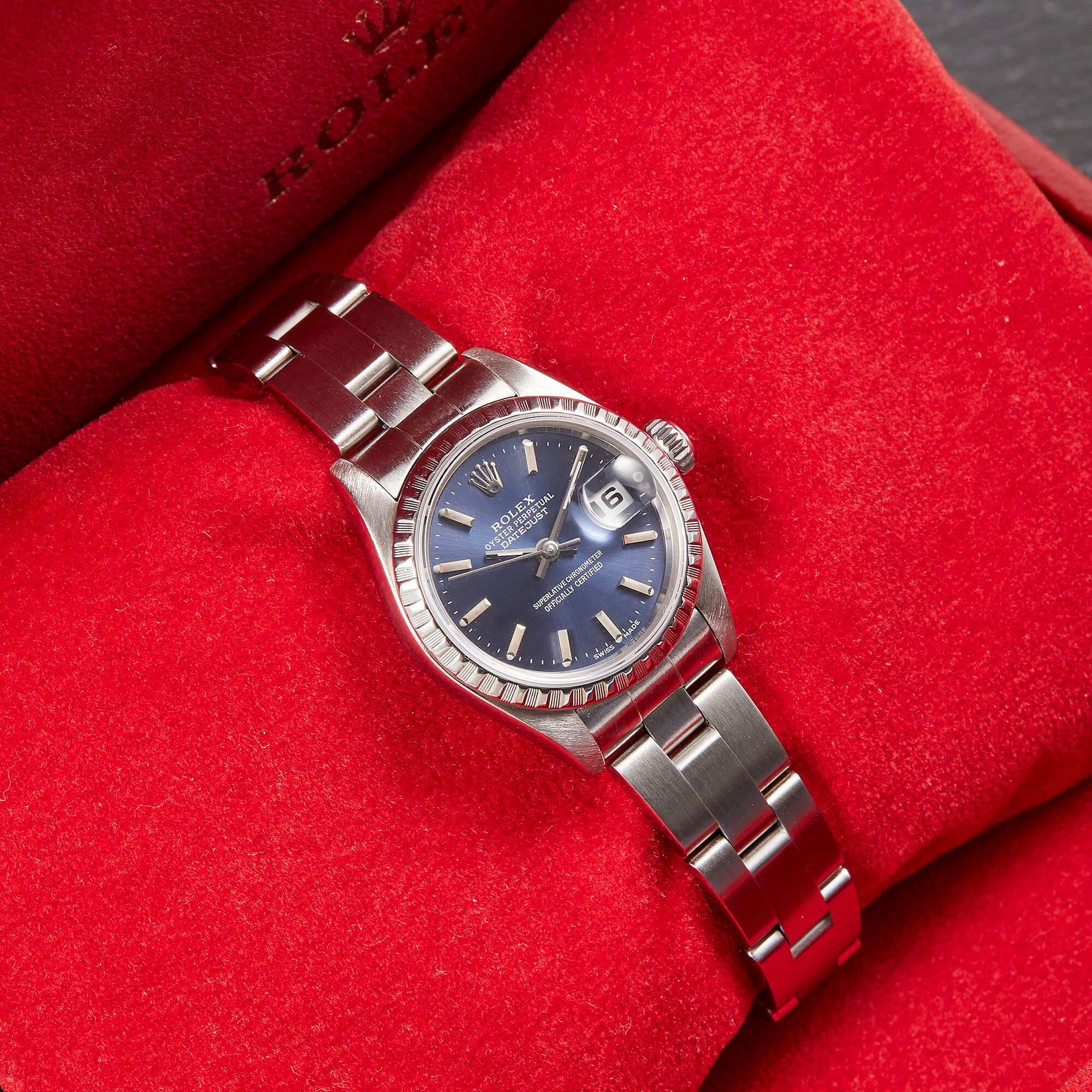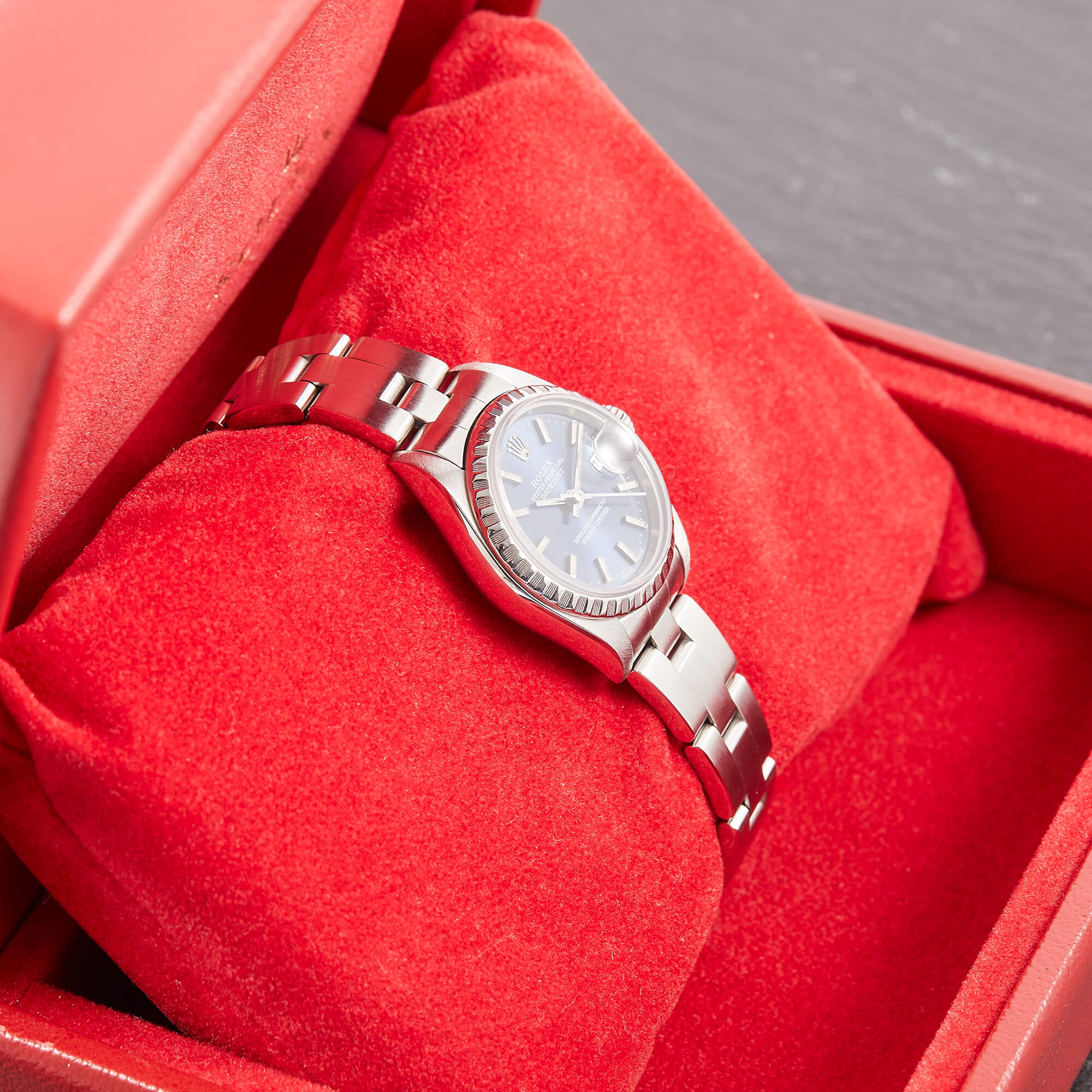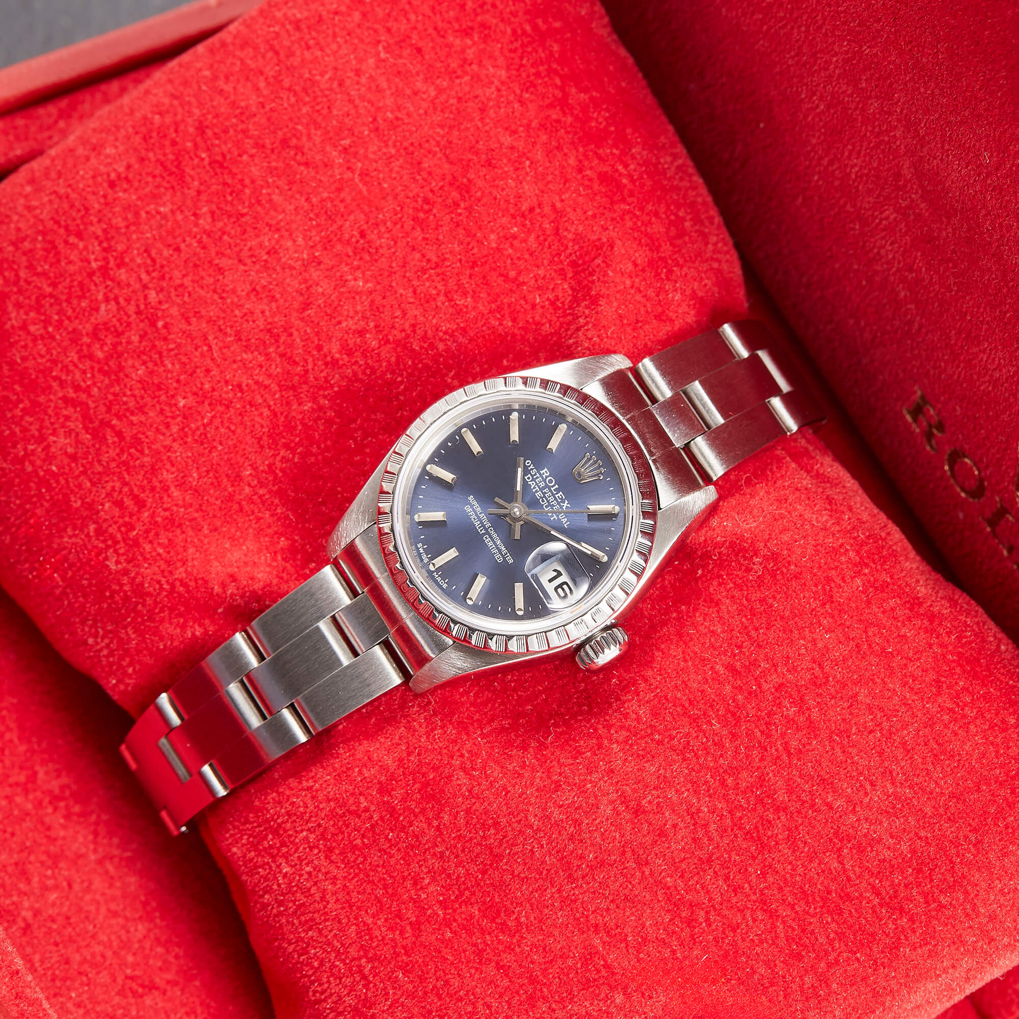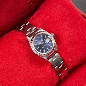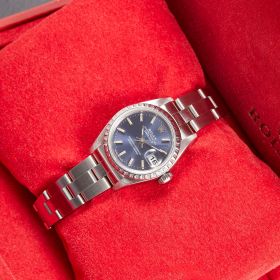 Diese elegante Lady-Datejust 79240 überzeugt mit einem schönen blauen Zifferblatt inkl. Strichindizes und originalem Oysterband. Die Uhr befindet sich in sehr schönem Zustand. Ein klassisches Damenmodell mit besonderem Charme.- Durchmesser