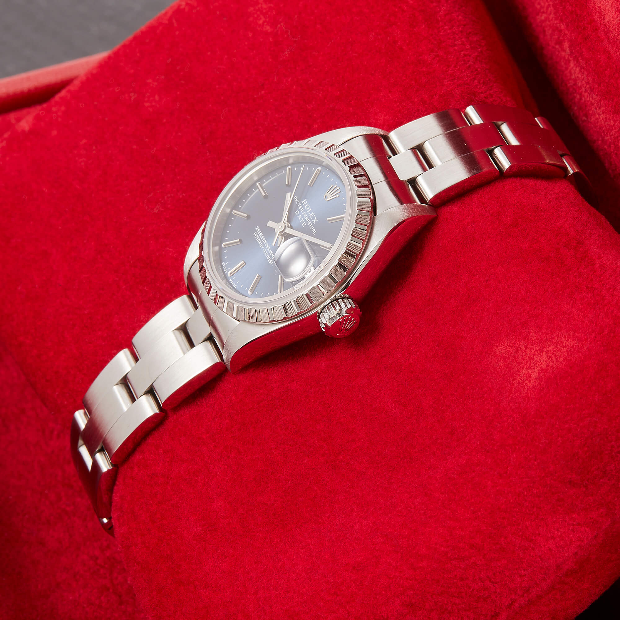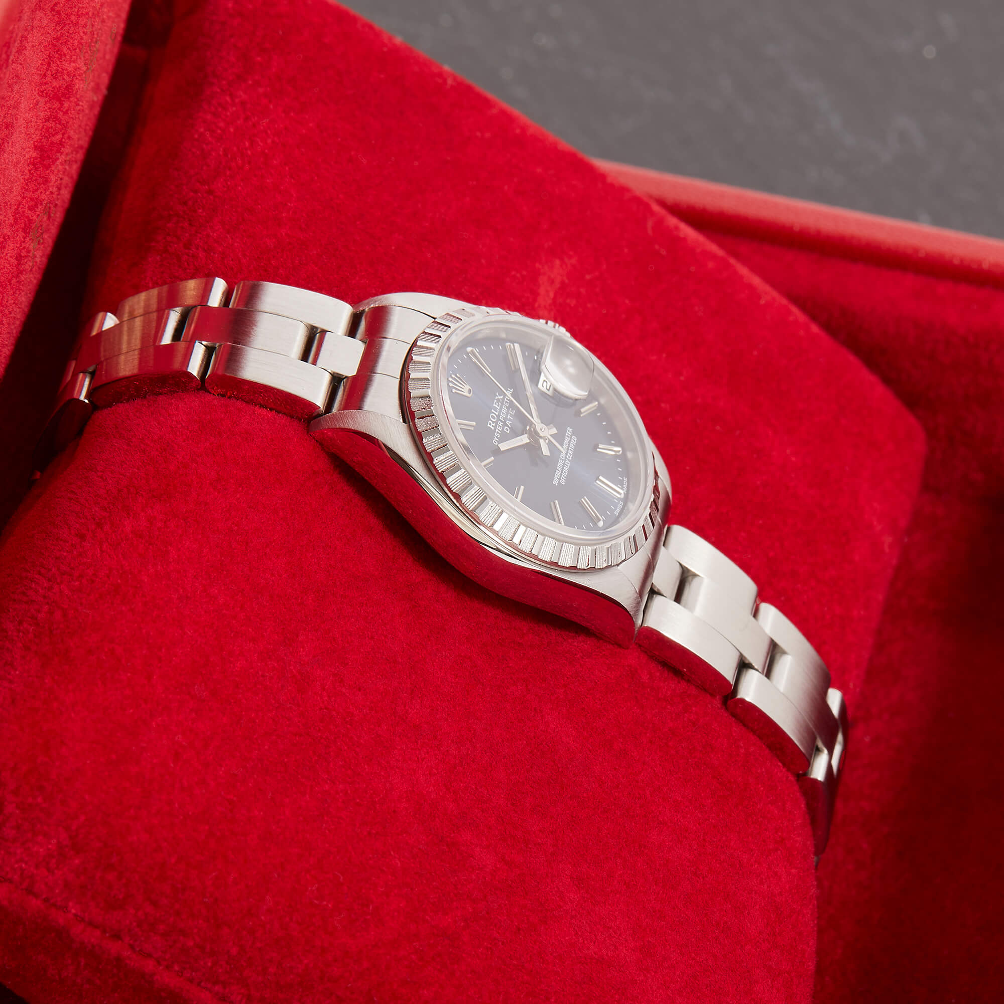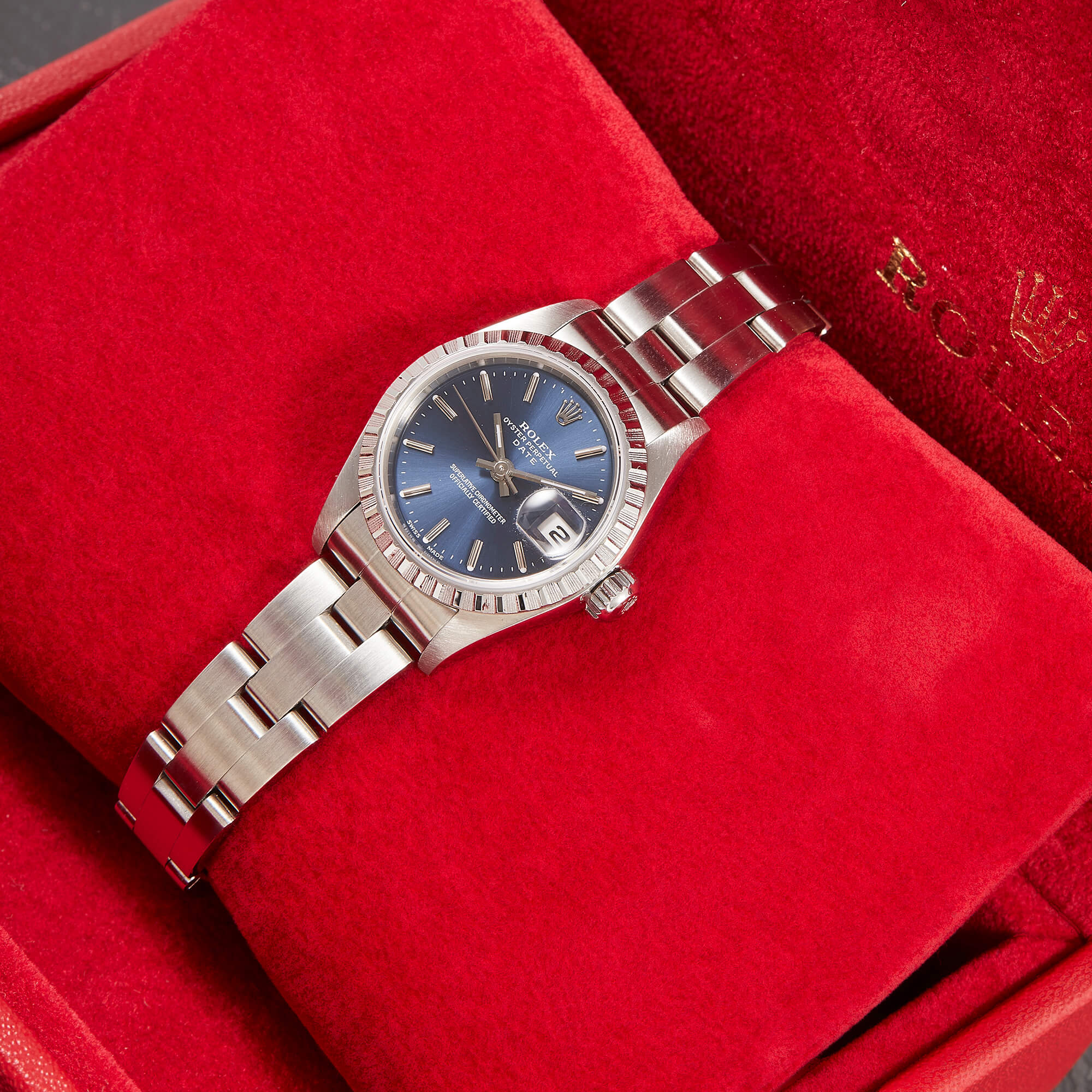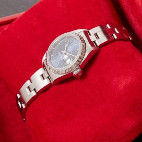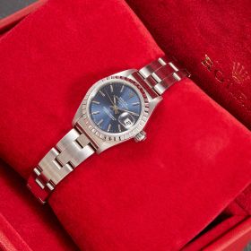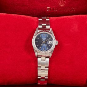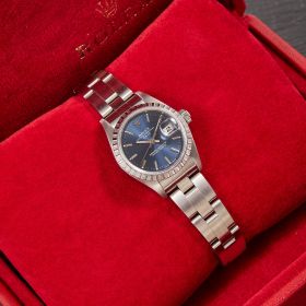 Diese elegante Lady-Datejust 79240 überzeugt mit einem schönen blauen Zifferblatt inkl. Strichindizes und originalem Oysterband. Die Uhr befindet sich in sehr schönem Zustand. Ein klassisches Damenmodell mit besonderem Charme.- Durchmesser