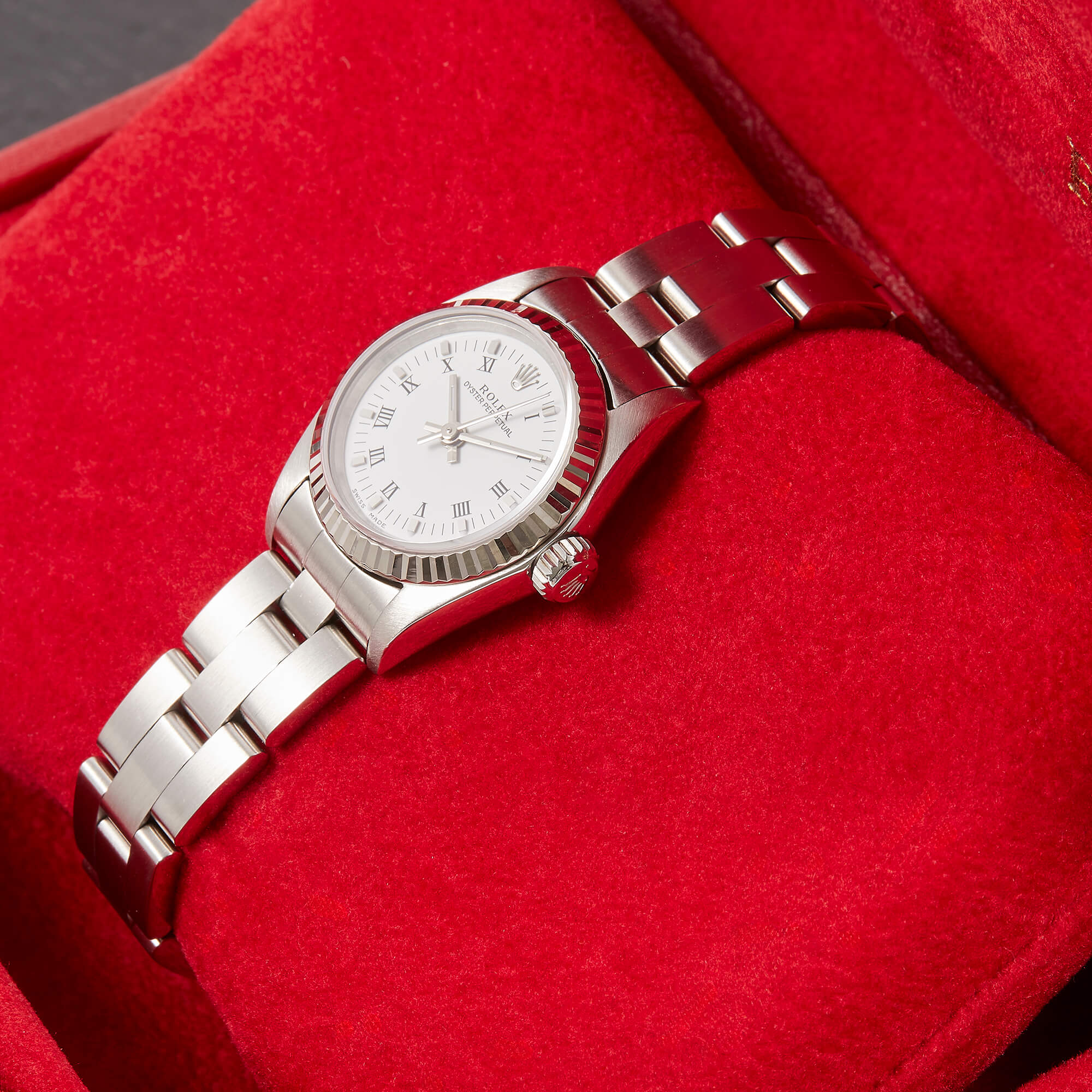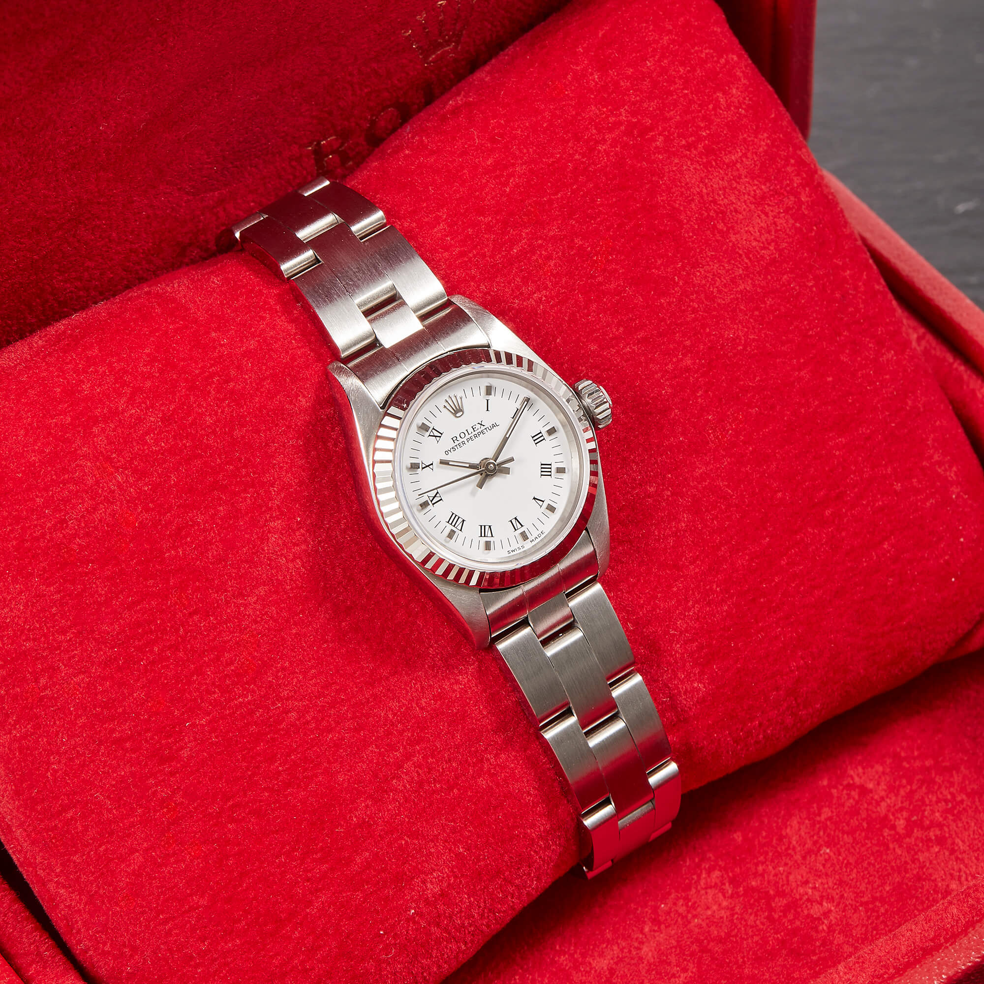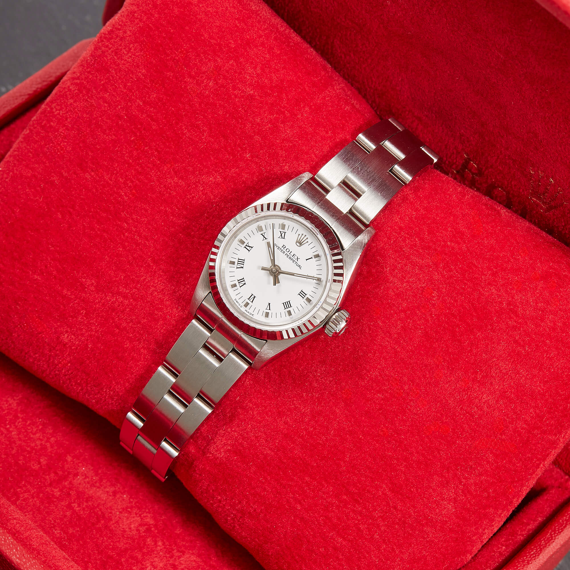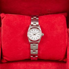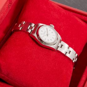 Diese elegante Oyster Perpetual Lady 26 Referenz 67194 überzeugt mit einem schönen weißen Zifferblatt inkl. römischen Indizes und originalem Oysterband. Die Uhr befindet sich in sehr schönem Zustand. Ein klassisches Damenmodell mit besonderem Charme.- Durchmesser