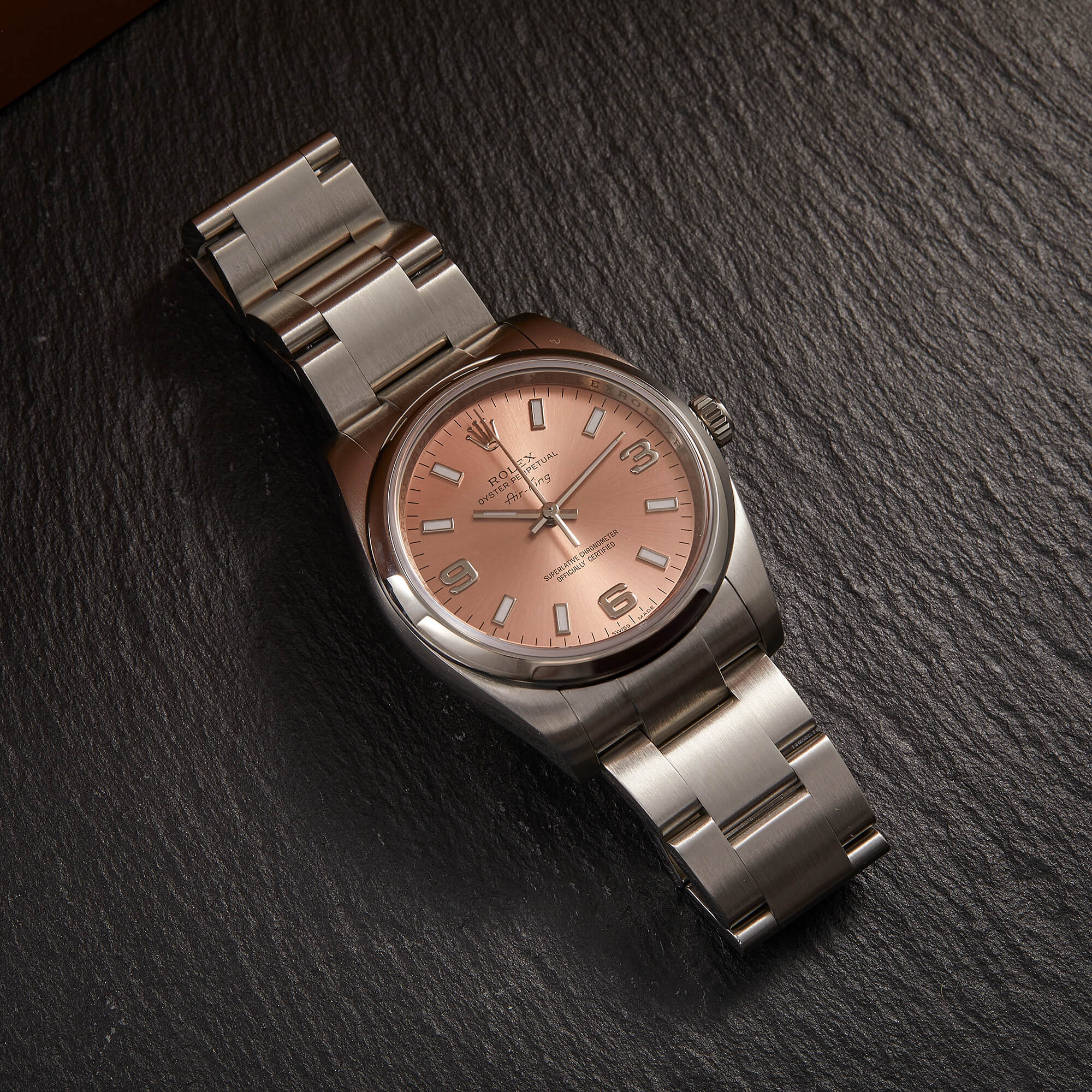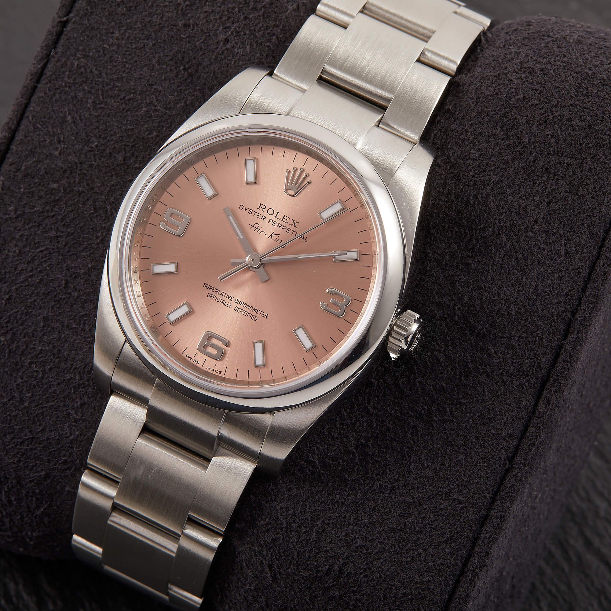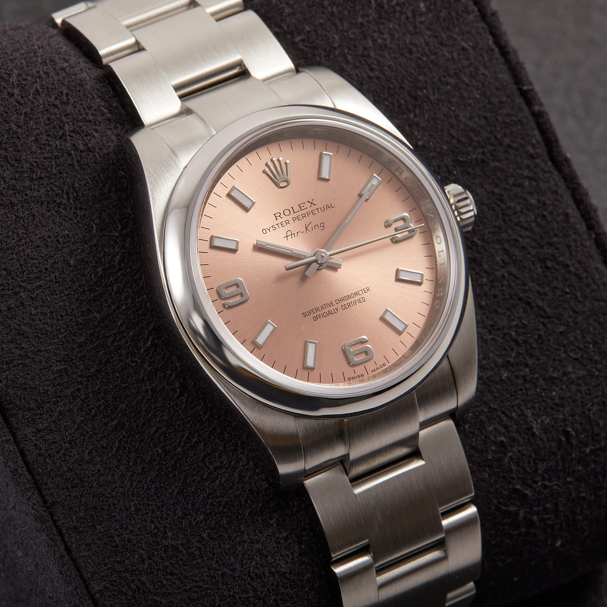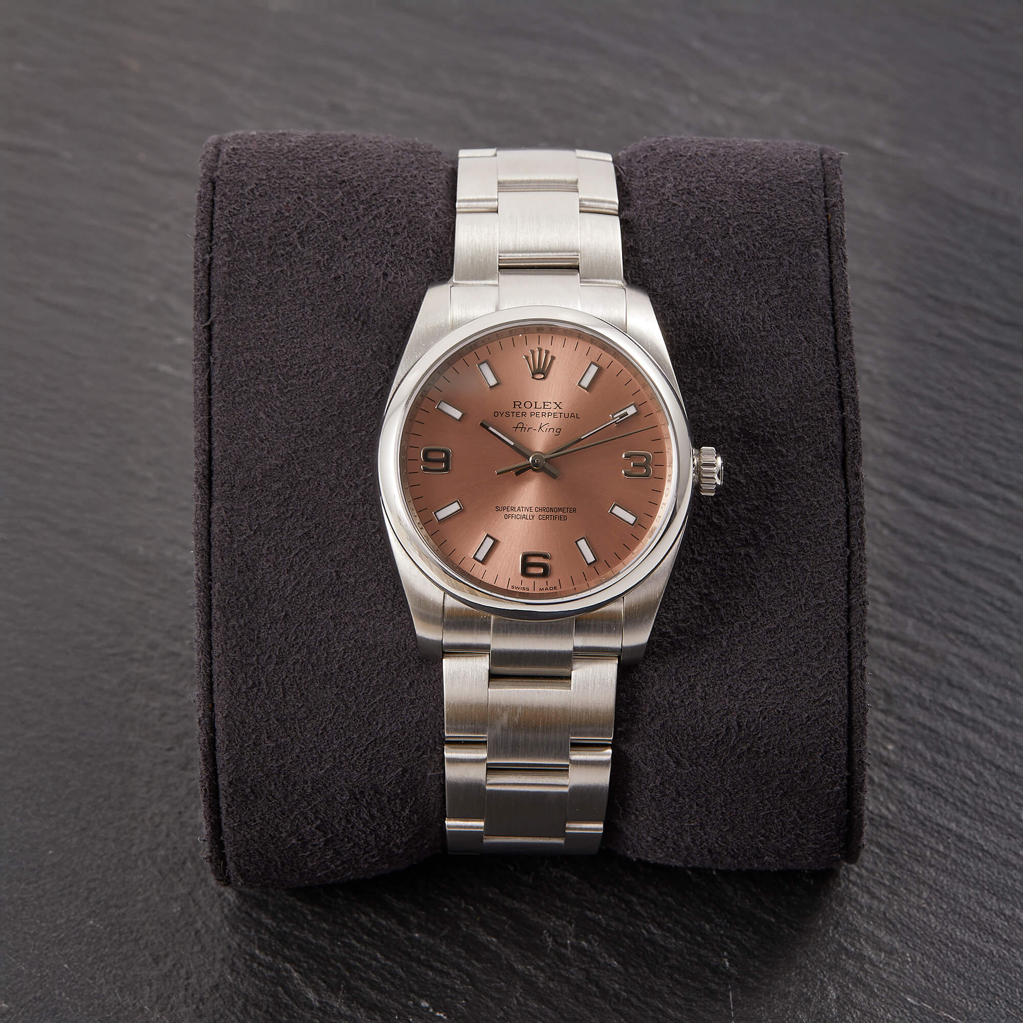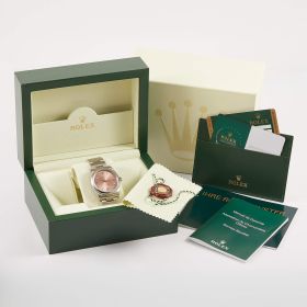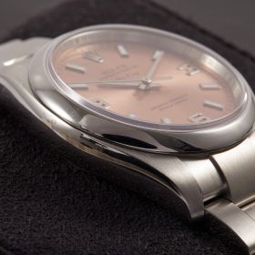Die Rolex Air-King Referenz 114200 überzeugt mit einem eleganten rosafarbenen Sonnenschliff-Zifferblatt und klassischer Rolex-Ästhetik. Dieses Exemplar kommt im vollständigen Fullset inklusive Box und Papieren und wurde frisch revisioniert – technisch wie optisch in hervorragendem Zustand. Eine stilvolle und seltene Variante der beliebten Air-King.