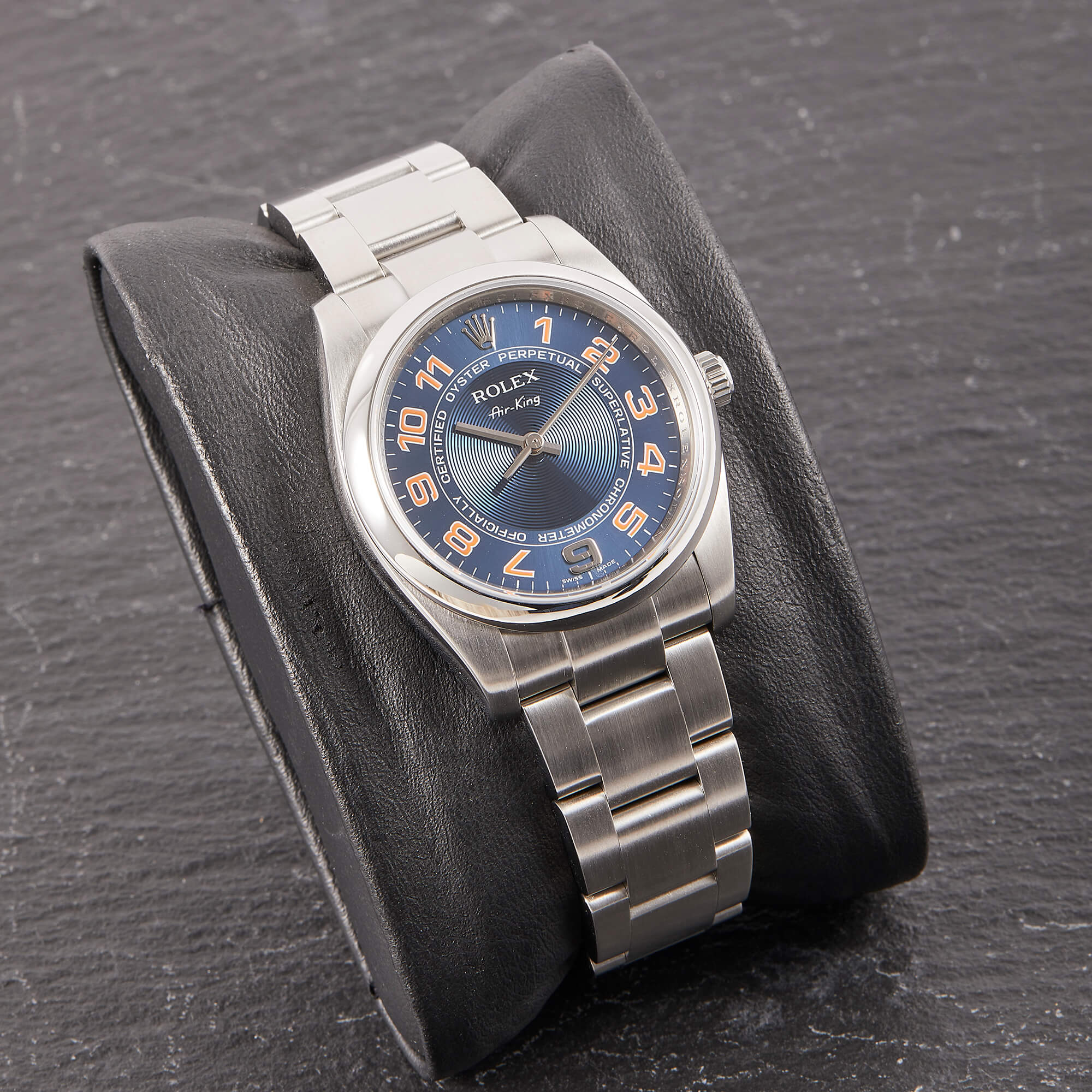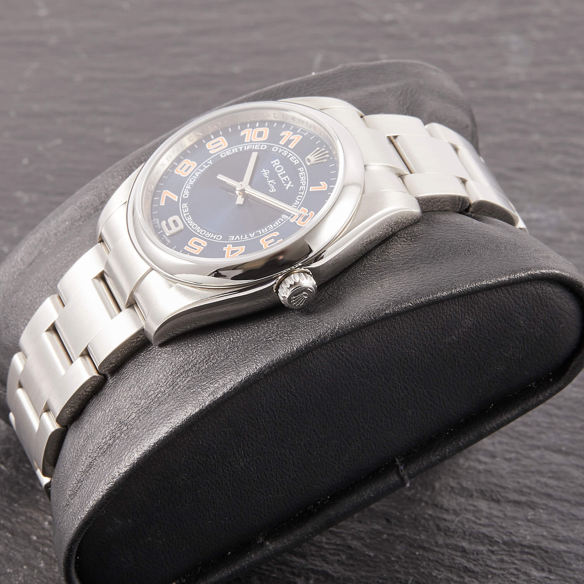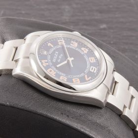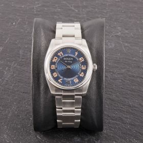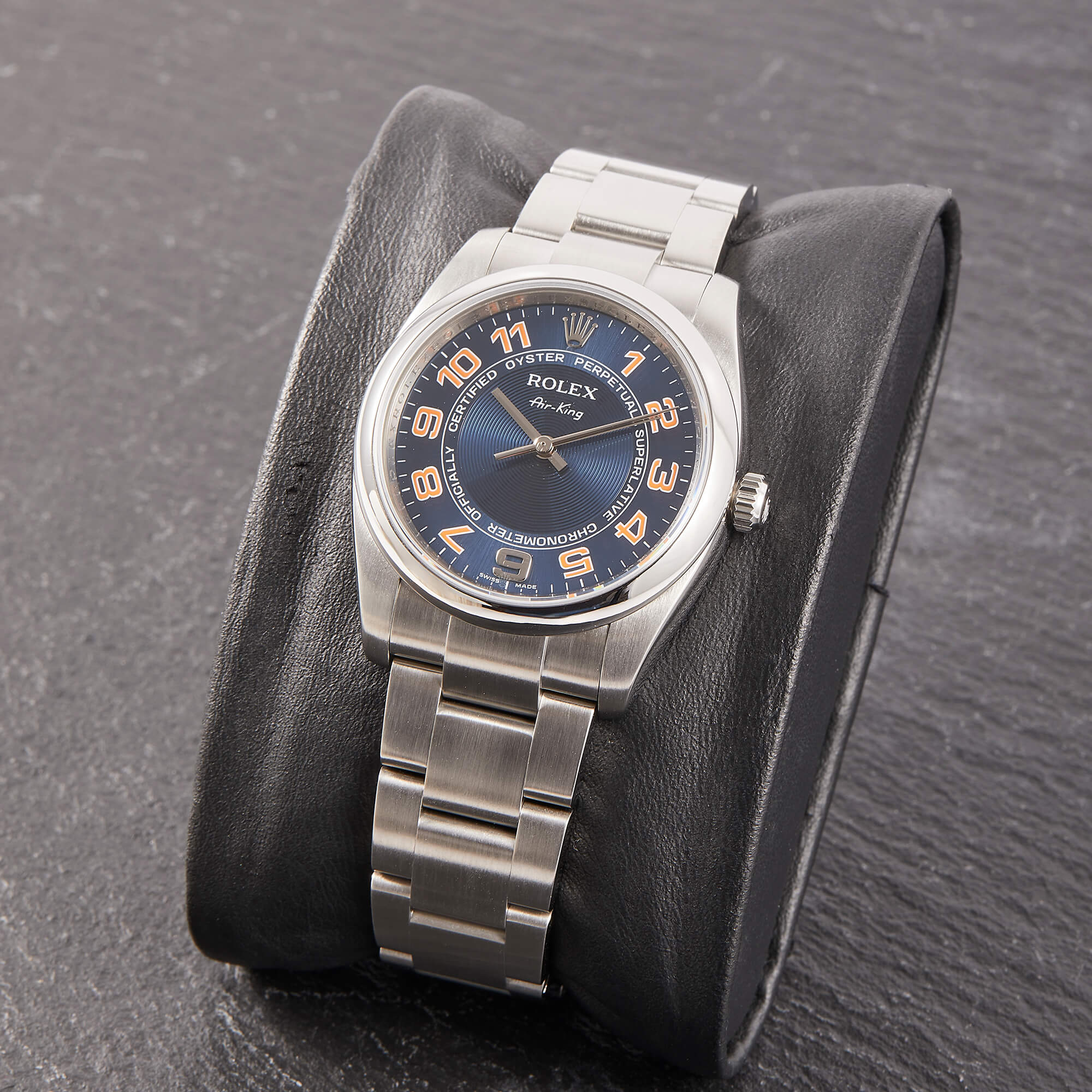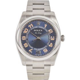 Die Rolex Air-King Referenz 114200 mit blauem Concentric Dial ist ein wahrer Klassiker der Marke, der durch sein schlichtes und elegantes Design besticht. Das markante Zifferblatt mit seinen konzentrischen Ringen sorgt für einen einzigartigen, optischen Effekt und hebt die Zeitangabe auf stilvolle Weise hervor. Die Uhr ist im Fullset erhältlich, was bedeutet, dass sie mit sämtlichem Originalzubehör wie Box, Papieren und Garantie geliefert wird.- Durchmesser