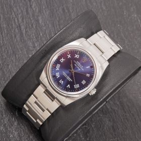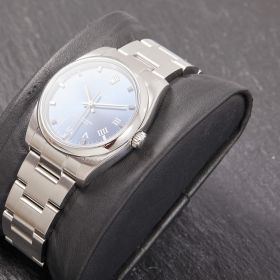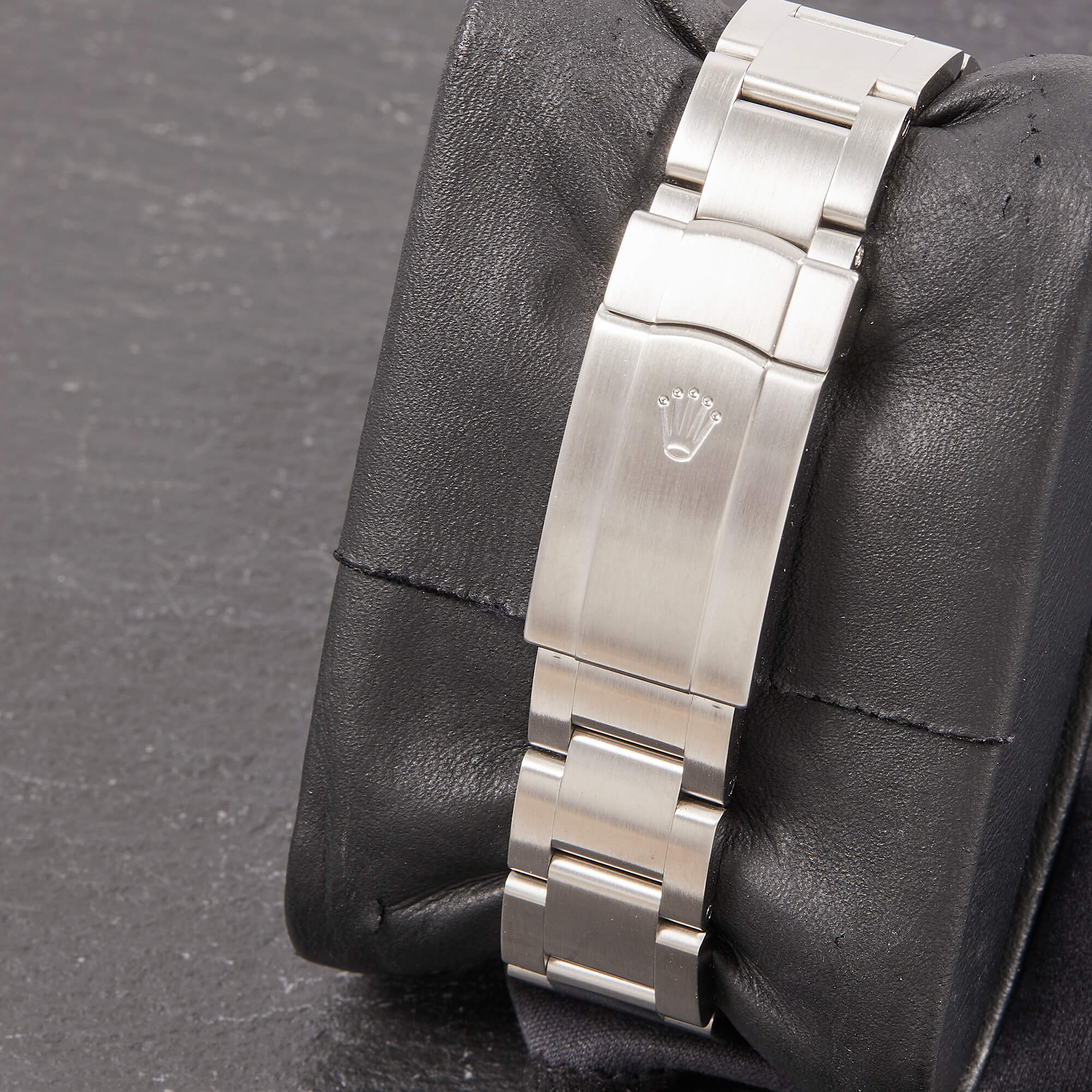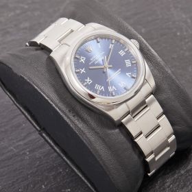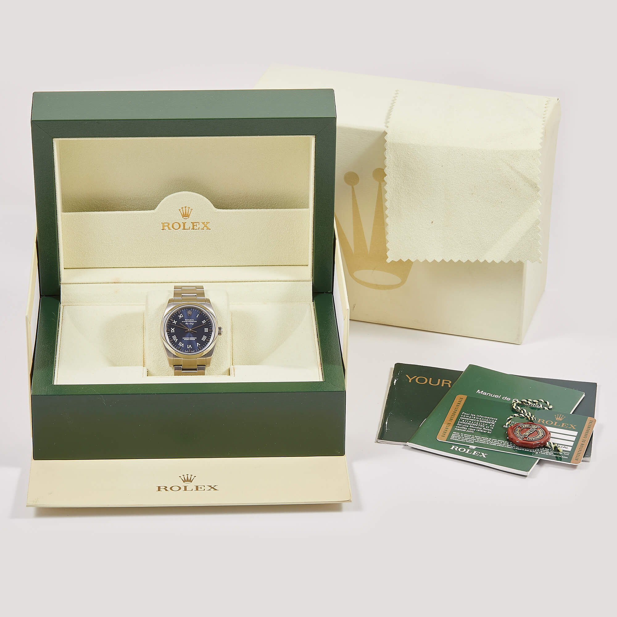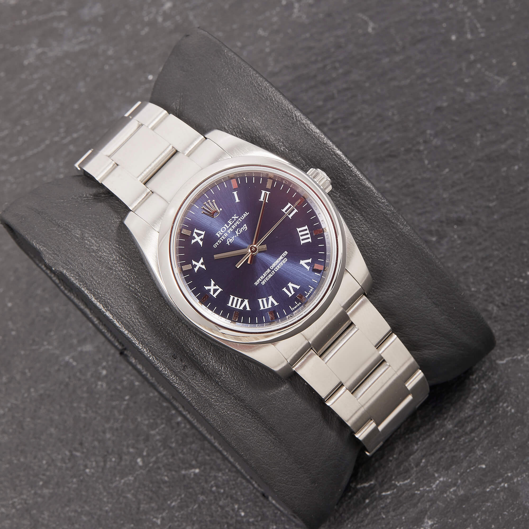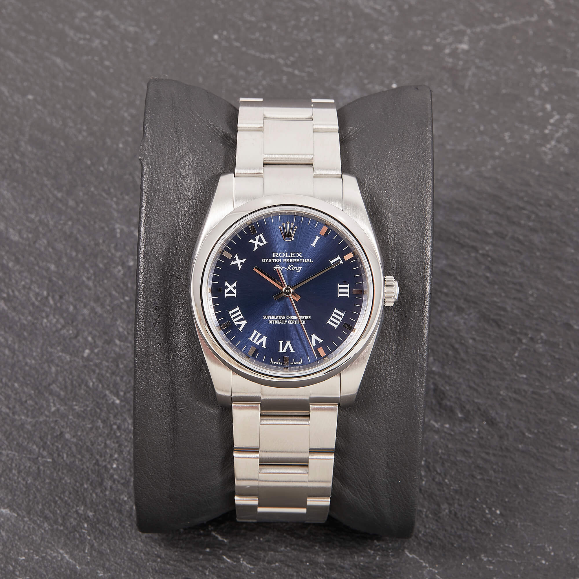 Die Rolex Air-King 34 Referenz 114200 besticht durch ihr elegantes schwarzes Zifferblatt und klassischem Edelstahlgehäuse. Die Uhr befindet sich in schönem Zustand.- Durchmesser