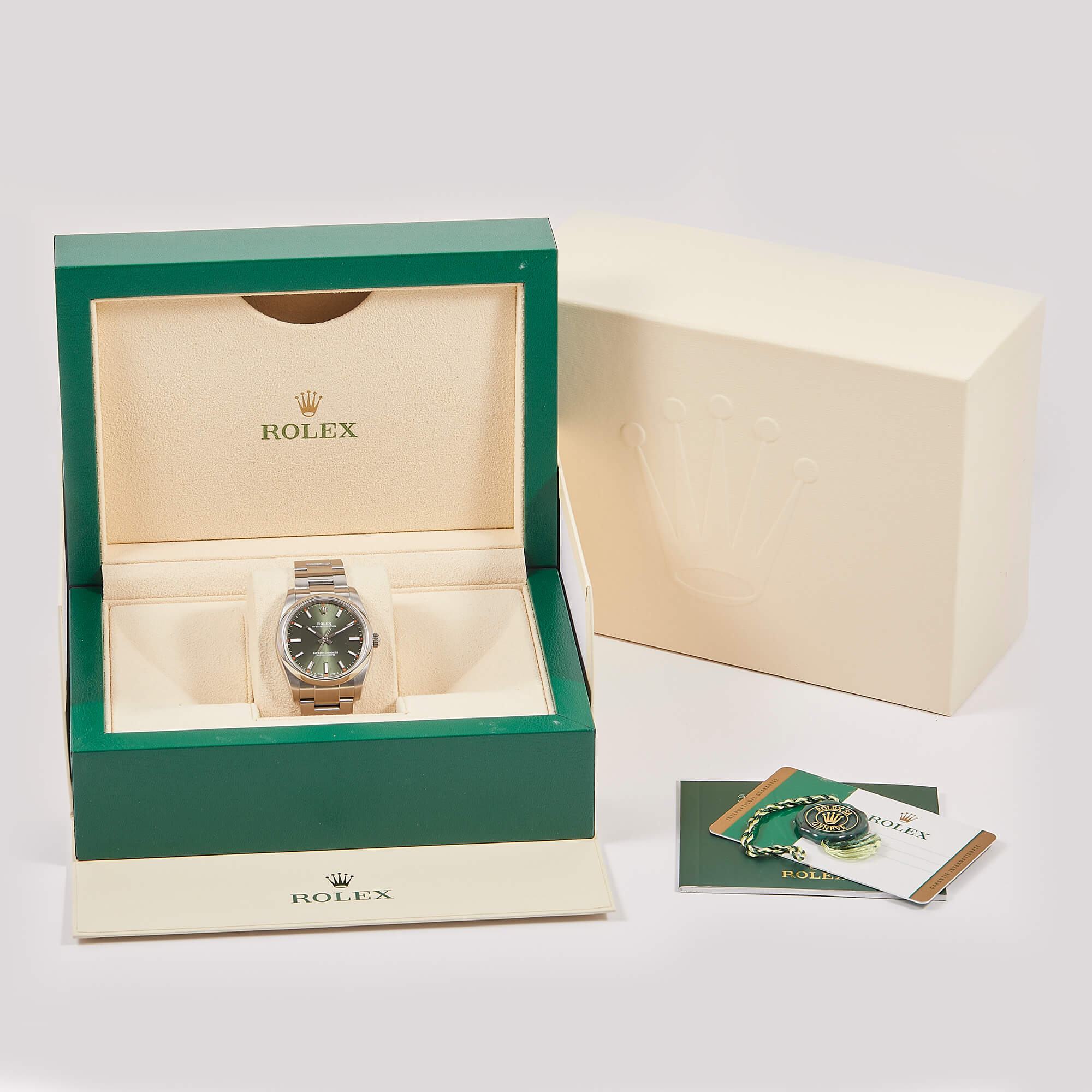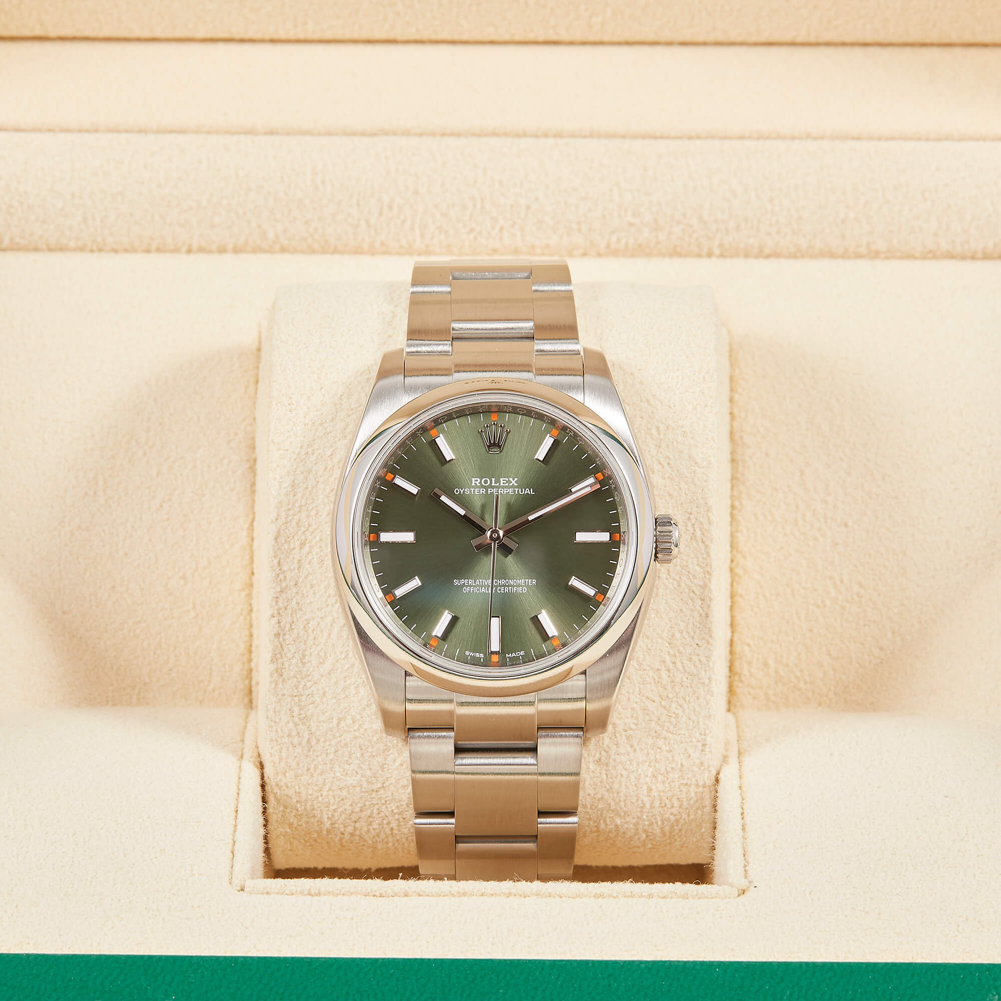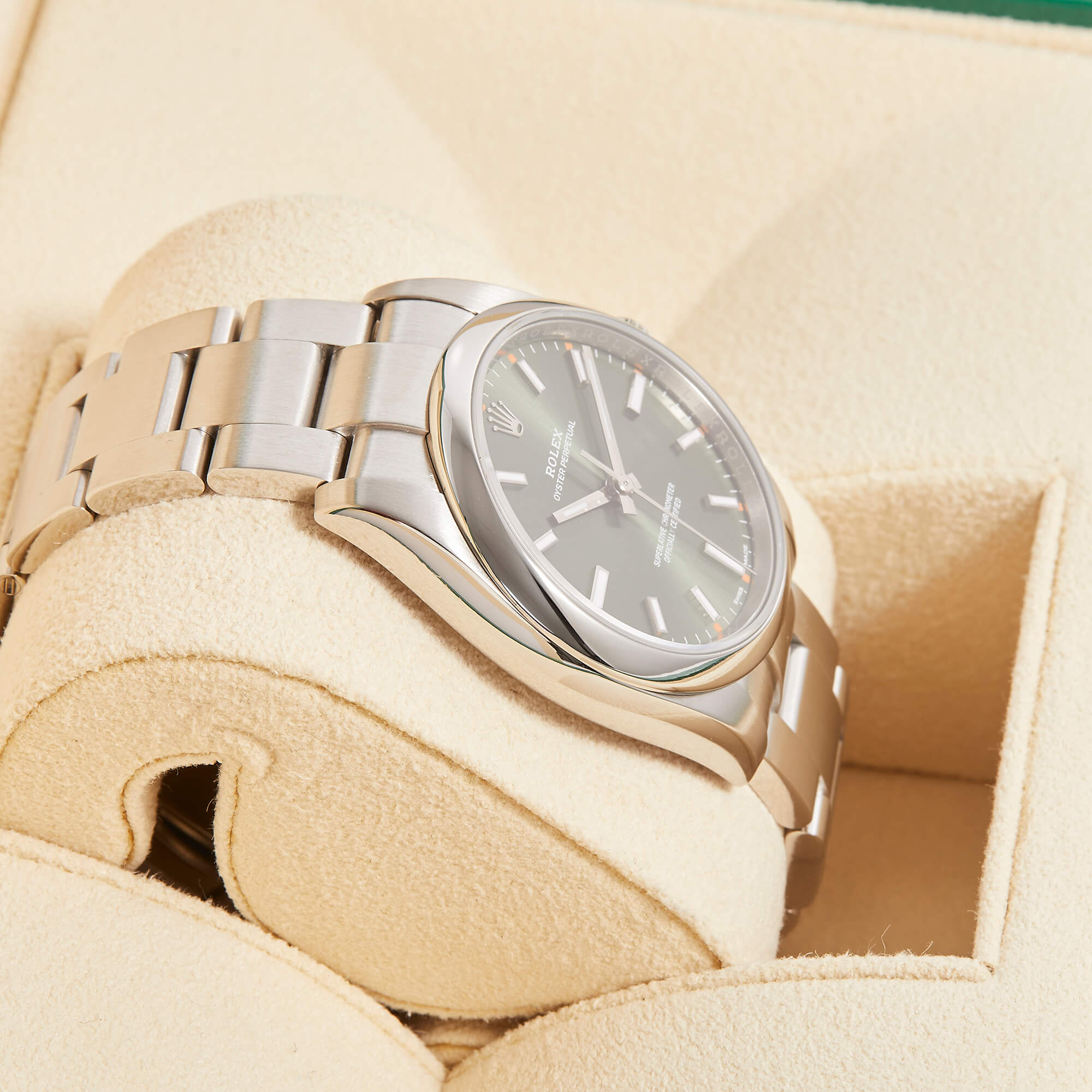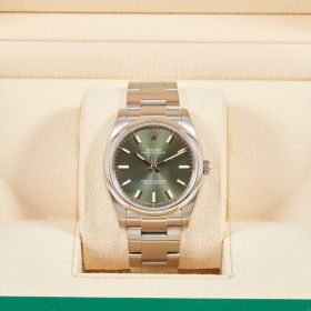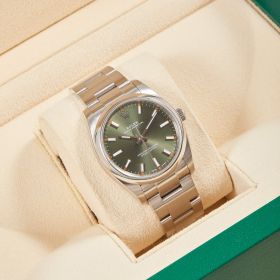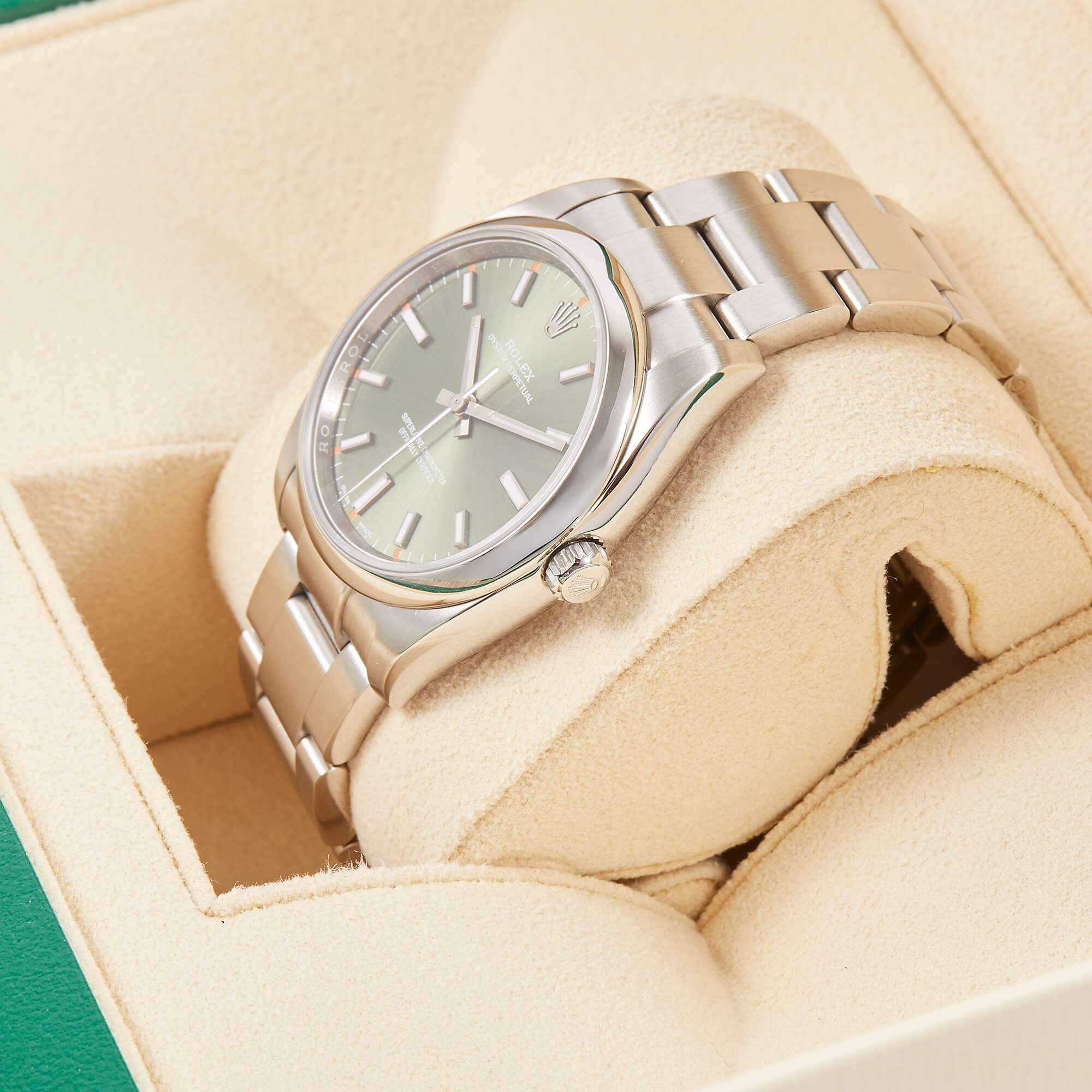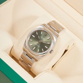 Die Rolex Oyster Perpetual 34 Referenz 114200 besticht durch ihr elegantes grünes Zifferblatt und klassischem Edelstahlgehäuse. Die Uhr befindet sich in schönem Zustand.- Durchmesser