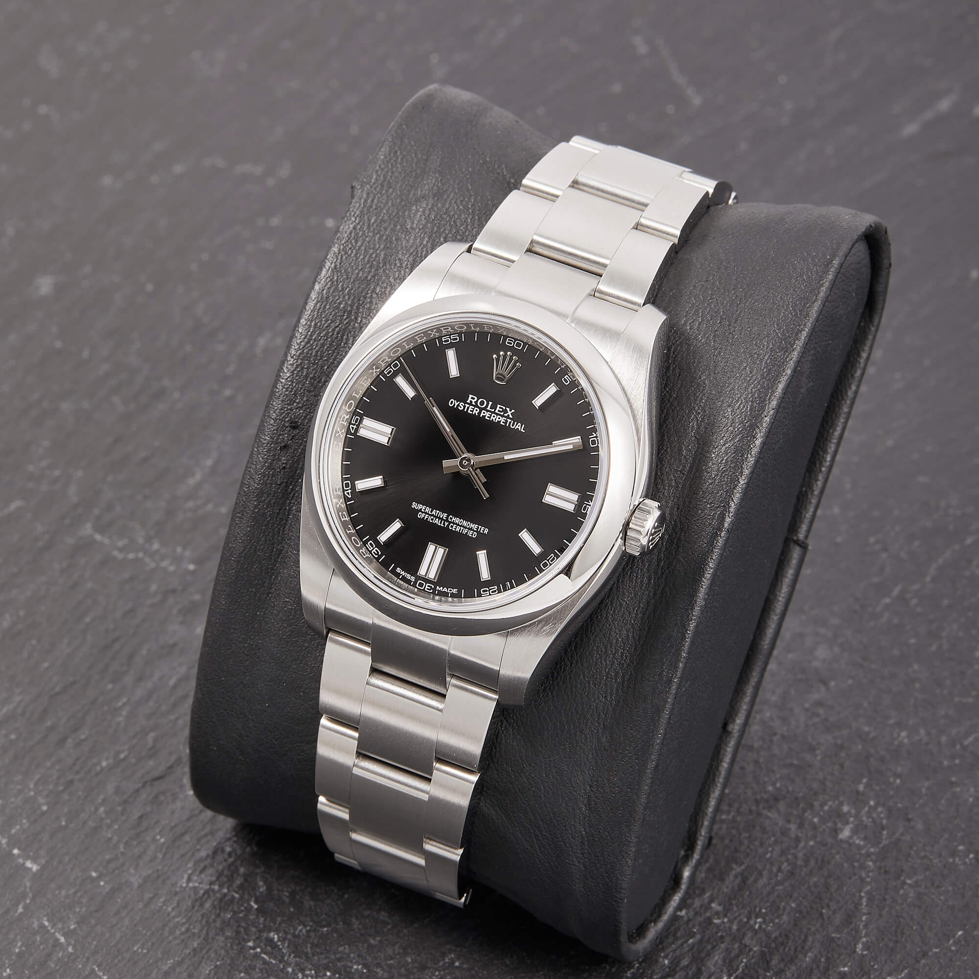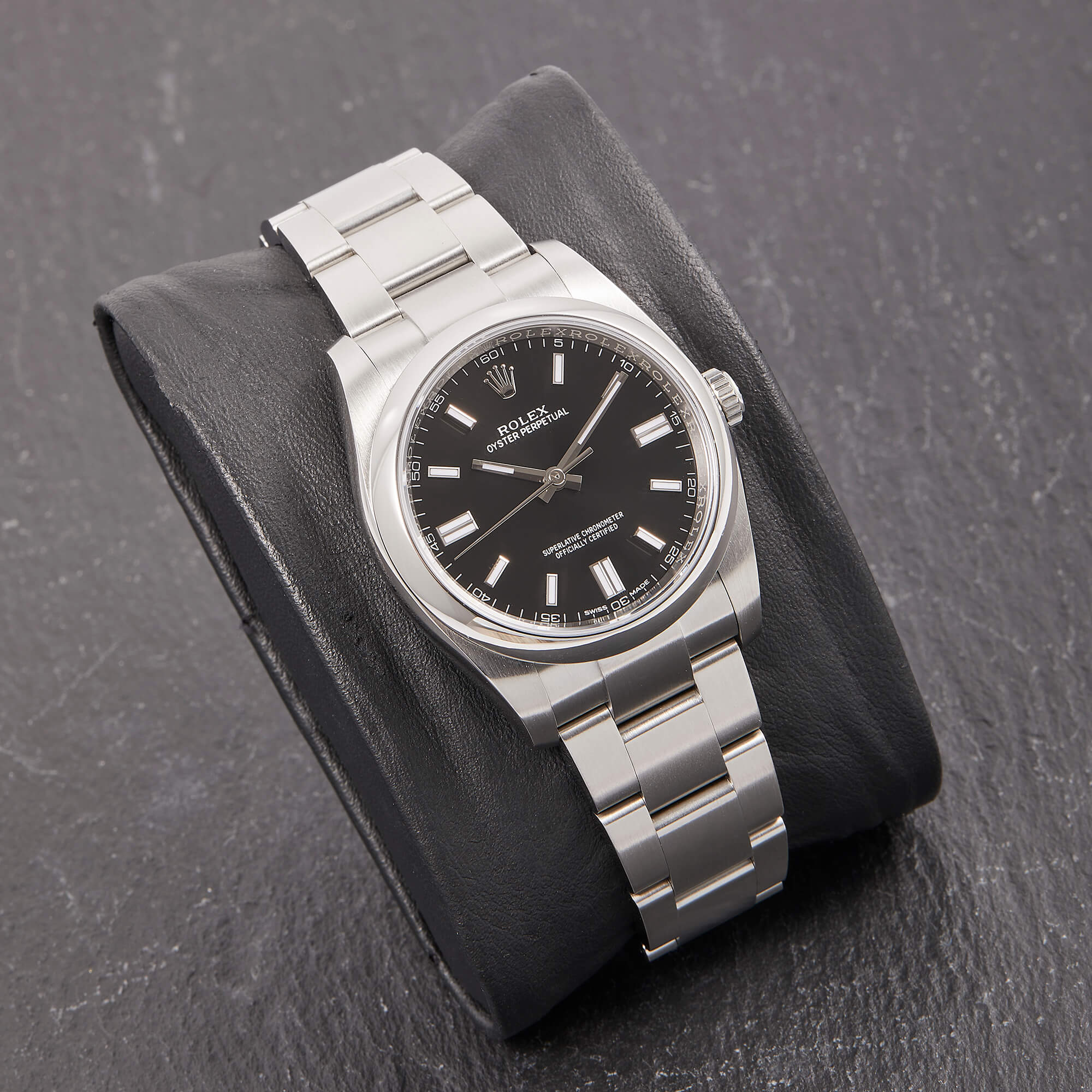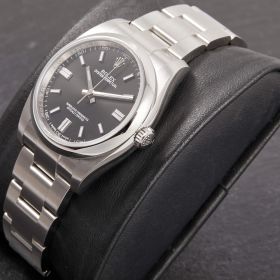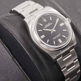 Die Rolex Oyster Perpetual 36 Ref. 116000 mit schwarzem Zifferblatt steht für zeitlose Eleganz und höchste Verarbeitungsqualität. Das klassische 36-mm-Edelstahlgehäuse, kombiniert mit dem schlichten Zifferblatt, macht diese Uhr zum vielseitigen Begleiter für jeden Anlass.- Durchmesser