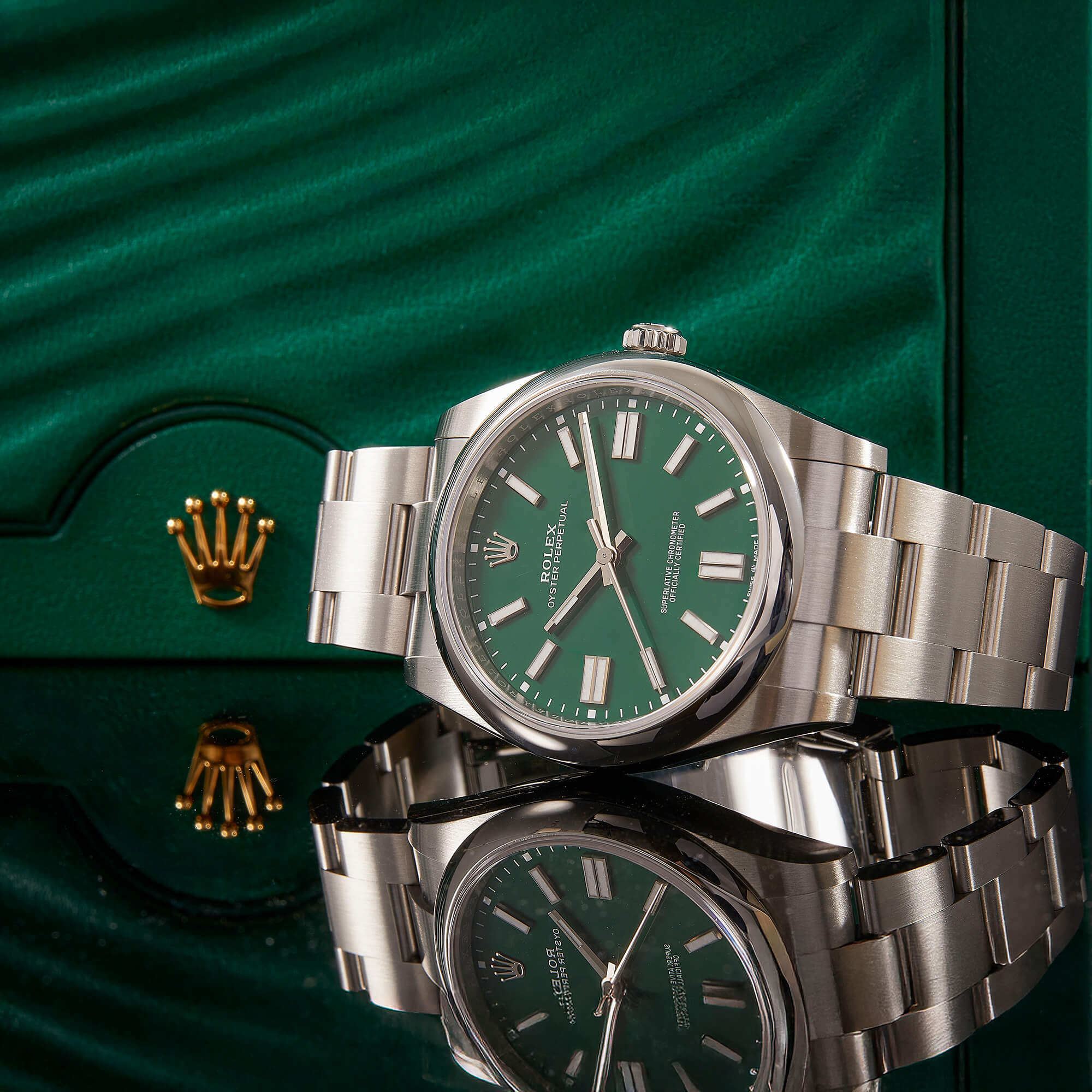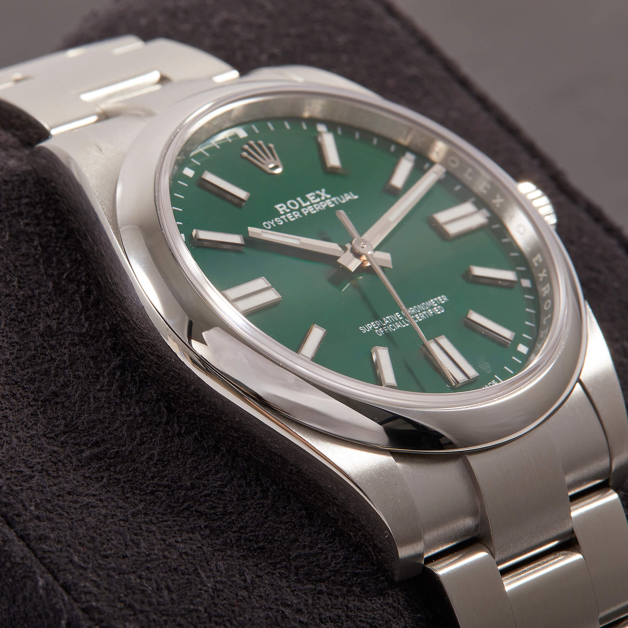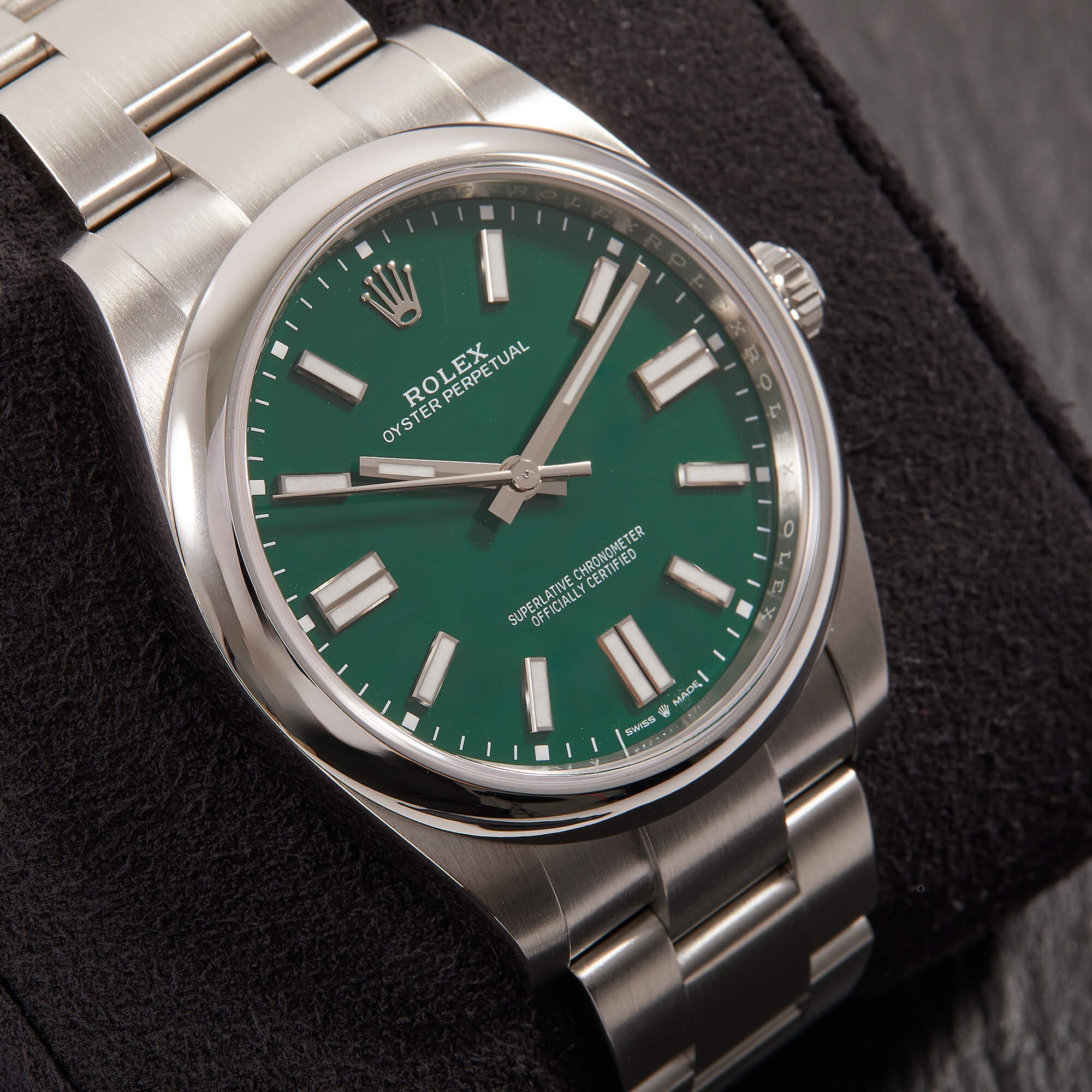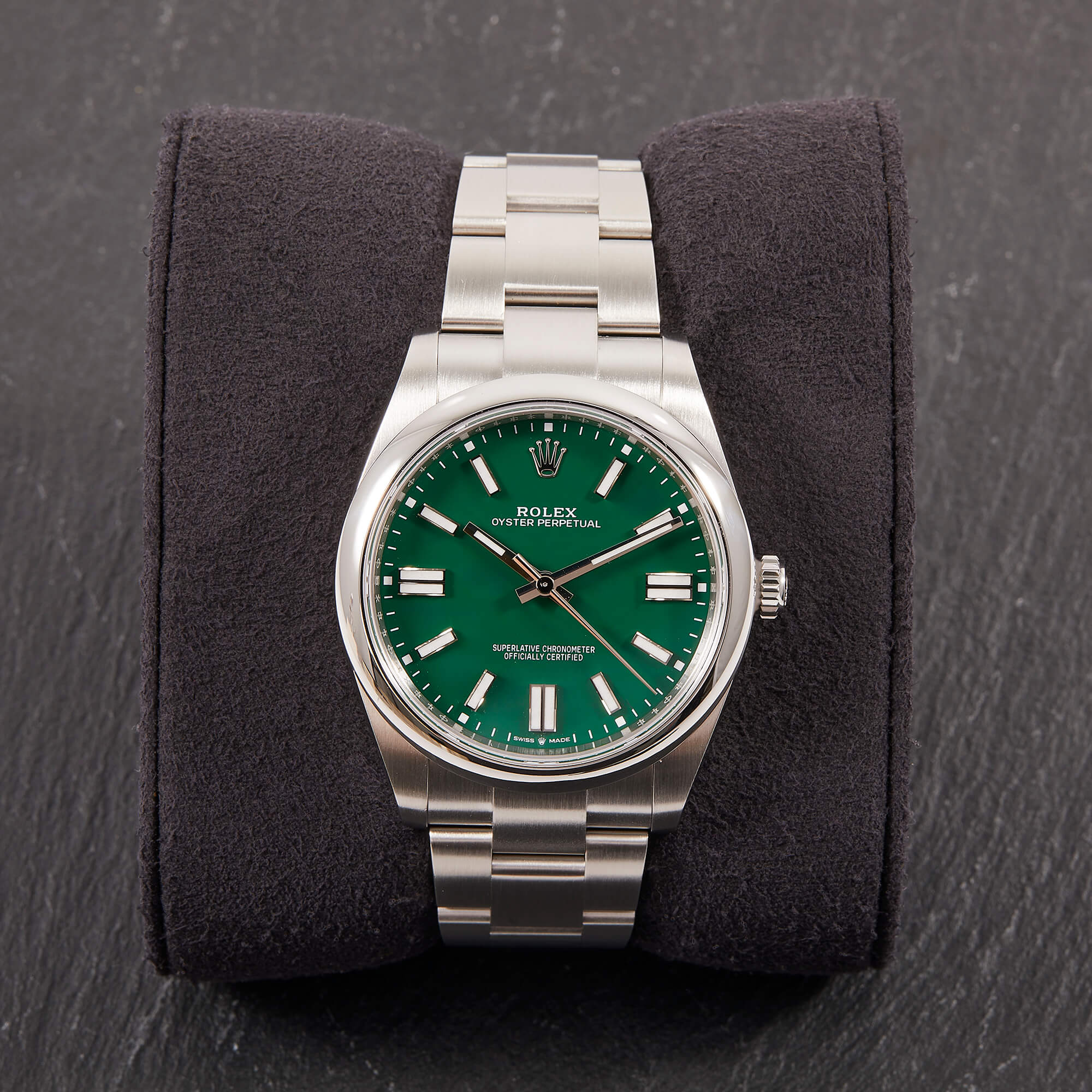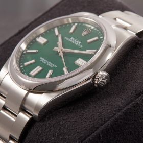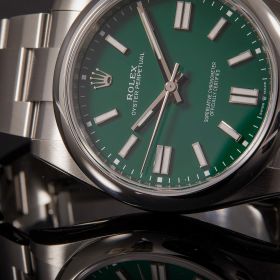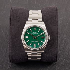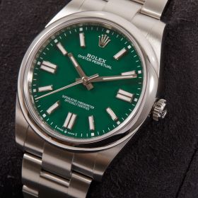 Die Rolex Oyster Perpetual 41, Referenz 124300, überzeugt mit ihrem markanten grünen Zifferblatt und dem zeitlosen Oyster-Design. Die Uhr kommt im Full Set – inklusive Box und Papieren – und befindet sich in ausgezeichnetem Zustand. Ein modernes Statement mit klassischer DNA – schlicht, hochwertig und begehrt.- Durchmesser