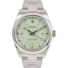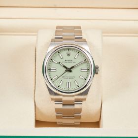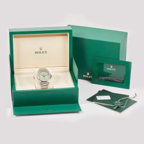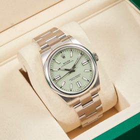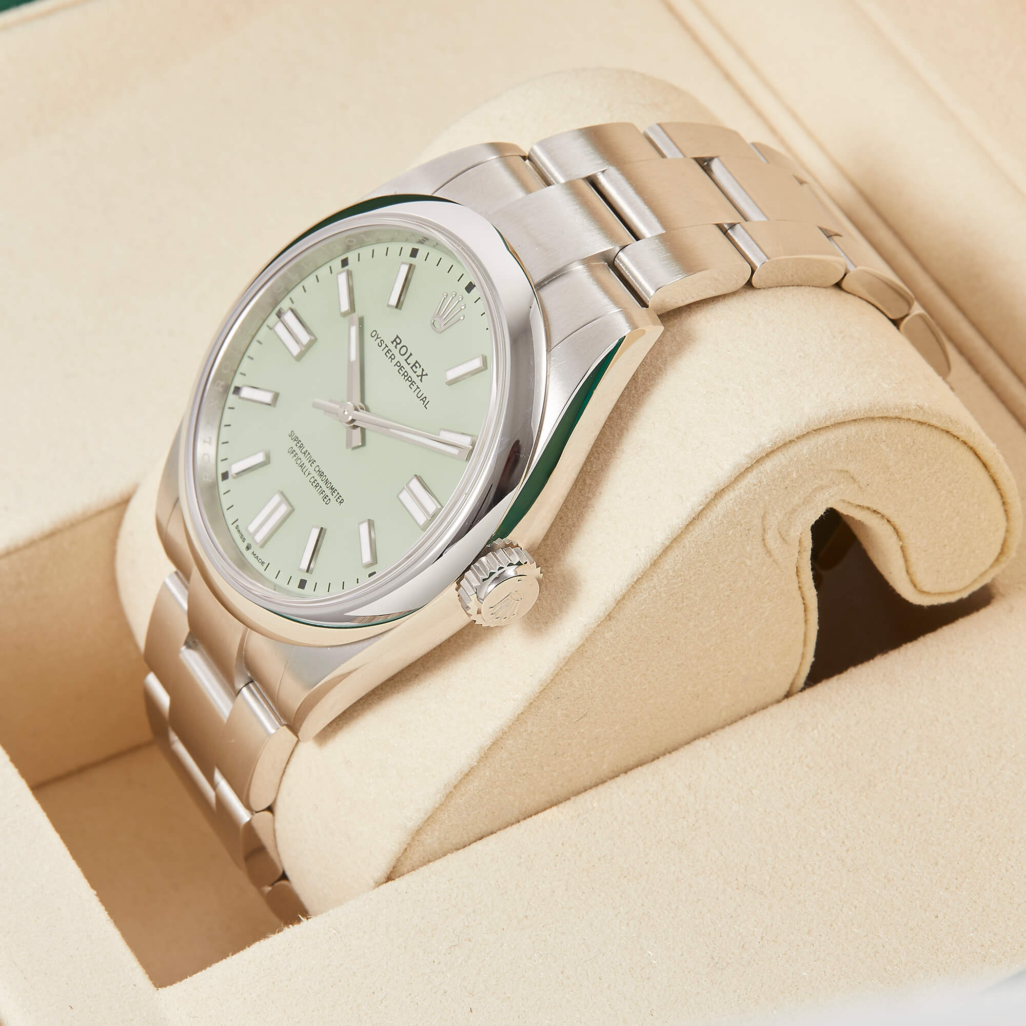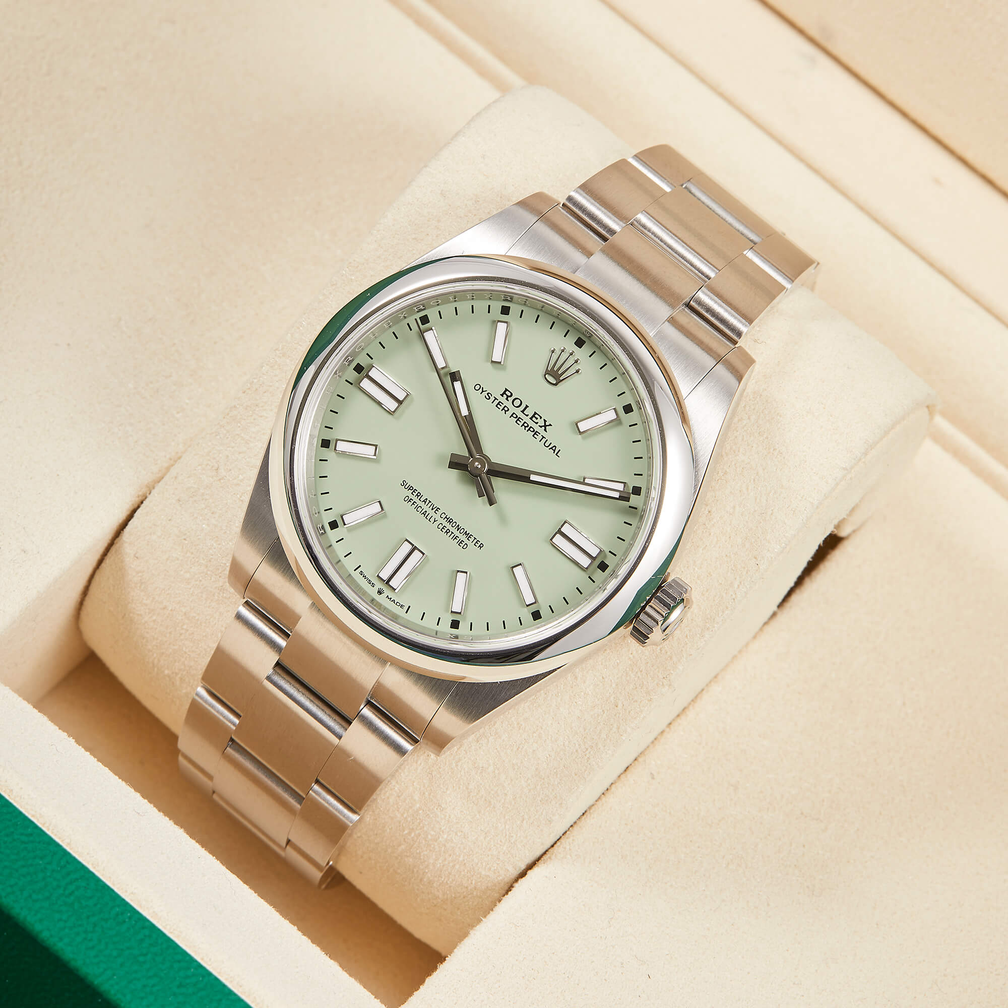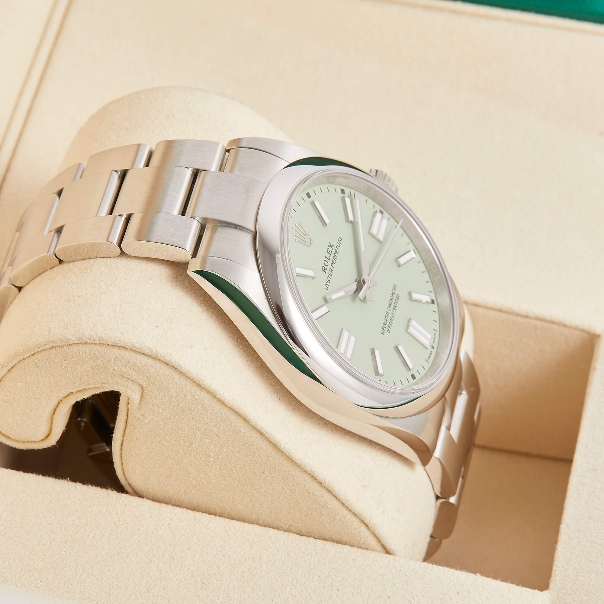Die Rolex Oyster Perpetual 41 Referenz 134300 überzeugt mit ihrem neu vorgestellten pistazienfarbenen Zifferblatt und modernem Design. Es handelt sich um das neueste Modell, ungetragen und vollständig mit Box und Papieren aus Dezember 2025. Eine zeitlose Rolex in makellosem Zustand.- Durchmesser