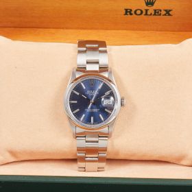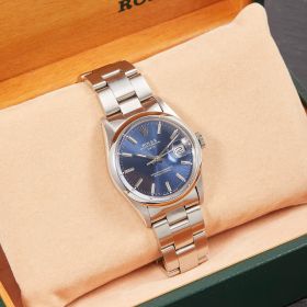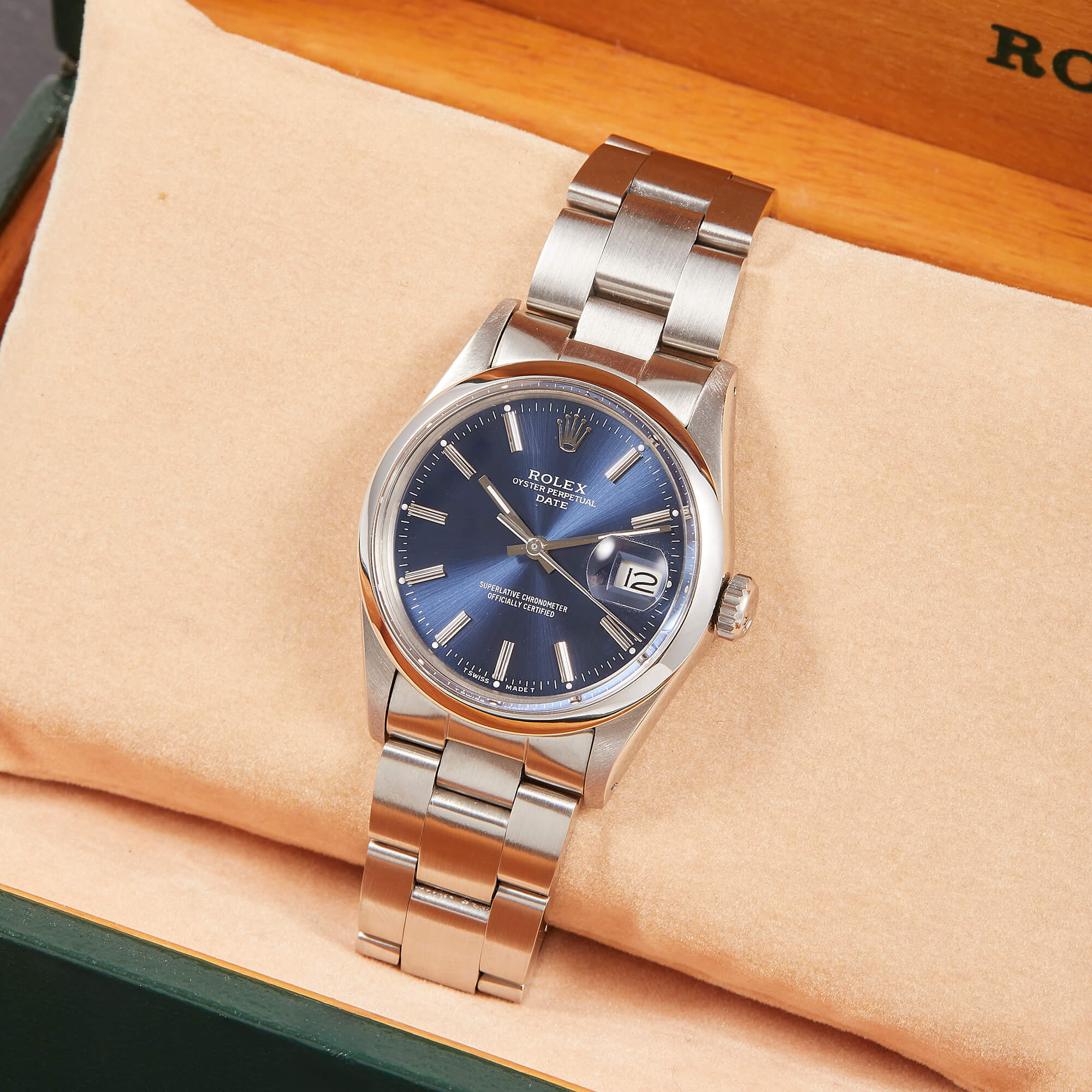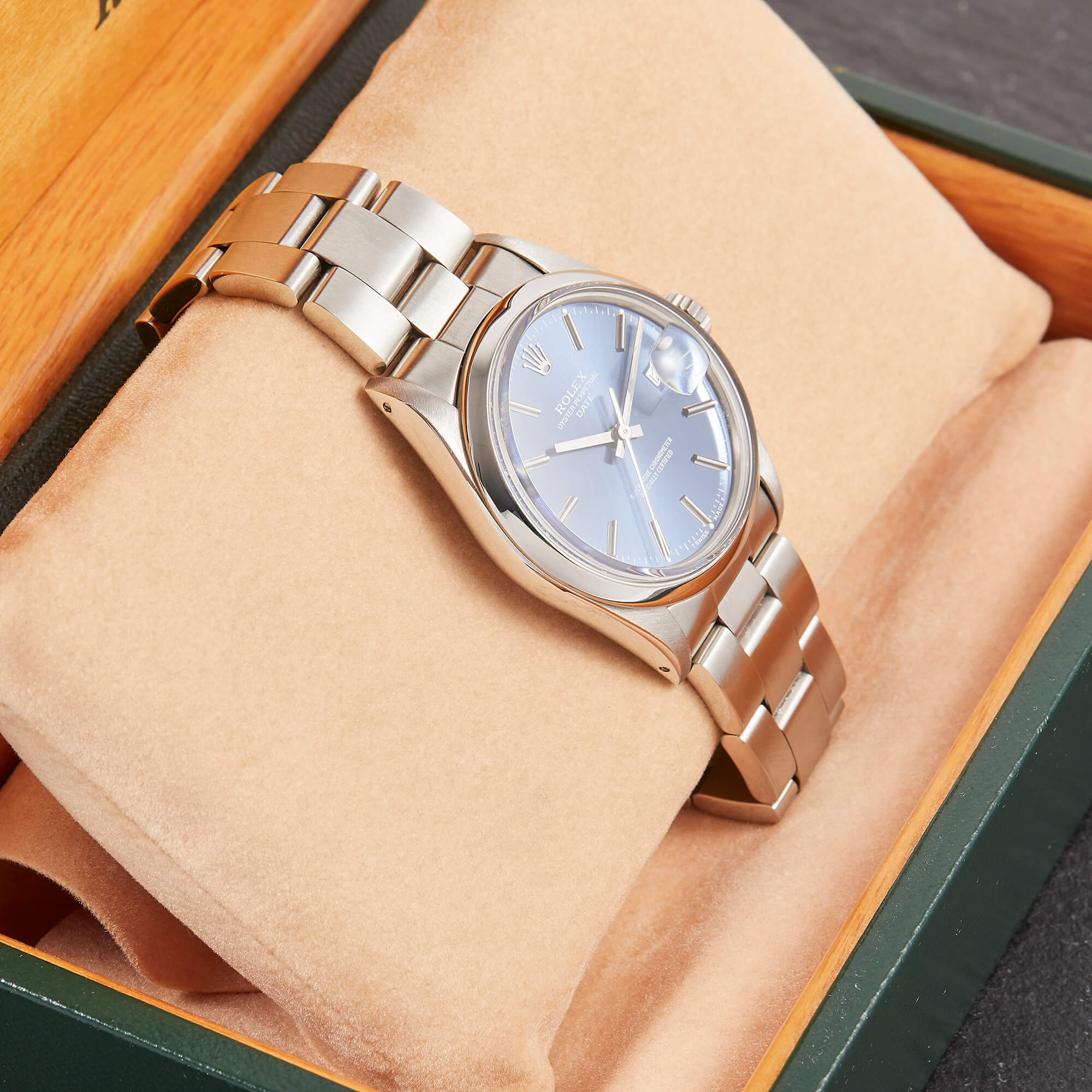 Die Rolex Oyster Perpetual Date 34 mm Referenz 15000 besticht durch ihr klassisches blaues Zifferblatt und das zeitlose Oysterband. Sie vereint elegante Schlichtheit mit zuverlässiger Automatikfunktion und ist ein stilvoller Begleiter für jeden Tag.- Durchmesser