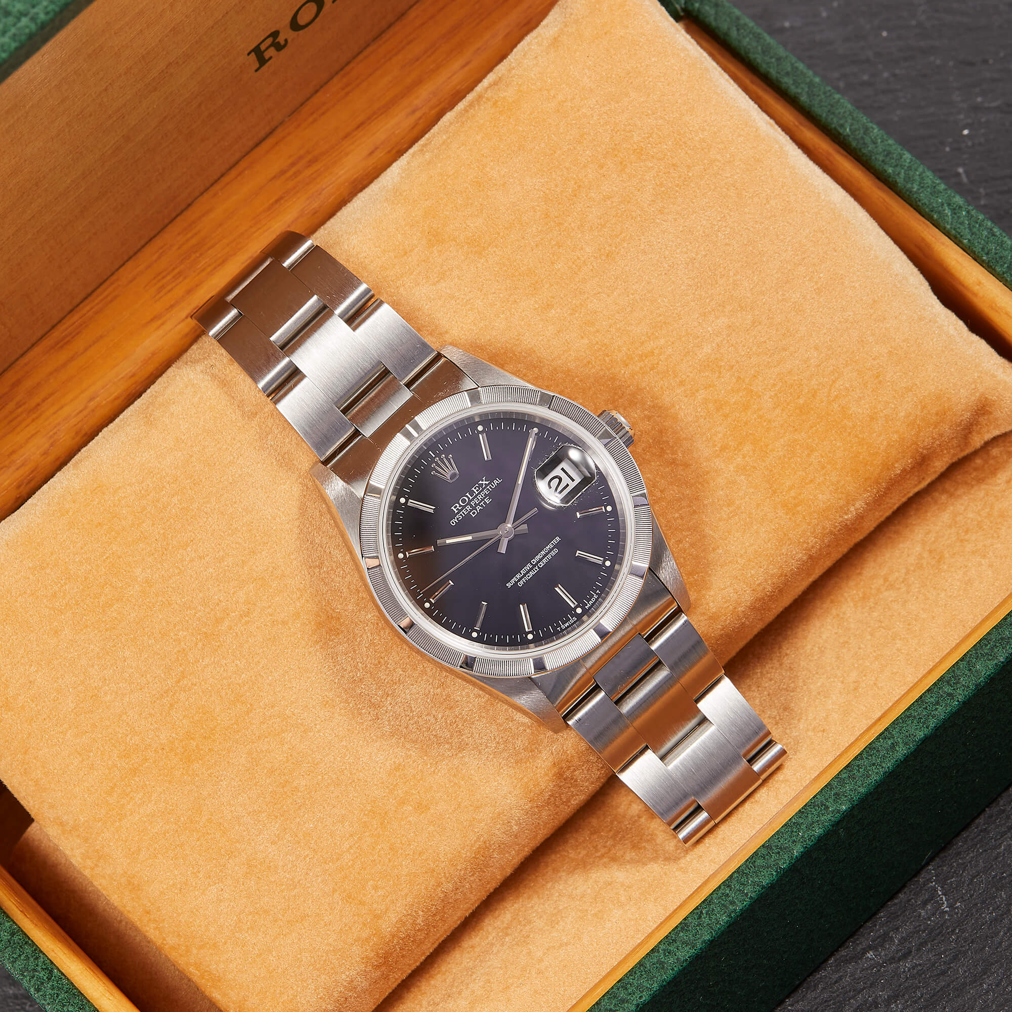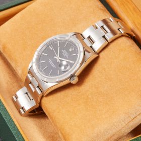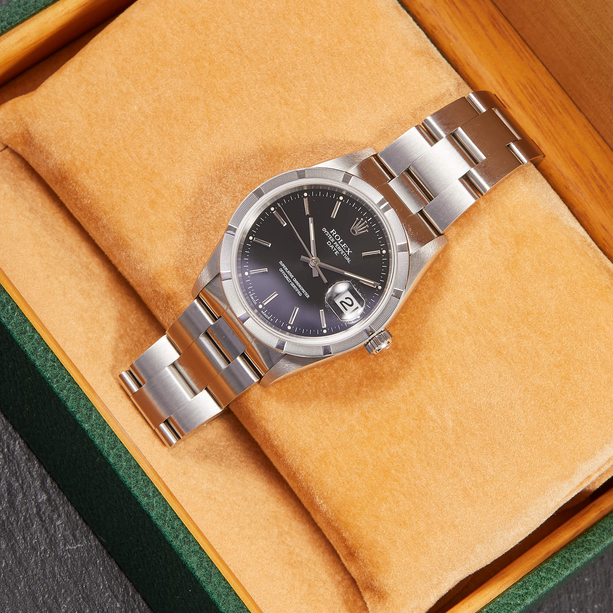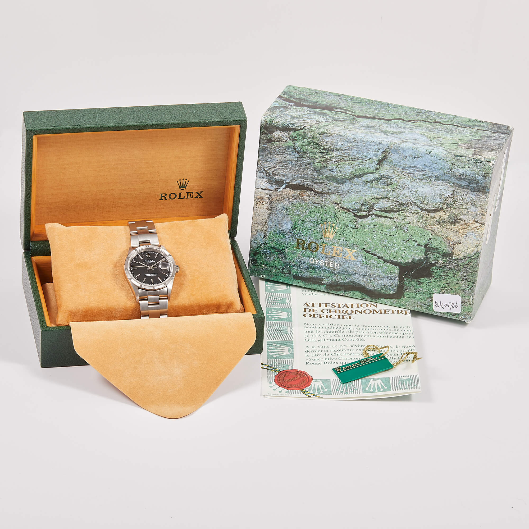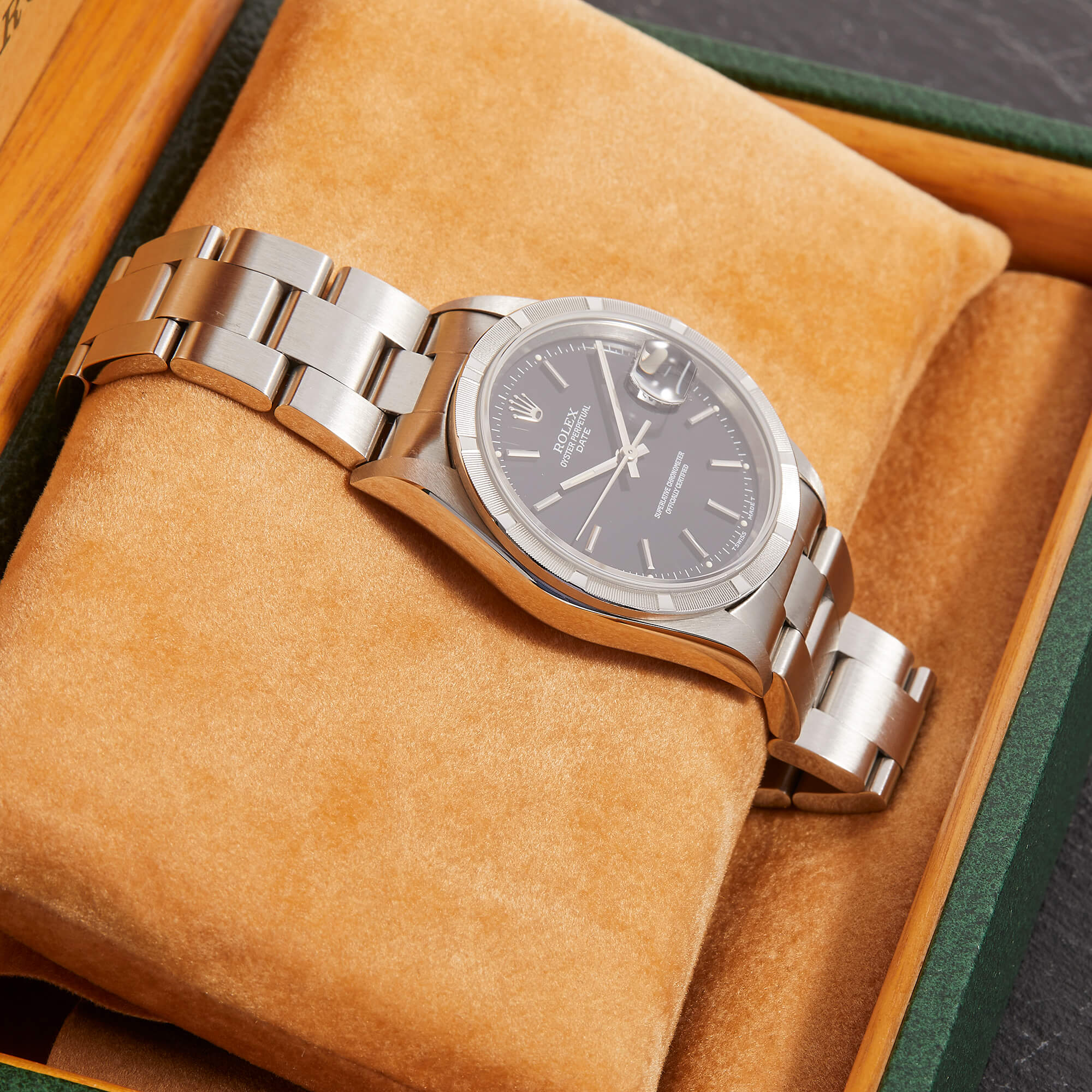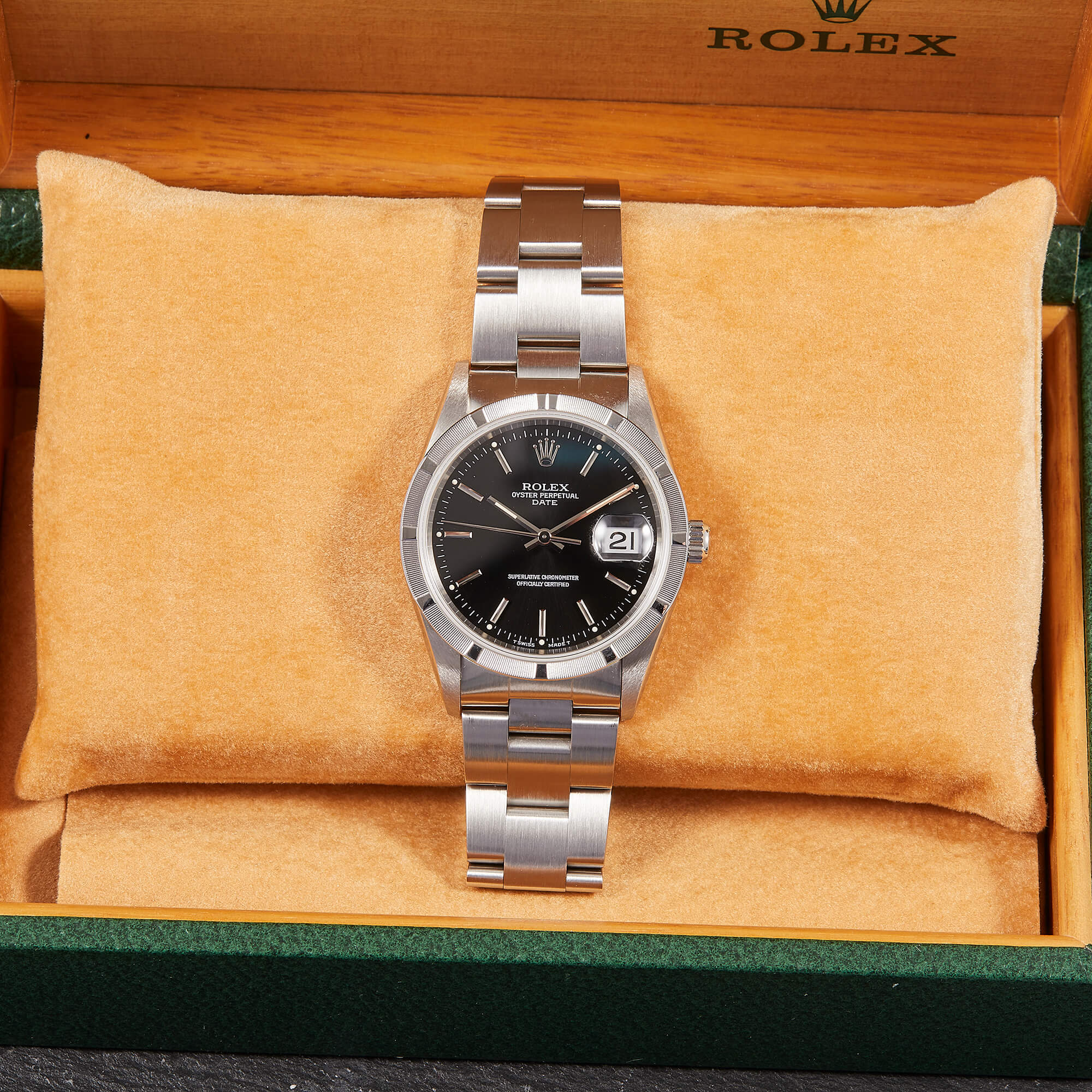 Rolex Oyster Perpetual Date 34, Referenz 15210 im Fullset, sowie mit dem klassichen schwarzen Zifferblatt. Das Modell verbindet klassische Proportionen und steht exemplarisch für die zeitlose Eleganz der Oyster-Perpetual-Linie.- Durchmesser