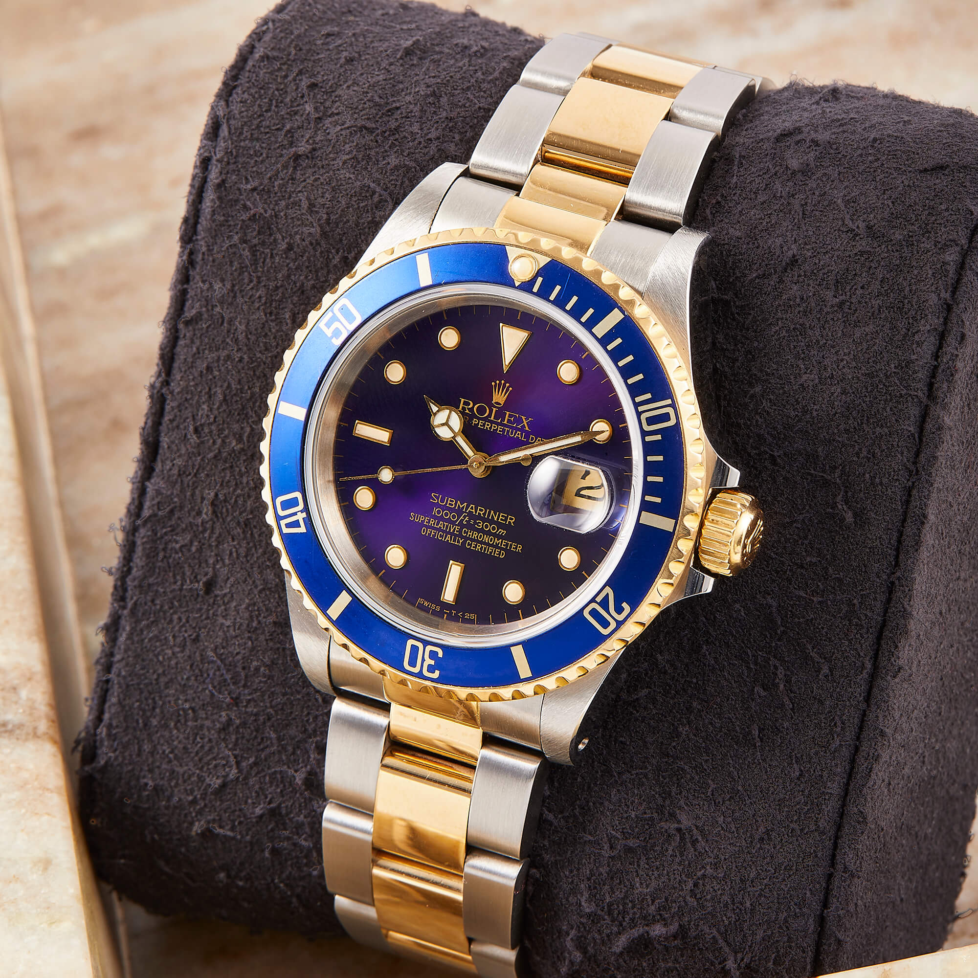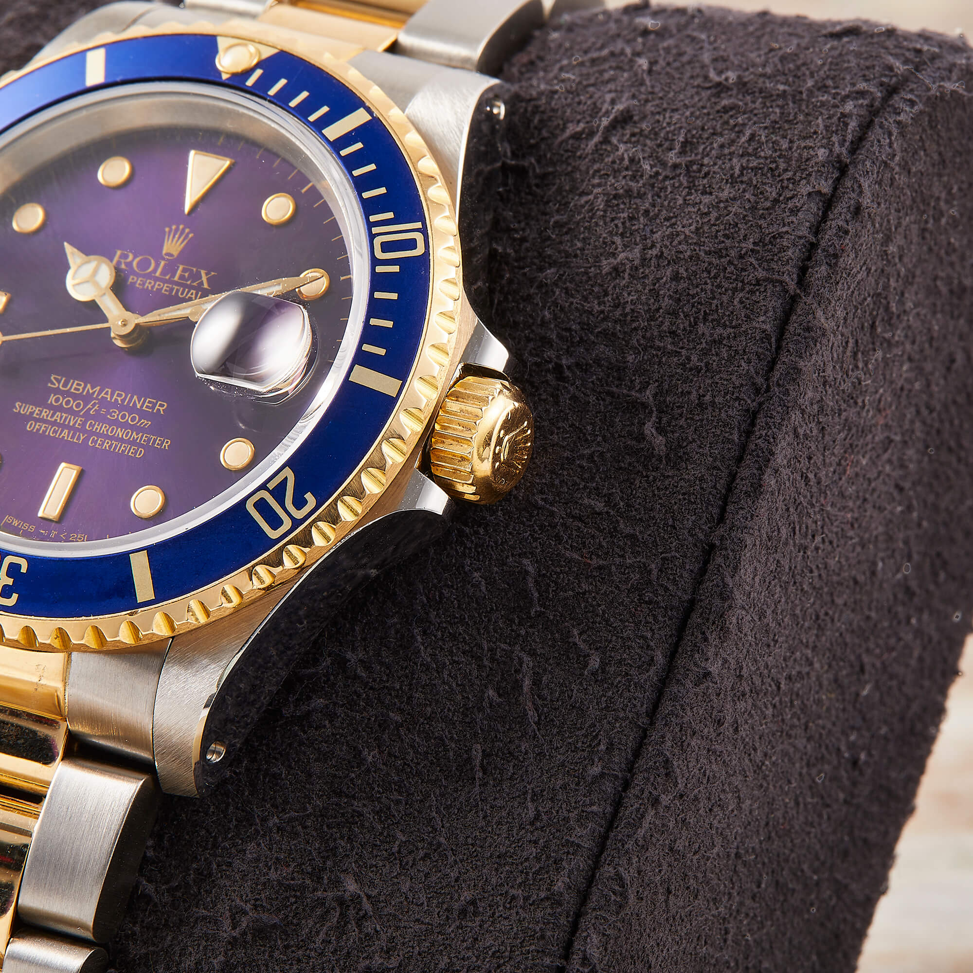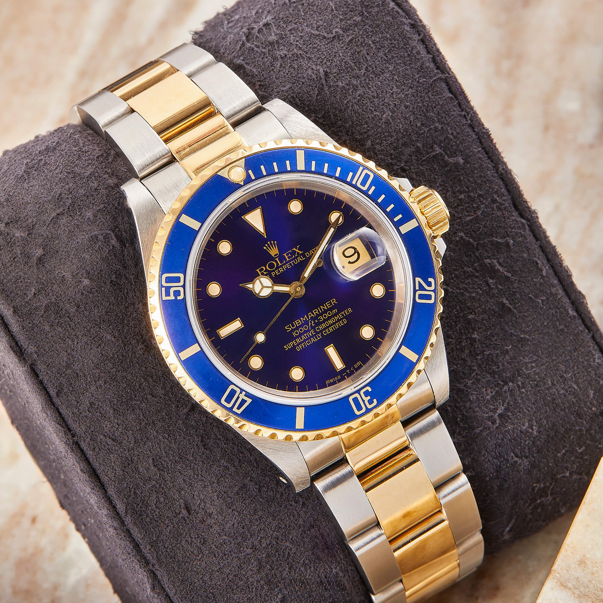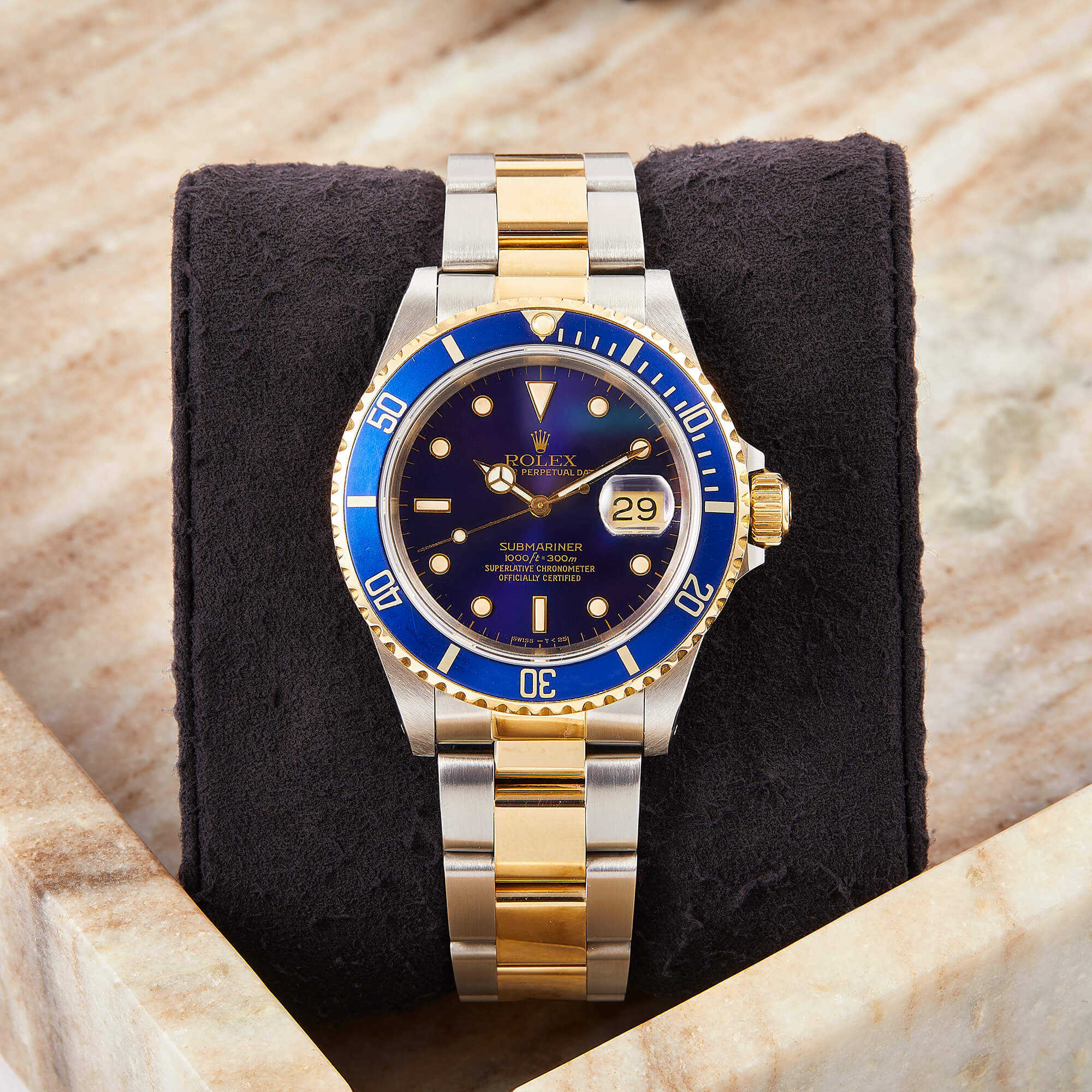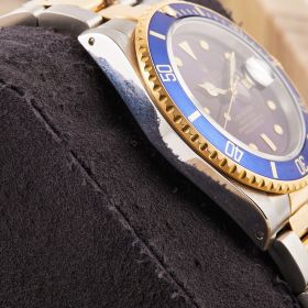Die Rolex Submariner Date Ref. 16613 ist ein legendäres Modell, das Sportlichkeit und Luxus meisterhaft vereint. Mit ihrem ikonischen Edelstahl- und Gelbgold-Gehäuse und der blauen Lünette zieht sie alle Blicke auf sich. Das klare Zifferblat hat sich leicht violett verfärbt. Die Uhr wird mit originalen Garantieunterlagen geliefert.- Durchmesser