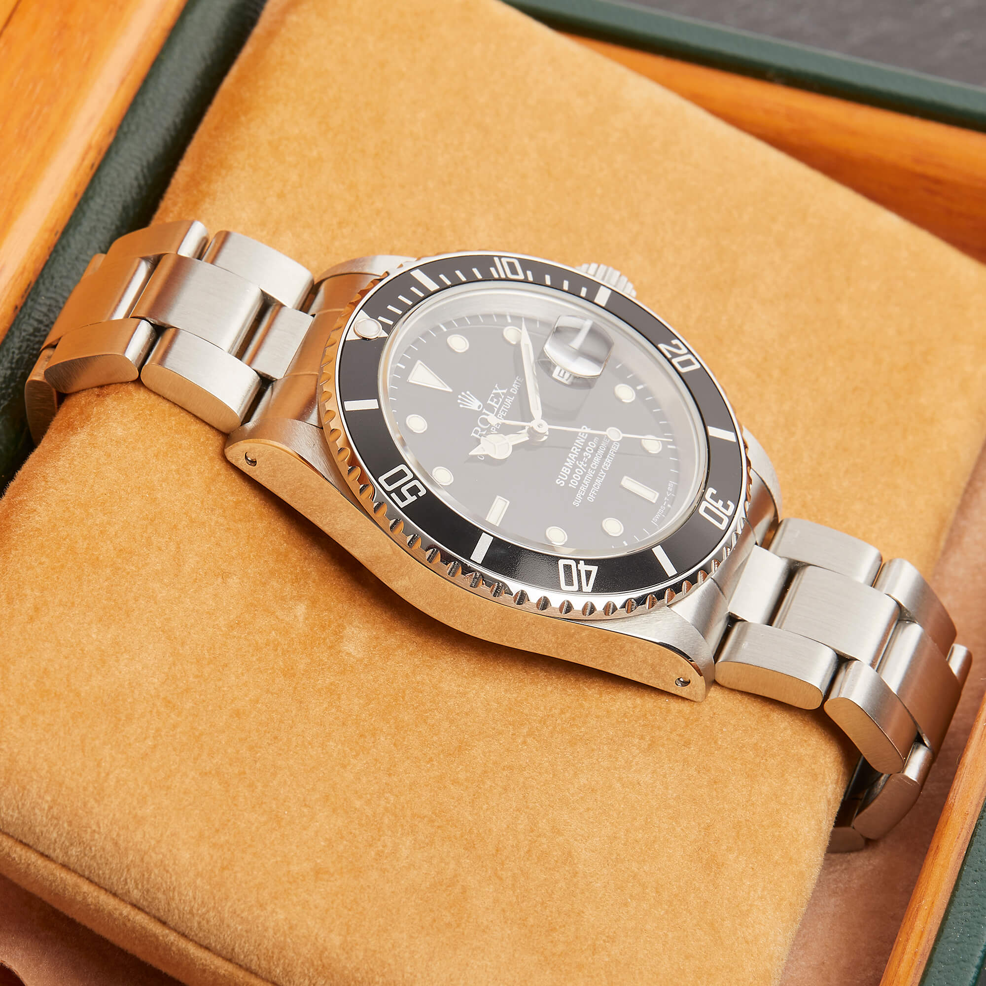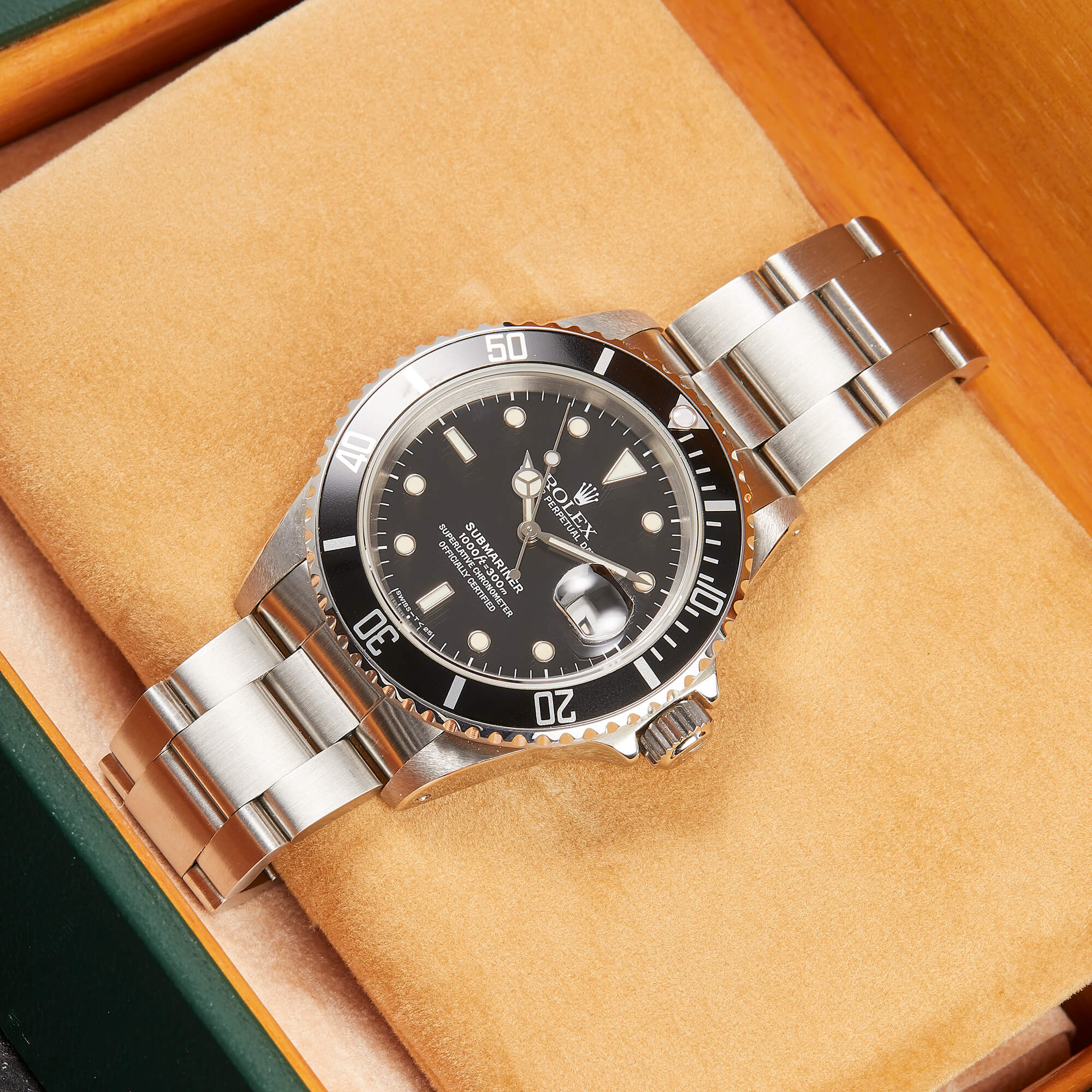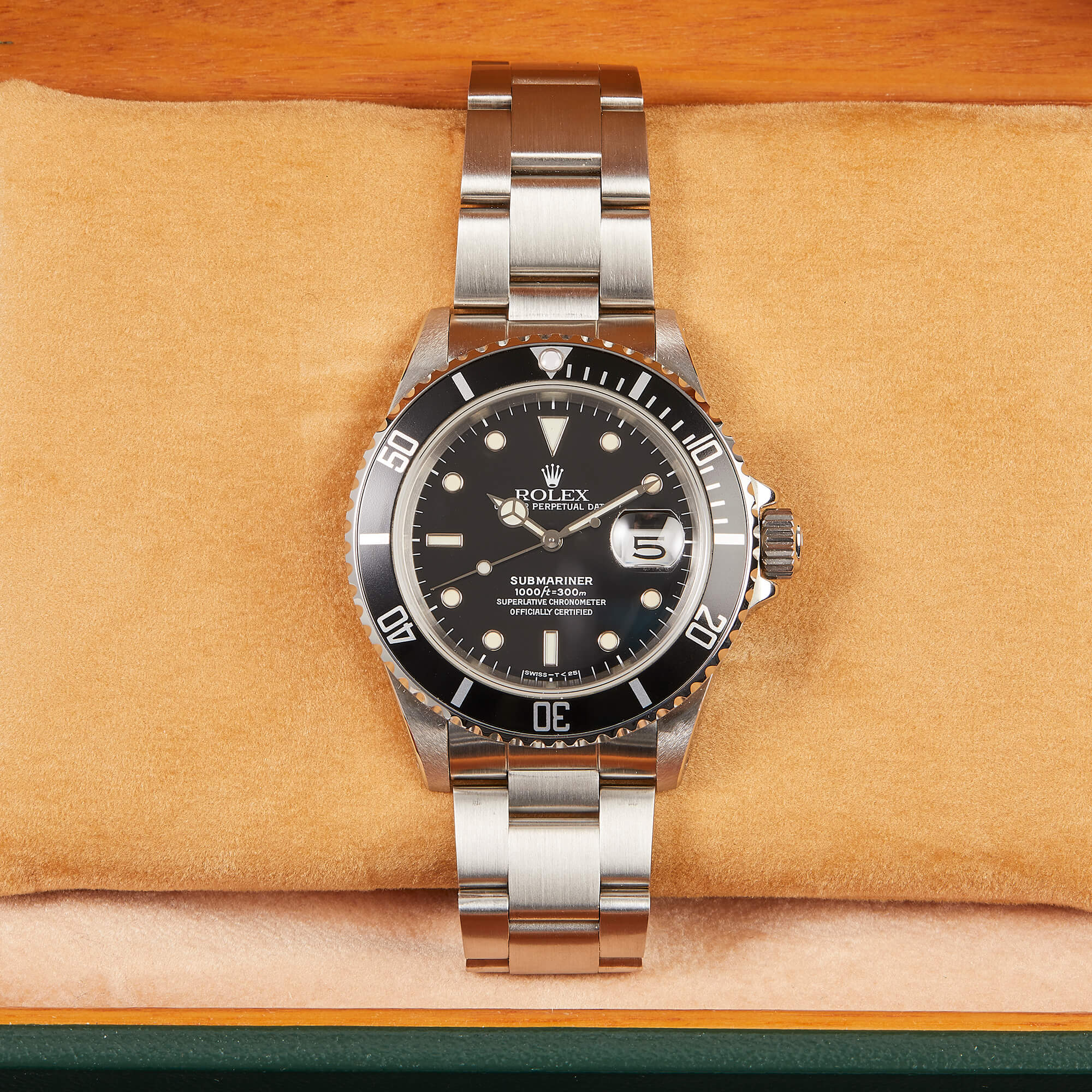 Die Rolex Submariner Referenz 16610LN ist ein puristischer Taucherklassiker mit 40 mm Edelstahlgehäuse und markanter Drehlünette. Angetrieben vom robusten Automatikwerk Kaliber 3130, bietet sie präzise Zeitmessung mit Datumskomplikation. Die 16610LN vereint ikonisches Design mit kompromissloser Funktionalität.- Durchmesser