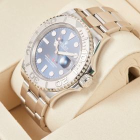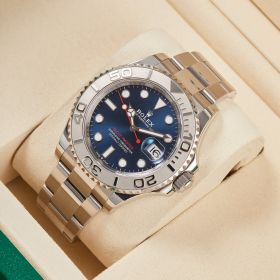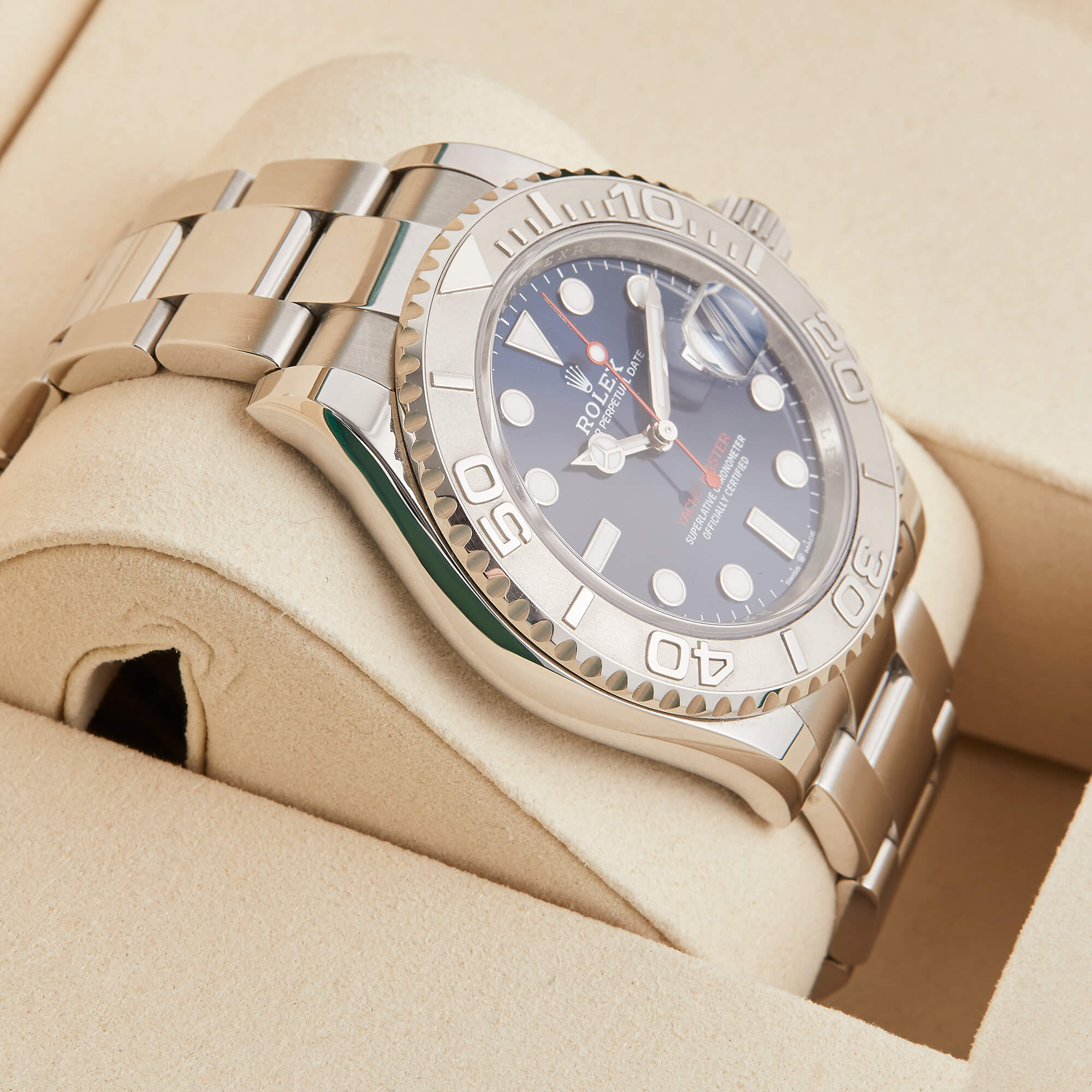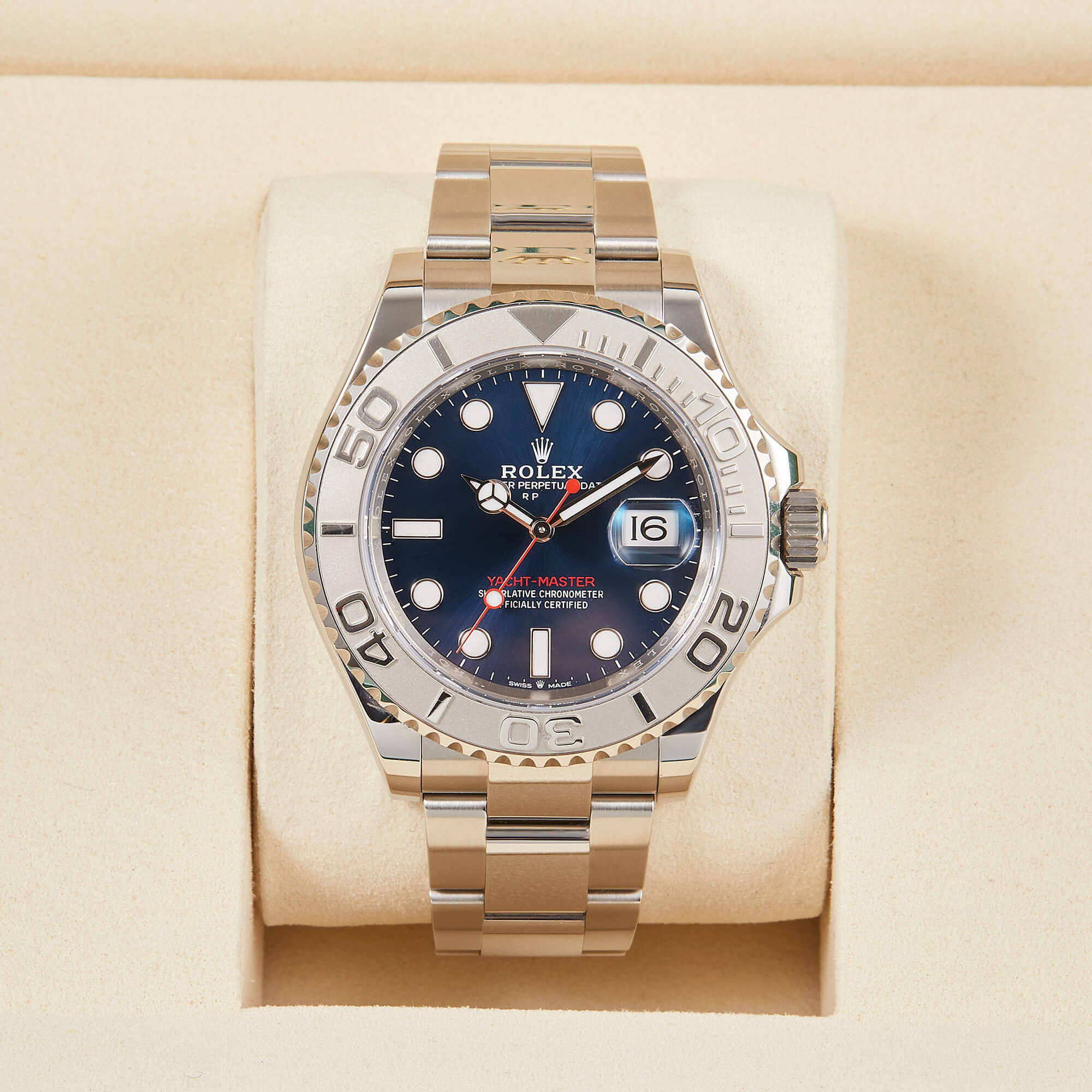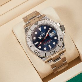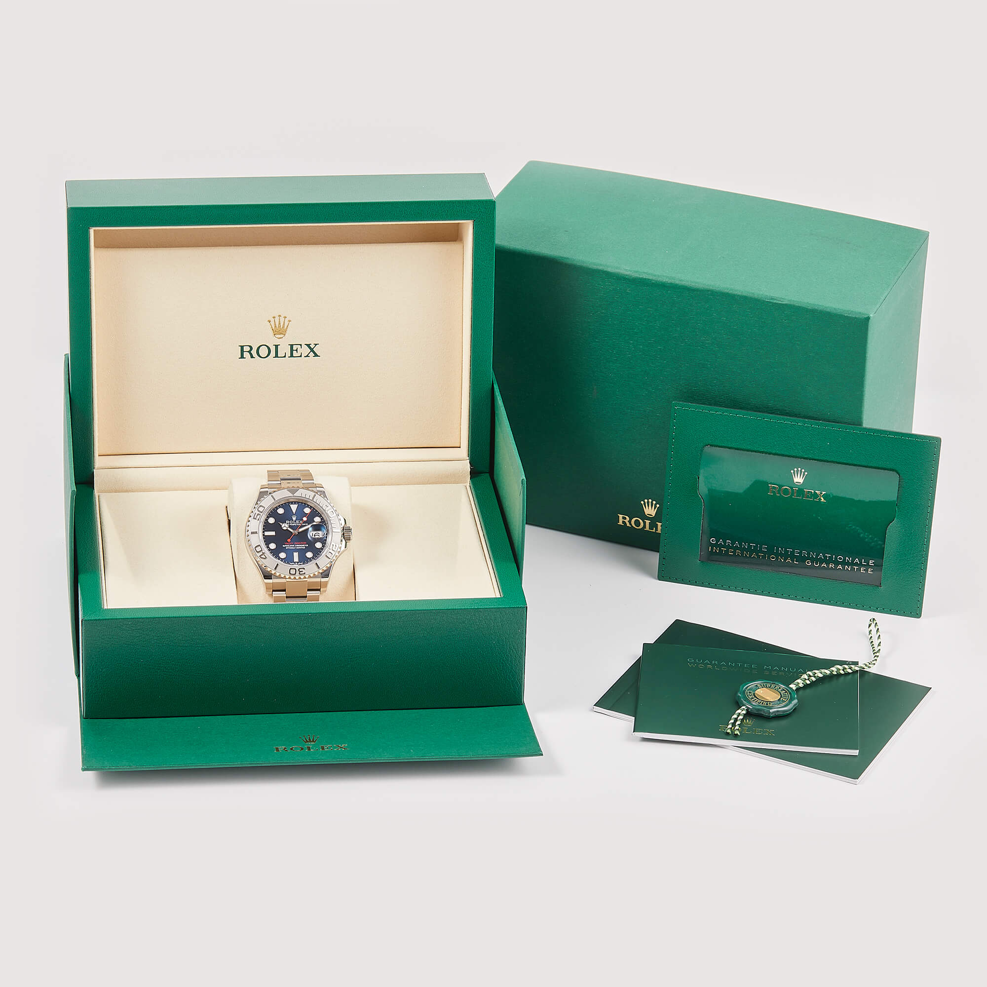 Die Rolex Yachtmaster 126622 ist ein wahres Meisterwerk der Luxusuhrenwelt, das sich durch eine edle Kombination aus Platinlünette und Edelstahlgehäuse auszeichnet. Das blaue Zifferblatt verleiht der Uhr eine raffinierte Eleganz und eine besondere Tiefe.- Durchmesser