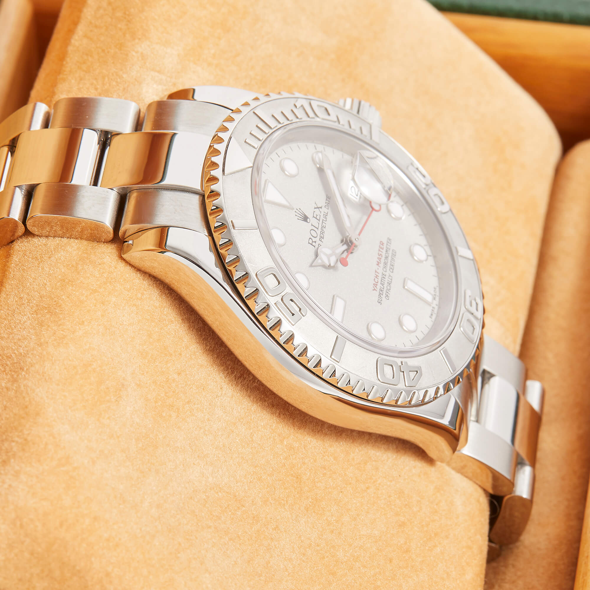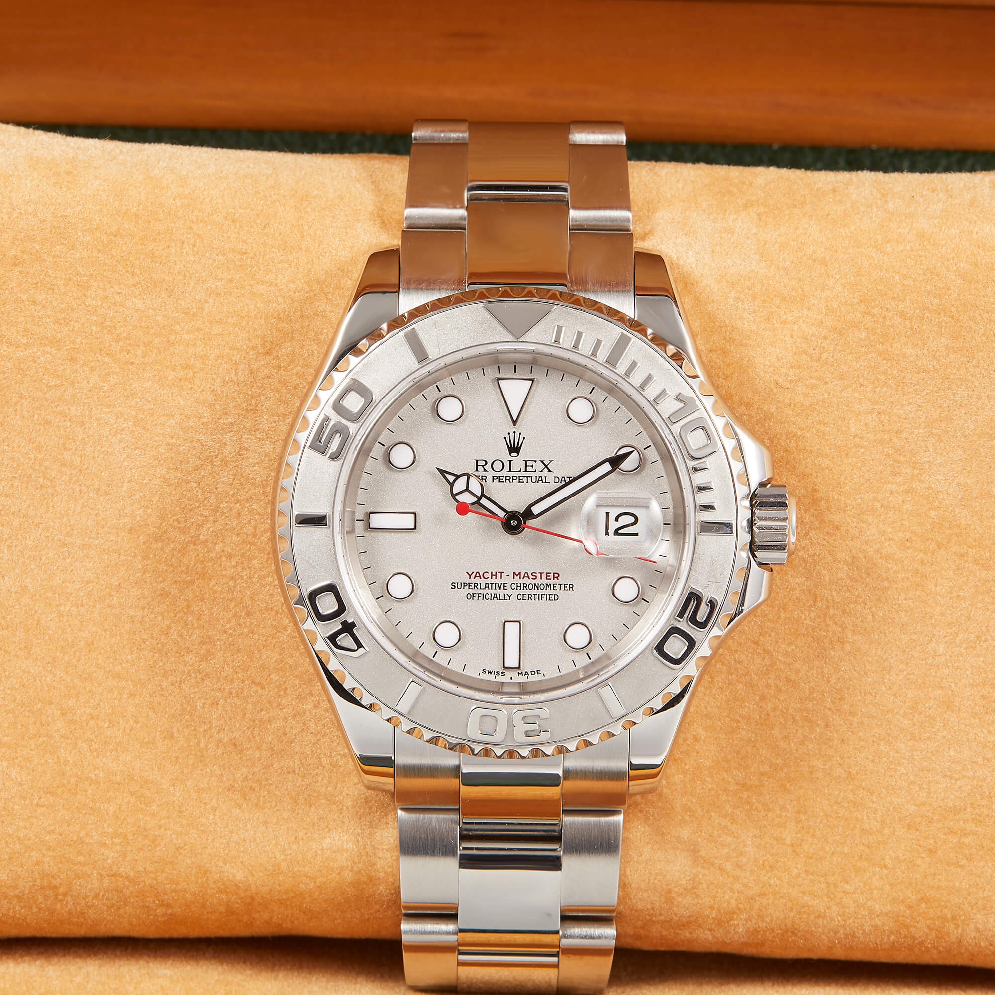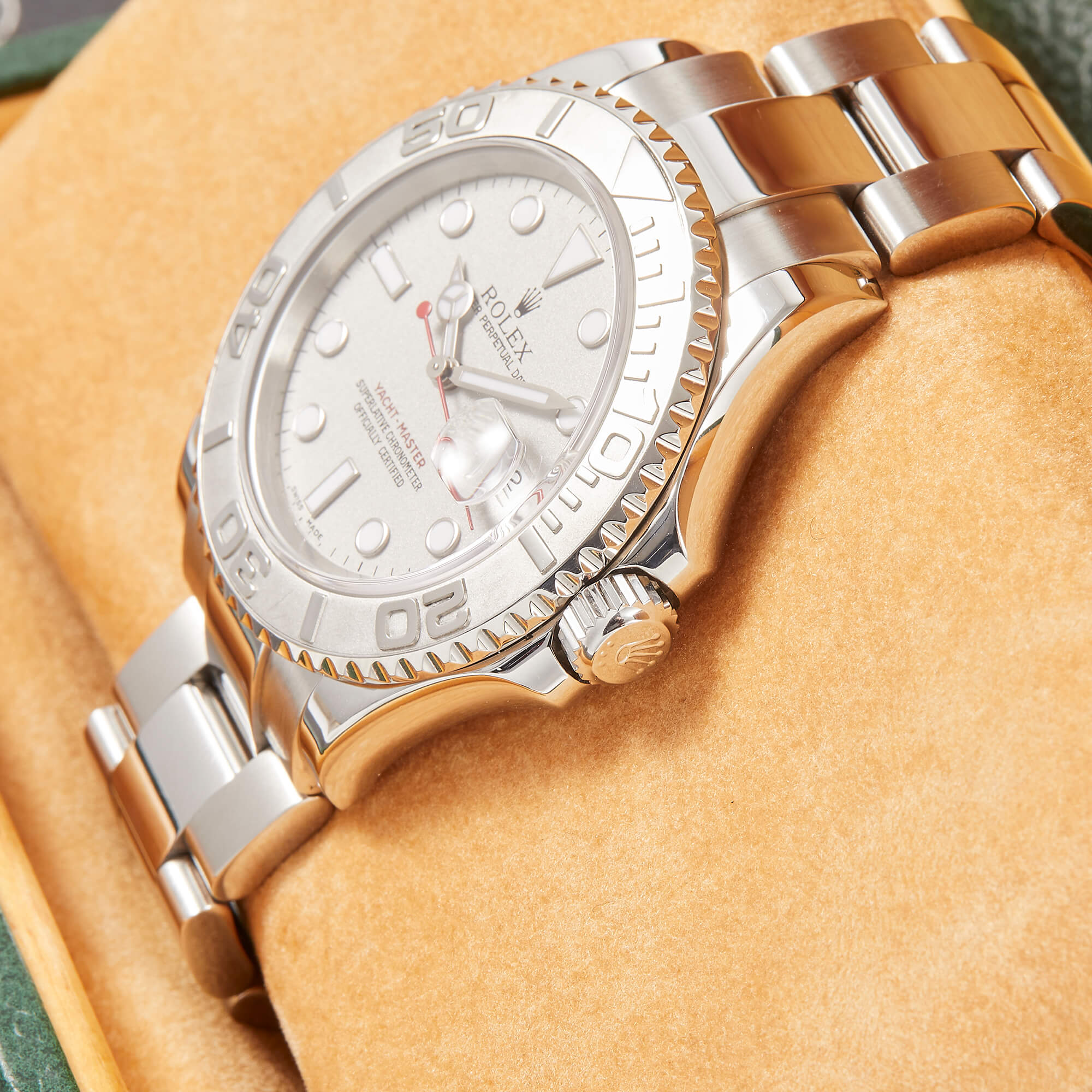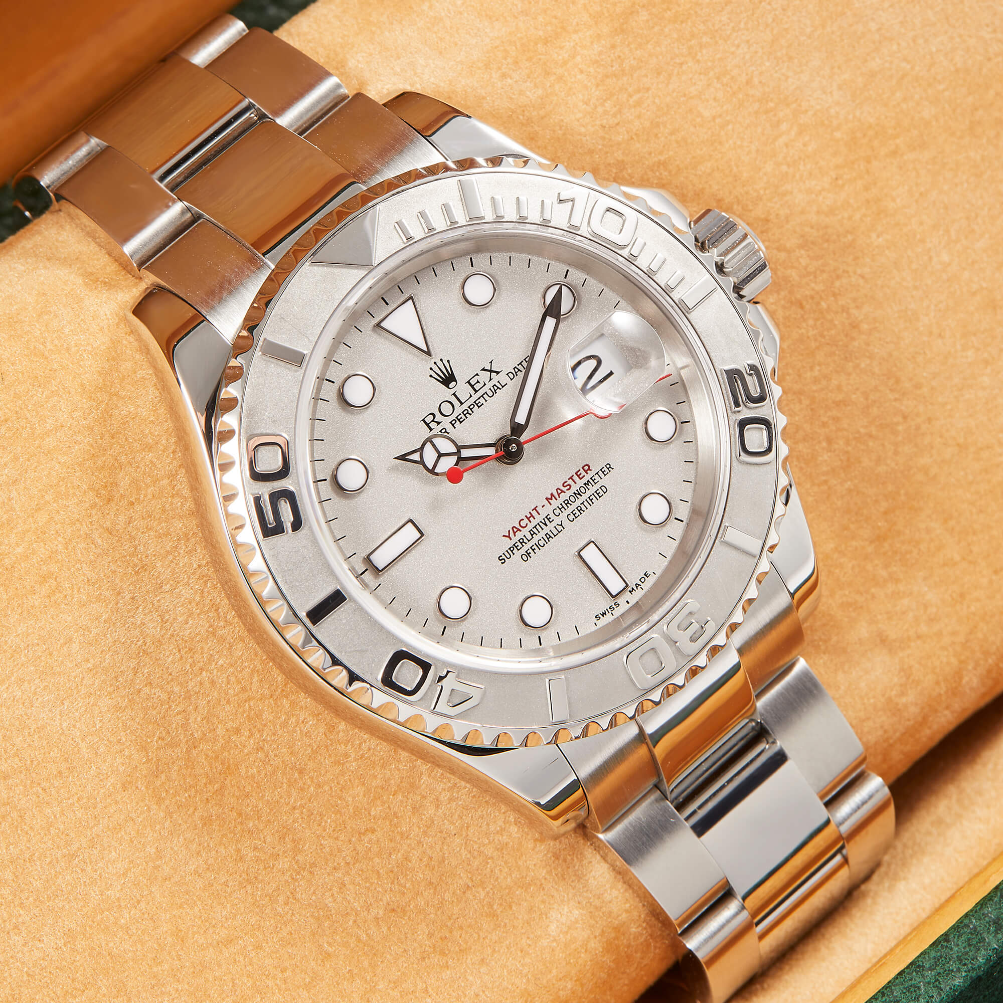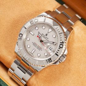 Die Rolex Yacht-Master 16622 ist ein wahres Meisterwerk der Luxusuhrenwelt, das sich durch eine edle Kombination aus Platinlünette und Edelstahlgehäuse auszeichnet. Das silberne Platin-Zifferblatt verleiht der Uhr eine raffinierte Eleganz und eine besondere Tiefe.- Durchmesser
