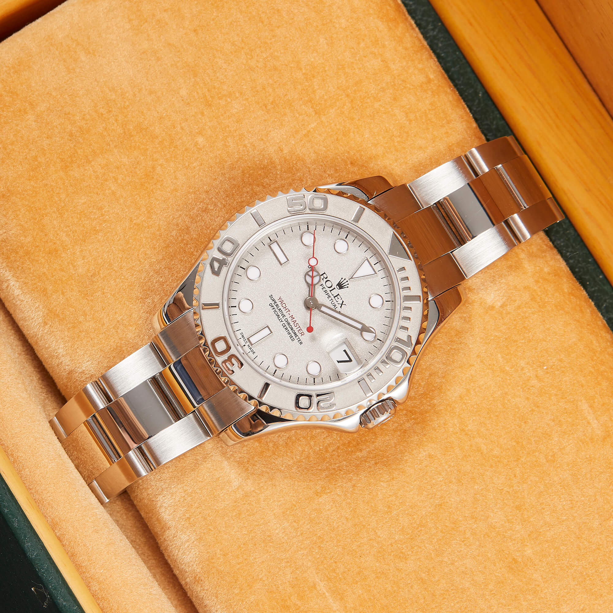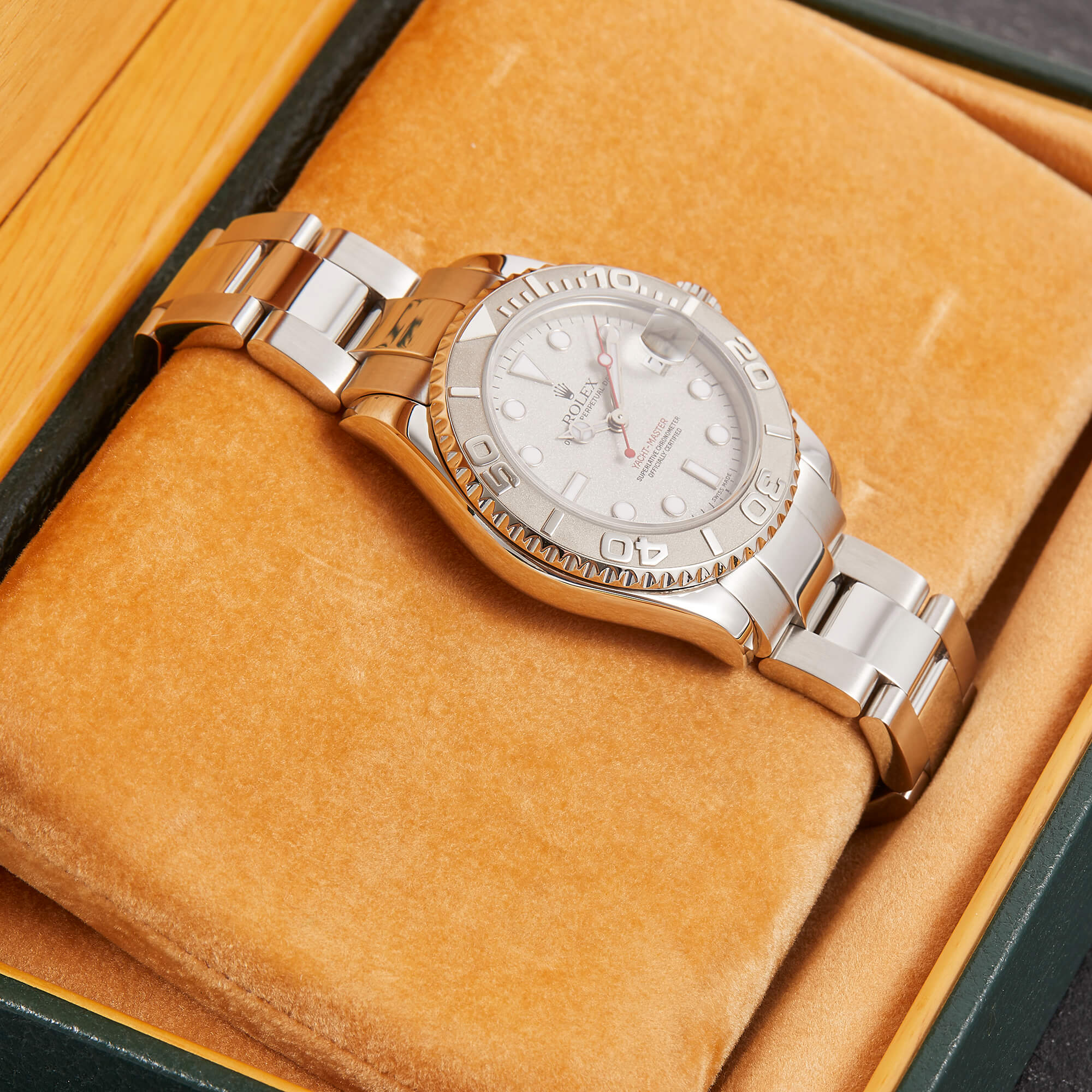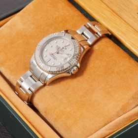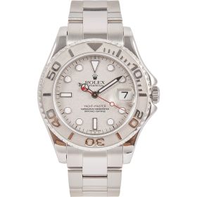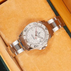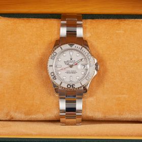 Die Rolex Yacht-Master 168622 ist ein wahres Meisterwerk der Luxusuhrenwelt, das sich durch eine edle Kombination aus Platinlünette und Edelstahlgehäuse auszeichnet. Das silberne Platin-Zifferblatt verleiht der Uhr eine raffinierte Eleganz und eine besondere Tiefe.- Durchmesser