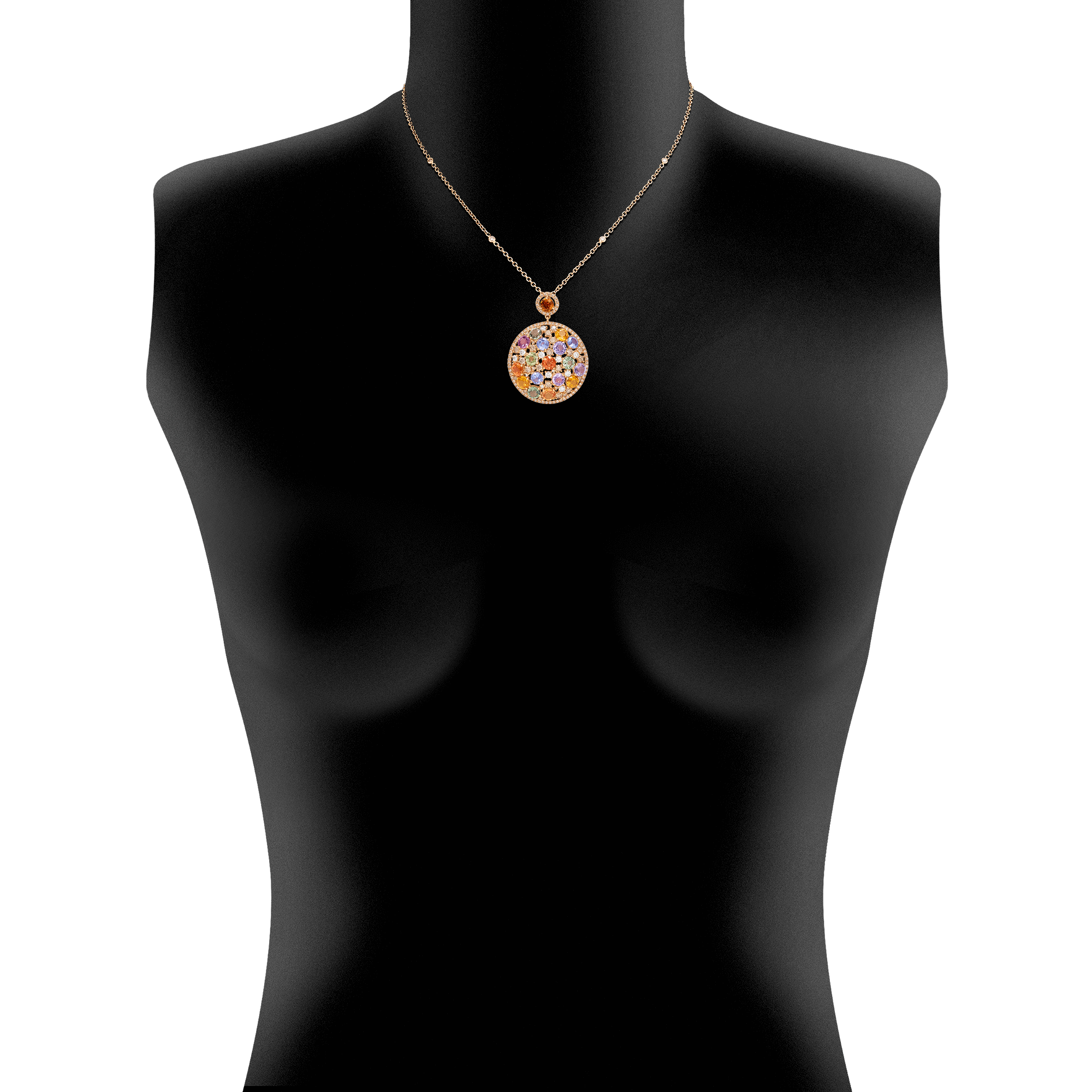 Collier aus 750/- Rotgold mit farbigen Saphiren (11,19 ct.), braunen Diamanten (1,90 ct.) und Brillanten (0,57 ct.)Produktspezifikationen