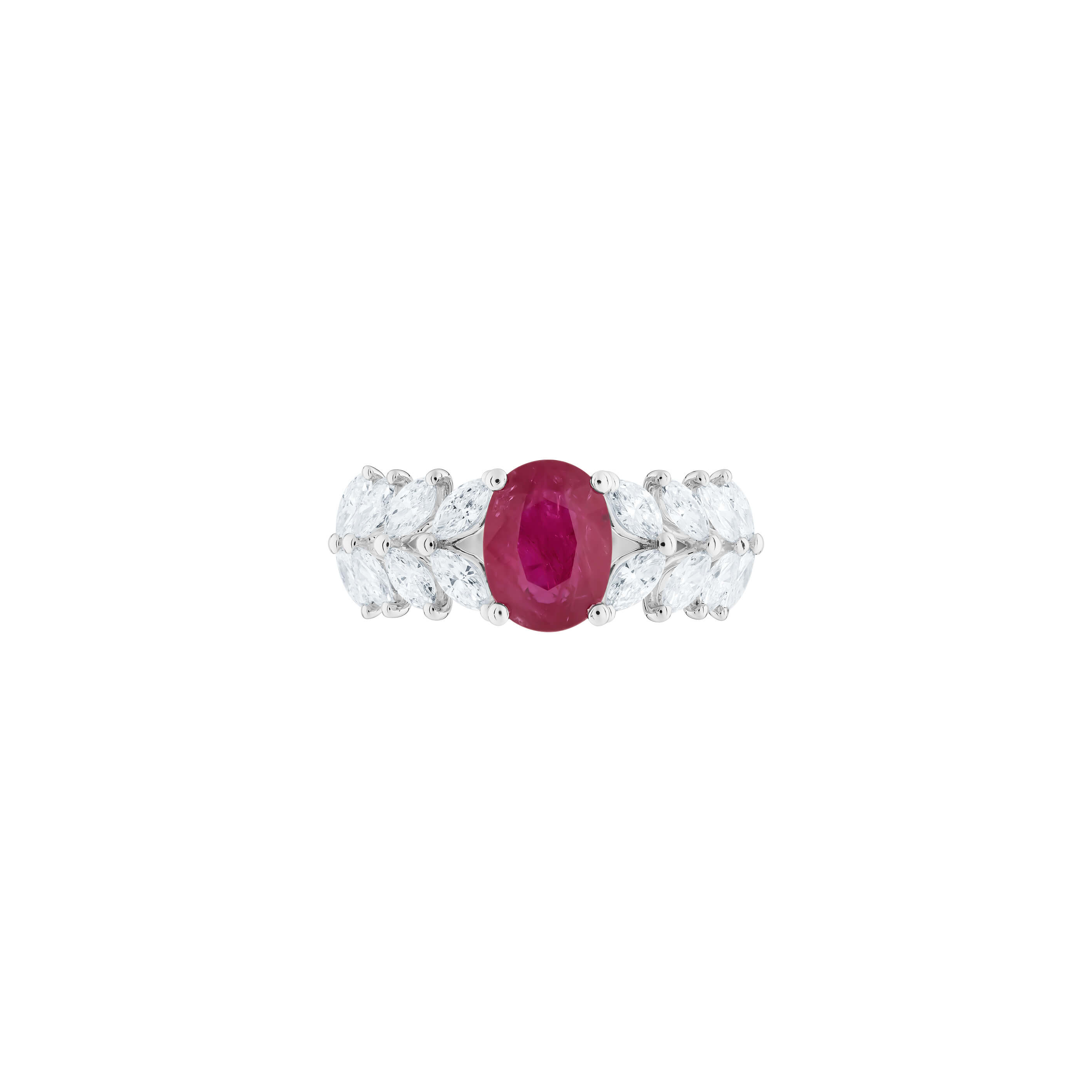 Ring aus 750/- Weißgold mit einem ovalen Rubin (1,54 ct.) und Diamanten im Navette-Schliff (0,87 ct.)Produktspezifikationen