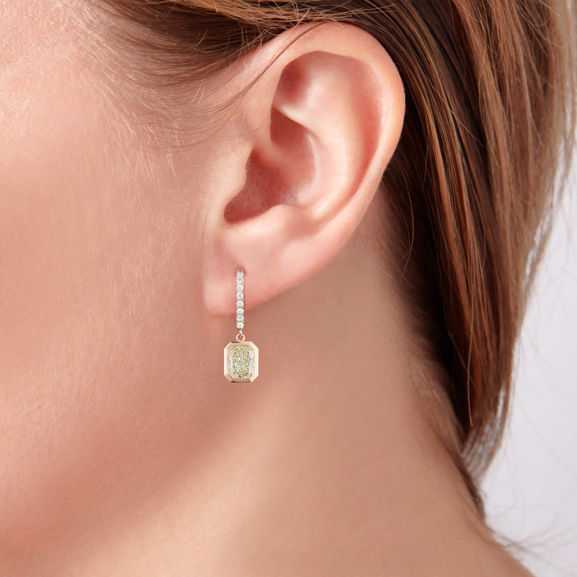 Ohrringe aus 750/- Rotgold mit getönten Diamanten im Radiant-Schliff (2,45 ct.) und Brillanten (0,21 ct.)Länge 2,45 cm