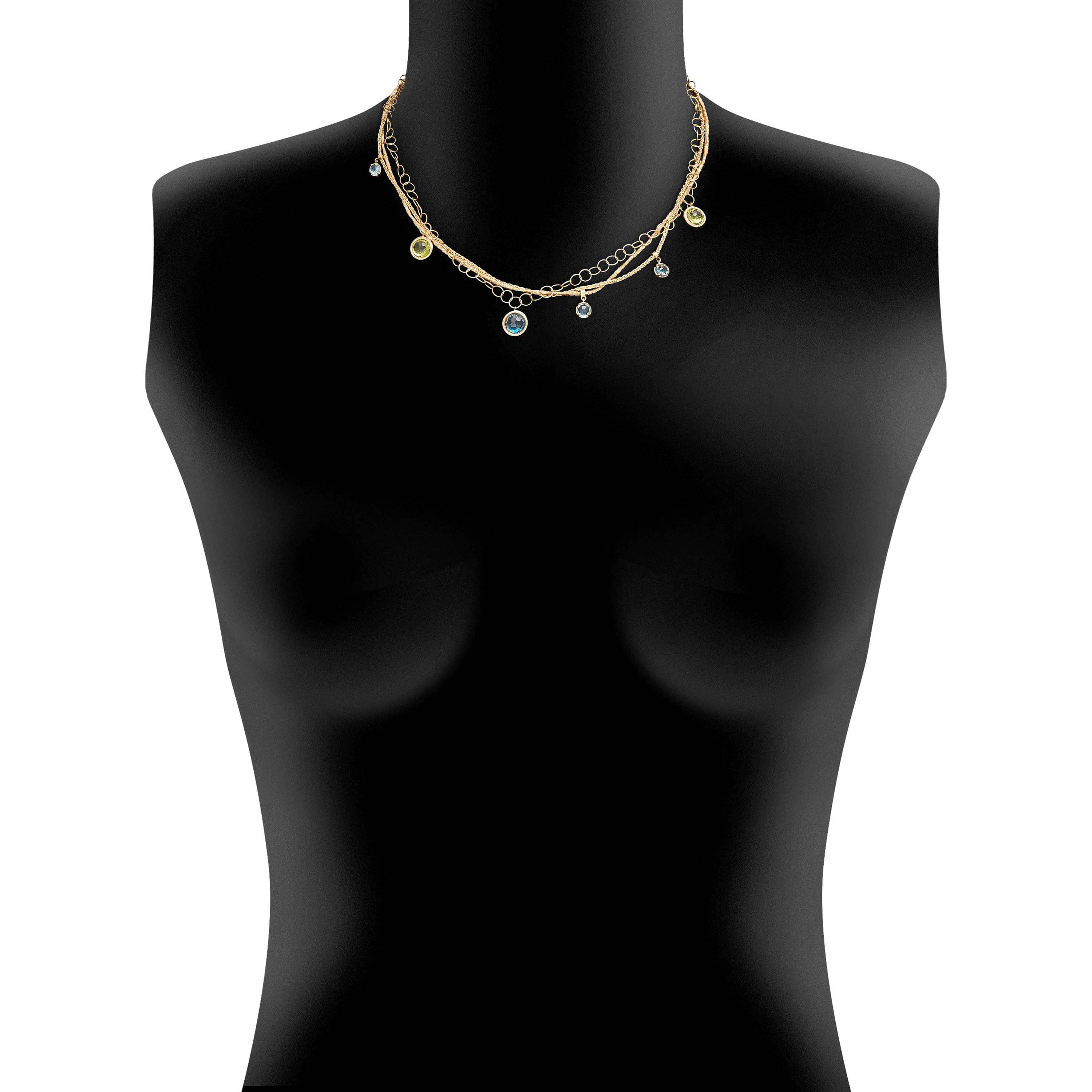 Collier aus 750/- Gelbgold mit blauen Topasen (1,26 ct.), London Topasen (3,18 ct.) und Peridots (4,76 ct.)Länge 45 cm