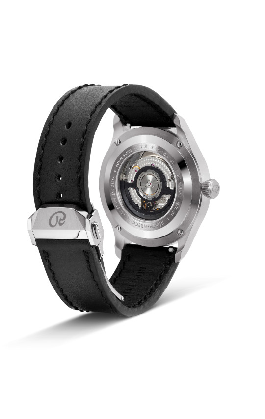 - Das Gehäuse ist bewusst zweiteilig gefertigt. Gehäuse und Lünette, die das beidseitig entspiegelte und kratzfeste Saphirglas halten, wurden bewusst aus einem Edelstahlblock gearbeitet. Die RÜSCHENBECK-Fliegeruhren sind mit einem entspiegelten Saphirglasboden ausgestattet und lassen einen Blick auf das fein veredelte Automatikwerk zu.