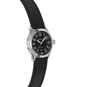 - Satinierte Ziffernblatt Appliken auf schwarzem Ziffernblatt, Geschwärzter Rotor mit R-Signet und zweiseitigem Aufzug, Gehäusenummer auf Gravurplakette graviert, handgefertigtes Kalbslederband