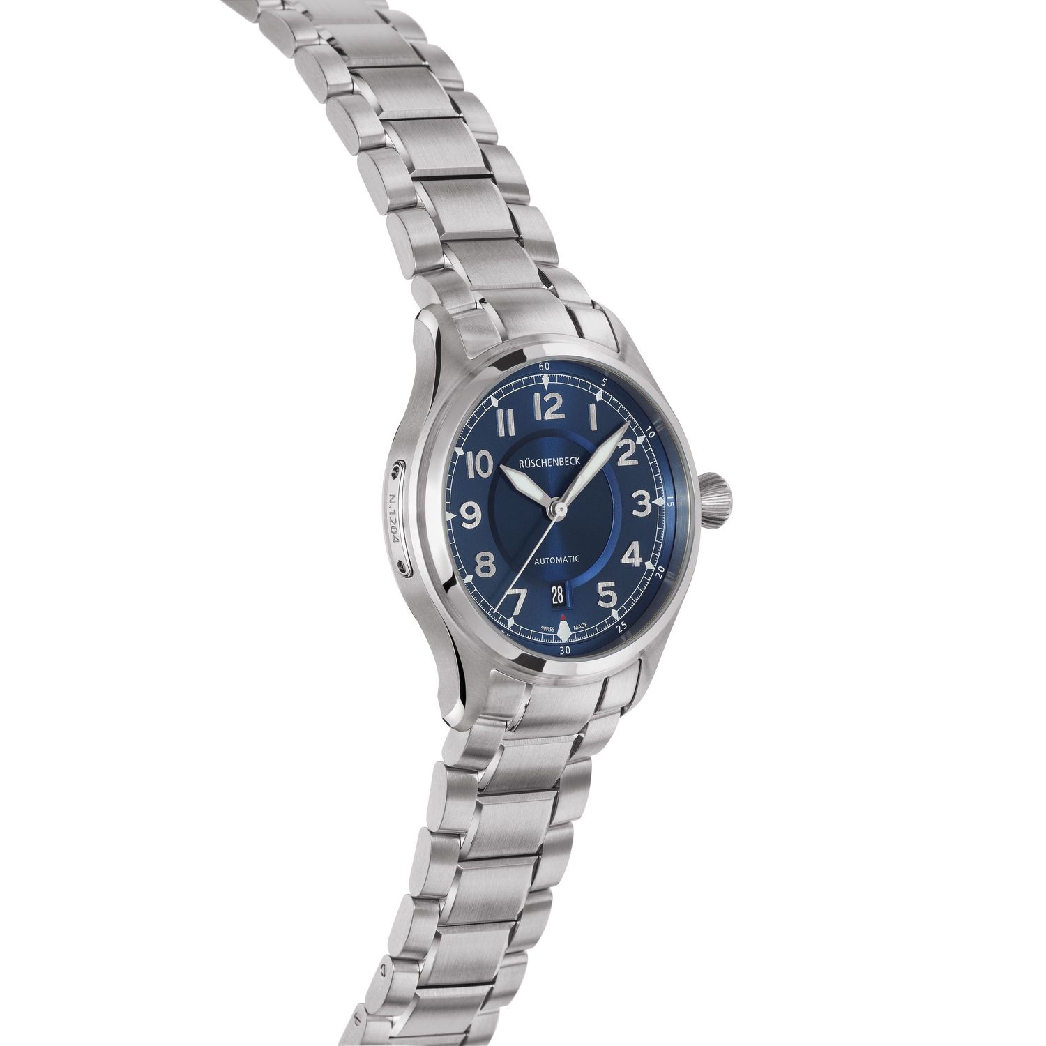 - Das Gehäuse ist bewusst zweiteilig gefertigt. Gehäuse und Lünette, die das beidseitig entspiegelte und kratzfeste Saphirglas halten, wurden bewusst aus einem Edelstahlblock gearbeitet. Die RÜSCHENBECK-Fliegeruhren sind mit einem entspiegelten Saphirglasboden ausgestattet und lassen einen Blick auf das fein veredelte Automatikwerk zu.