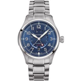 Modell "R2CITY" - in dieser Modellvariation sticht die R2CITY durch ein blaues Zifferblatt mit silberen Edelstahlarmband hervor. Der Zeitmesser verfügt über einen zusätzlichen 24-Stunden-Zeiger der über ein 24-Stunden-HilfsZifferblatt wandert. Die zeitliche Orientierung in verschiedenen Zeitzonen wird so dem Träger der Luxusuhr erleichtert. Das Metallband aus Edelstahl setzt sich aus verschieden großen und einzeln verschraubten Bandelementen zusammen. Ebenso wie das Gehäuse, ist auch das Uhrenarmband massiv gefertigt. Das Zifferblatt tritt durch fein satinierte Applikationen dezent in Erscheinung. R2CITY - Funktion: Stunde, Minute, Sekunde, Datum, 24-Stunden-Anzeige (GMT). Ø 42 mm, Edelstahl 316L, Automatik, 42 Stunden Gangreserve. Glas- und Gehäuseboden aus beidseitig entspiegeltem Saphirglas. Verschraubte Krone, wasserdicht bis 100 m (10 bar).