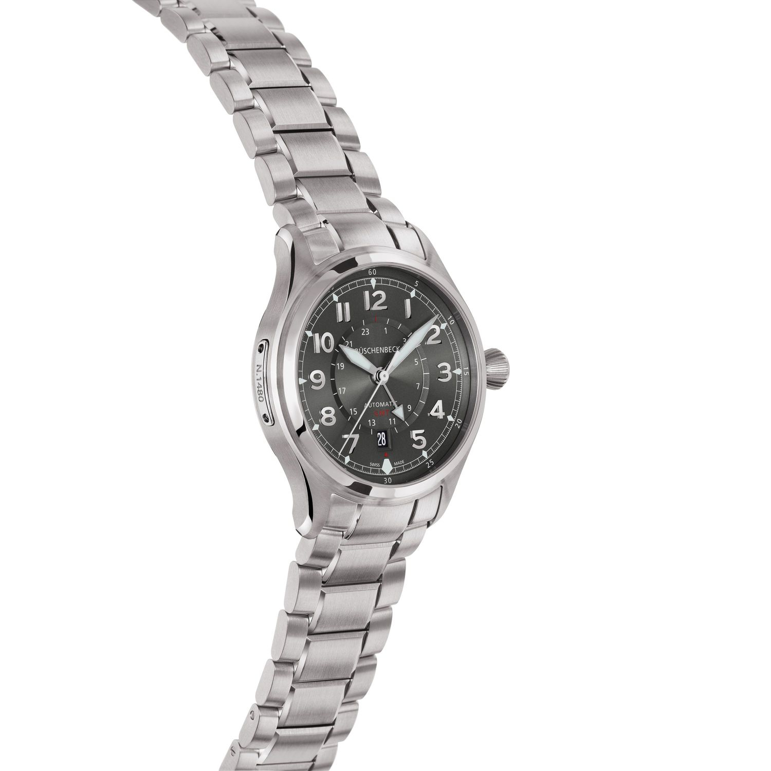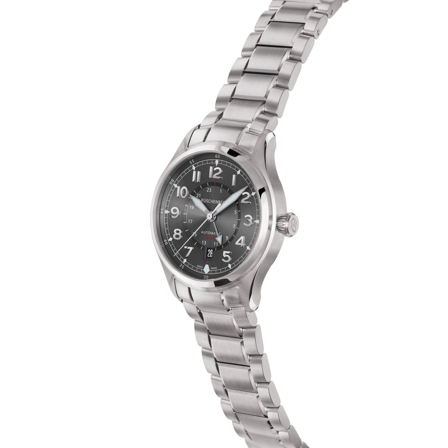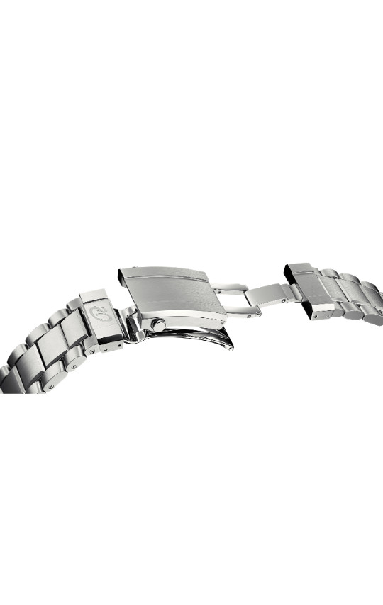 Modell "R2CITY" - in dieser Modellvariation sticht die R2CITY durch ein graues Zifferblatt mit silbernem Edelstahlarmband hervor. Der Zeitmesser verfügt über einen zusätzlichen 24-Stunden-Zeiger der über ein 24-Stunden-HilfsZifferblatt wandert. Die zeitliche Orientierung in verschiedenen Zeitzonen wird so dem Träger der Luxusuhr erleichtert. Das Metallband aus Edelstahl setzt sich aus verschieden großen und einzeln verschraubten Bandelementen zusammen. Ebenso wie das Gehäuse, ist auch das Uhrenarmband massiv gefertigt. Das Zifferblatt tritt durch fein satinierte Applikationen dezent in Erscheinung, wohingegen die Zeiger mit Superluminova beschichtet sind und in der Dunkelheit nachleuchten. R2CITY - Funktion: Stunde, Minute, Sekunde, Datum, 24-Stunden-Anzeige (GMT). Ø 42 mm, Edelstahl 316L, Automatik, 42 Stunden Gangreserve. Glas- und Gehäuseboden aus beidseitig entspiegeltem Saphirglas. Verschraubte Krone, wasserdicht bis 100 m (10 bar).