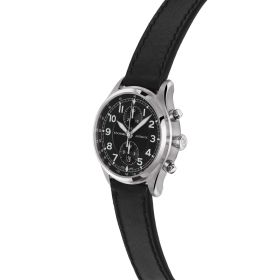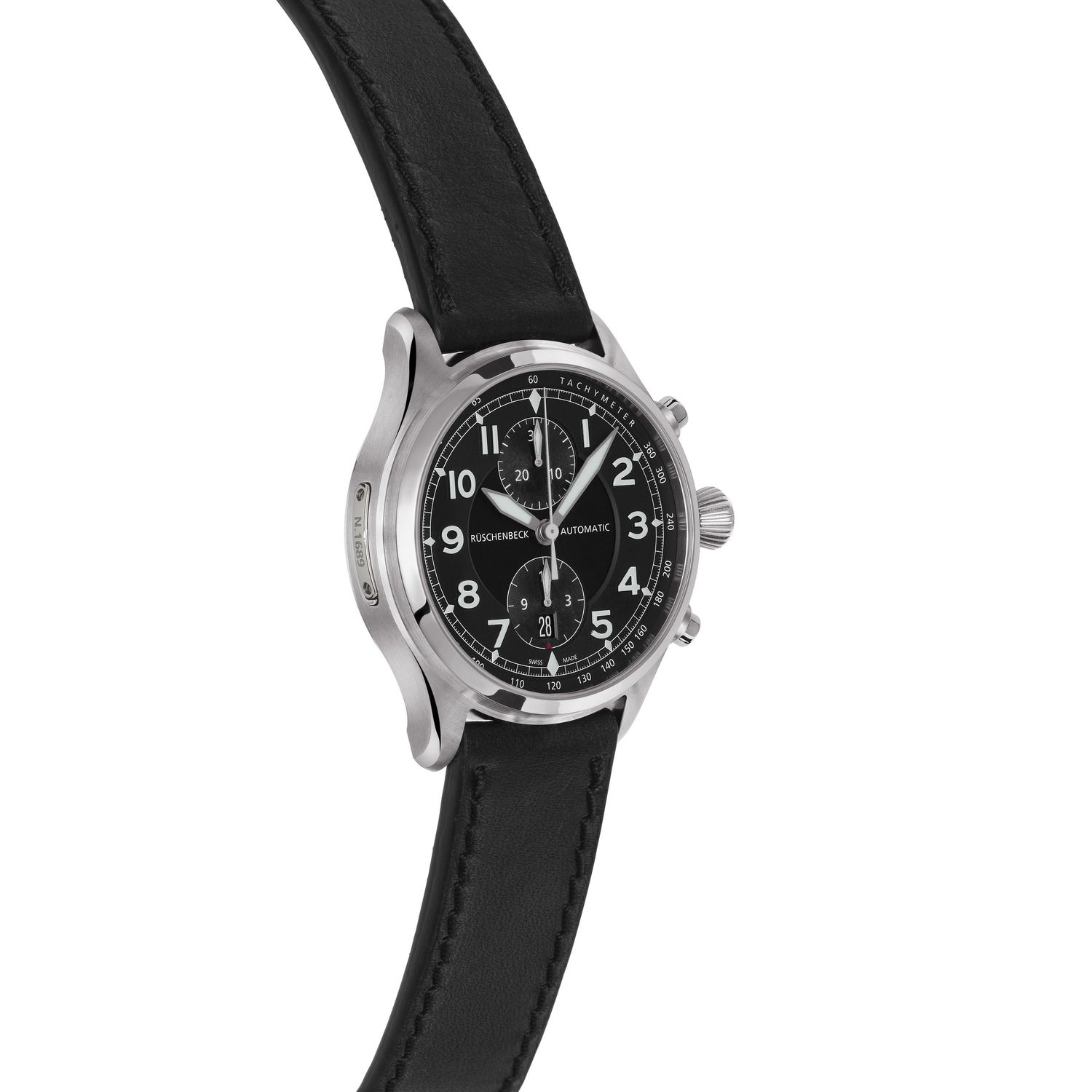 - Zeiger und Ziffernblattappliken mit Superluminova Beschichtung auf schwarzem Ziffernblatt, Geschwärzter Rotor mit R-Signet und zweiseitigem Aufzug, Gehäusenummer auf Gravurplakette graviert, handgefertigtes Kalbslederband, Chronograph stoppt Sekunde, Minute und Stunde
