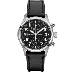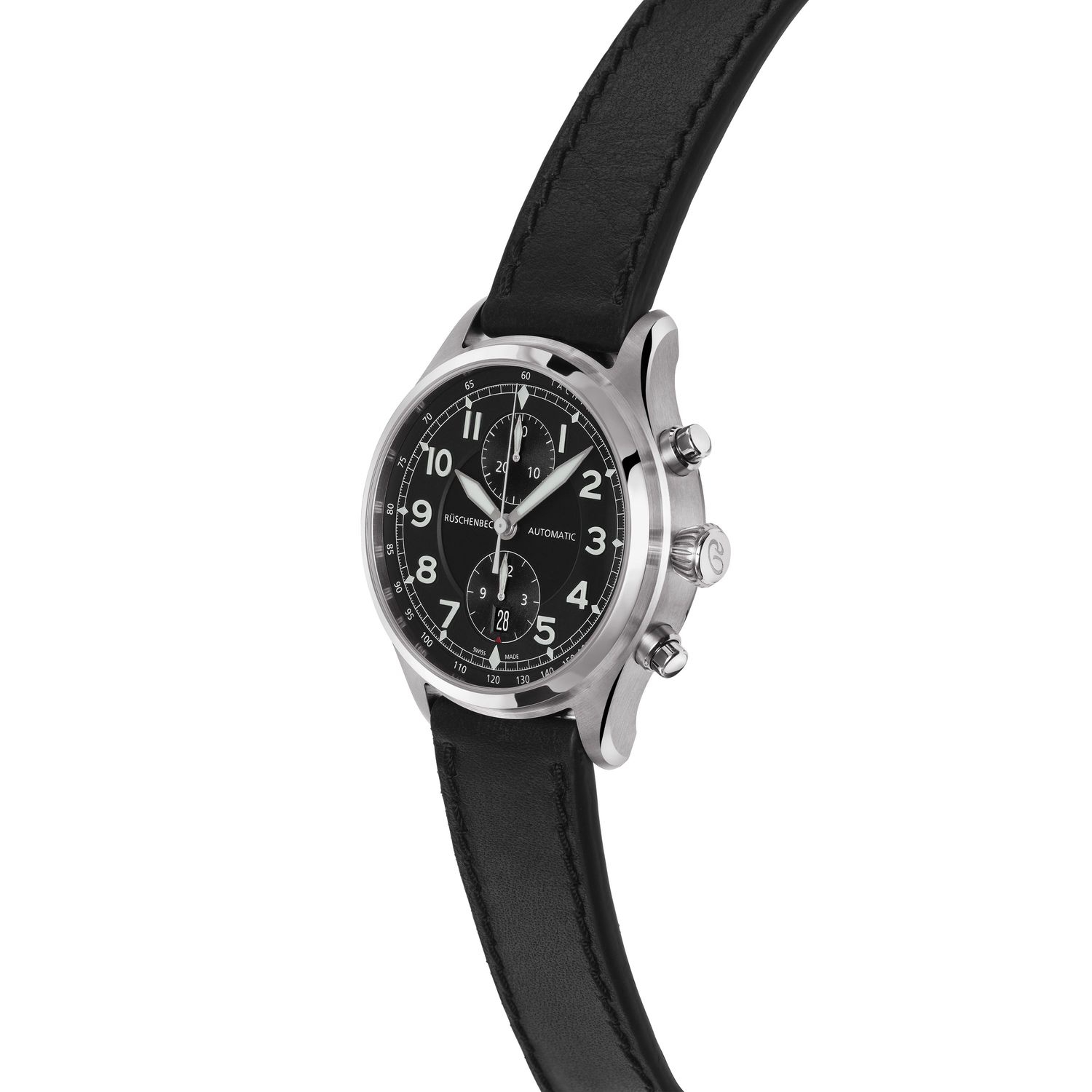 Die R3COUNTER mit schwarzem Lederarmband verfügt mit ihrer Chronographen Funktion über die beliebteste Zusatzfunktion unter den Herrenuhren. Das handgefertigtem Kalbslederband schmiegt sich angenehm an jedes Handgelenk. Die Sicherheitsfaltschließe der R3COUNTER hält beide Lederbandhälften sicher zusammen und sorgt für ein komfortables An- und Ablegen des Zeitmessers. Die Zifferblatt-Applikationen sind mit Superluminova beschichtet und leuchten in der Dunkelheit. R3COUNTER BLACK EDITION - Funktion: Stunde, Minute, Sekunde, Chronograph, Datum. Ø 44 mm, Edelstahl 316L mit DLC-Beschichtung, Automatik, 48 Stunden Gangreserve, satinierte Appliken. Glas- und Gehäuseboden aus beidseitig entspiegeltem Saphirglas. Verschraubte Krone, wasserdicht bis 100 m (10 bar).
