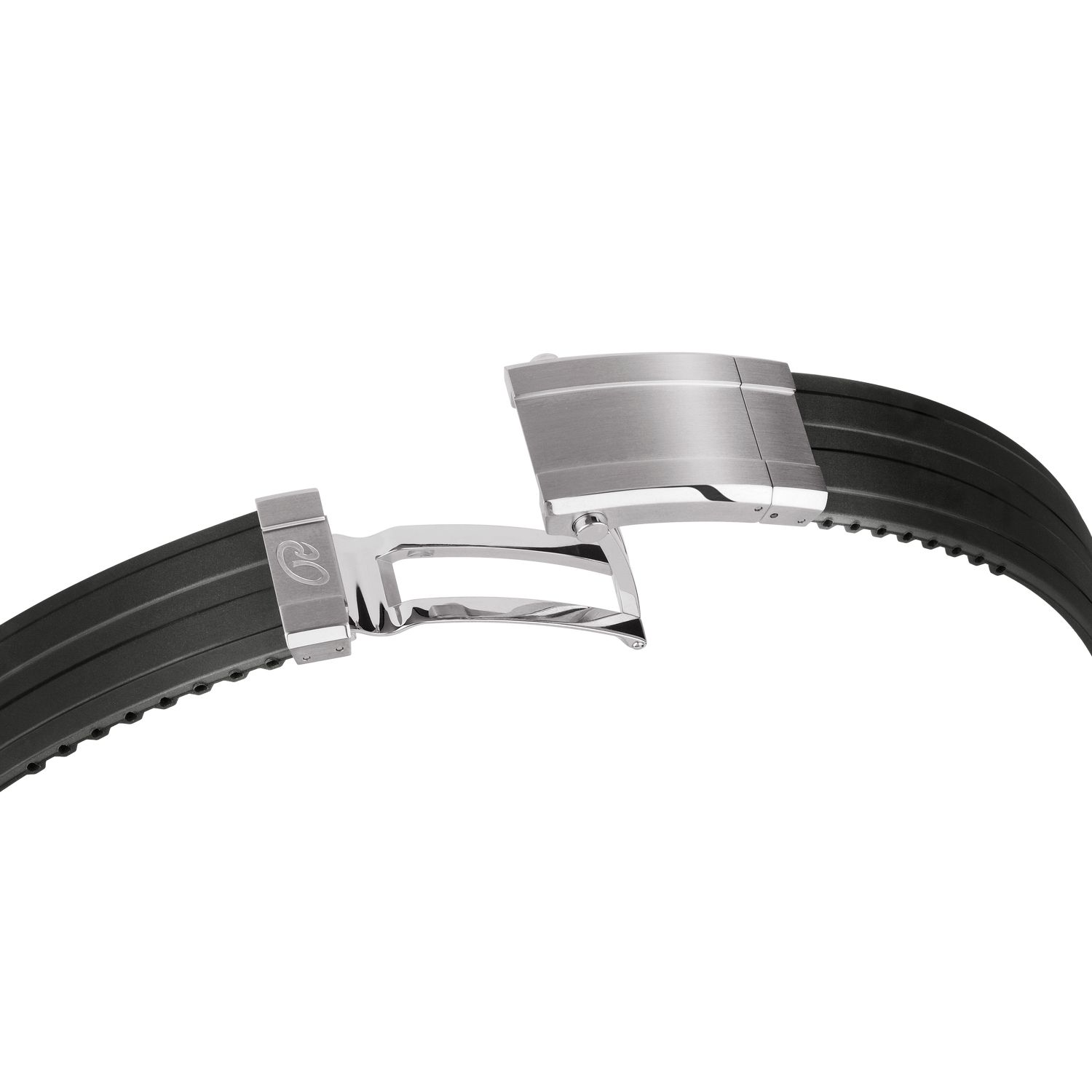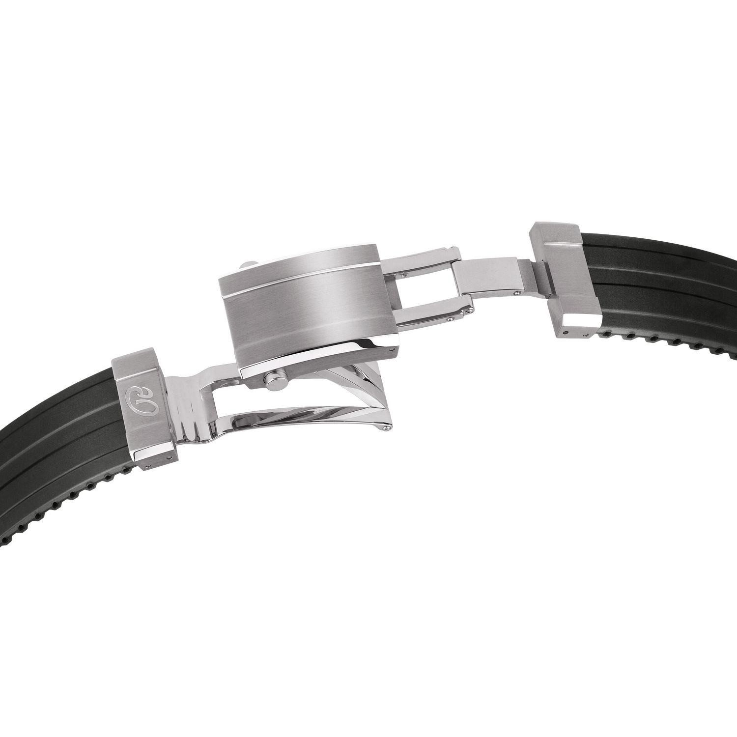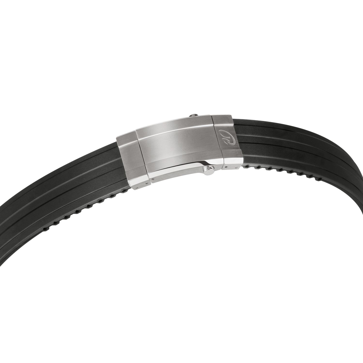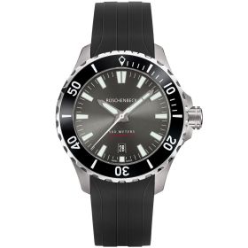 Als Taucheruhr in Reinform zeigt sich die R4DIVER aus der RÜSCHENBECK Kollektion. Mit einer extremen Wasserdichte von 50 bar ist sie absolut Tiefseetauglich, aber auch ein robuster Begleiter auf dem Festland. Das schwarze Kautschukband wird mit einer Sicherheitsfaltschließe geschlossen. Die Superluminova Beschichtung auf dem Zifferblatt sorgt für ein edles Nachleuchten der Uhr im dunkeln. R4DIVER - Funktion: Stunde, Minute, Sekunde, Datum. Ø 42 mm, Edelstahl 316L, Automatik, 42 Stunden Gangreserve, White Superluminova Appliken. Einseitig drehbare Lünette mit Keramik-Inlay, automatisches Helium-Ventil. Beidseitig entspiegeltes Saphirglas, verschraubter Gehäuseboden. Verschraubte Krone, wasserdicht bis 500 m (50 bar), Kautschukband mit Sicherheitsfaltschließe.