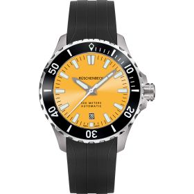Als Taucheruhr in Reinform zeigt sich die R4DIVER aus der RÜSCHENBECK – THE WATCH Taucheruhrenkollektion. Mit einer extremen Wasserdichte von 50 bar ist sie absolut tiefseetauglich, aber auch ein robuster Begleiter auf dem Festland. Das schwarze Kautschukband wird mit einer Sicherheitsfaltschließe geschlossen. Die Superluminova Beschichtung auf dem Zifferblatt in Gelb sorgt für ein edles Nachleuchten der Uhr im dunkeln. R4DIVER - Funktion: Stunde, Minute, Sekunde, Datum. Ø 42 mm, Edelstahl 316L, Automatik, 42 Stunden Gangreserve, White Superluminova Appliken. Einseitig drehbare Lünette mit Keramik-Inlay, automatisches Helium-Ventil. Beidseitig entspiegeltes Saphirglas, verschraubter Gehäuseboden. Verschraubte Krone, wasserdicht bis 500 m (50 bar), Kautschukband mit Sicherheitsfaltschließe.