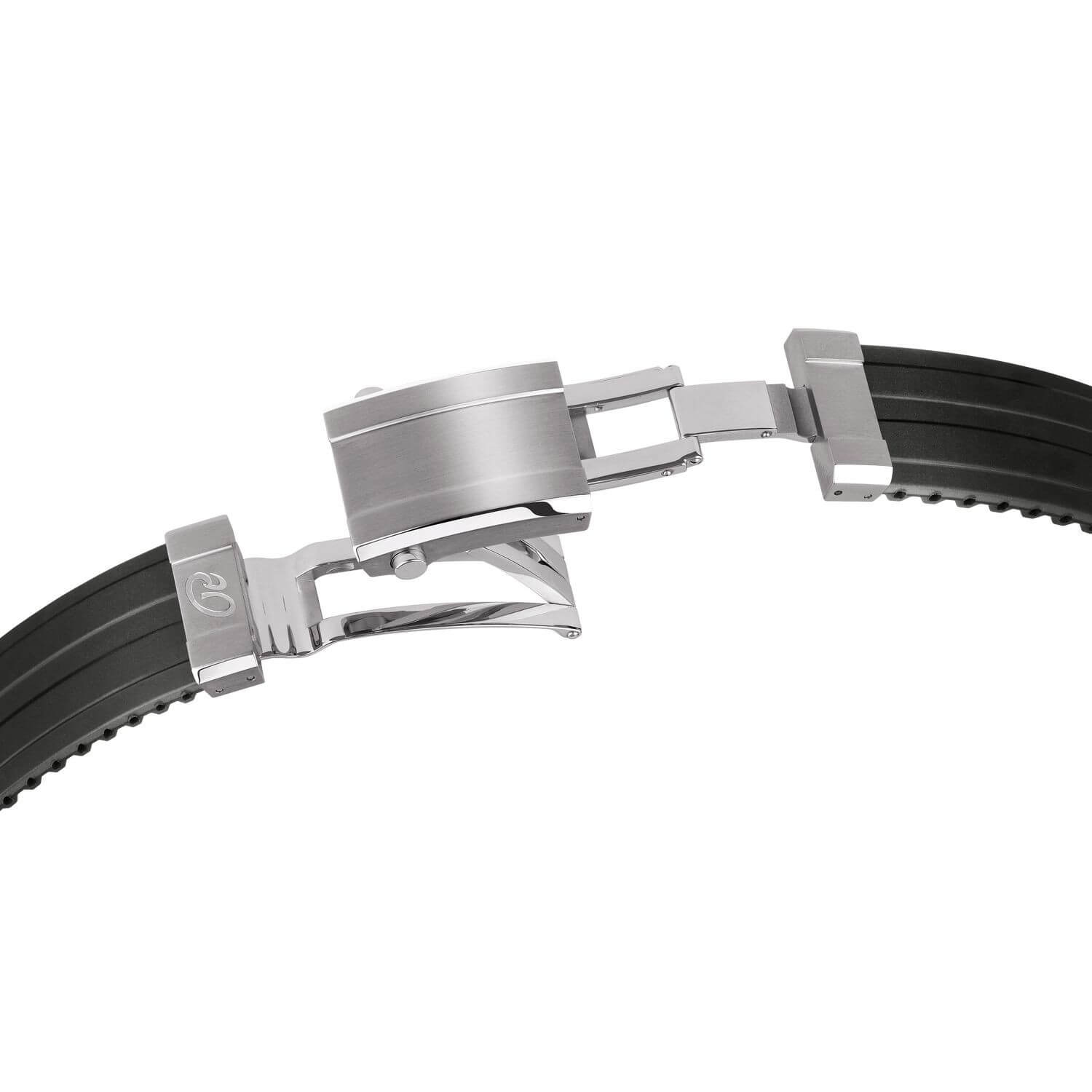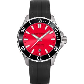 Als Taucheruhr in Reinform zeigt sich die R4DIVER aus der RÜSCHENBECK – THE WATCH Taucheruhrenkollektion. Mit einer extremen Wasserdichte von 50 bar ist sie absolut Tiefseetauglich, aber auch ein robuster Begleiter auf dem Festland. Das schwarze Kautschukband wird mit einer Sicherheitsfaltschließe geschlossen. Die Superluminova Beschichtung auf dem Zifferblatt in Rot sorgt für ein edles Nachleuchten der Uhr im dunkeln. R4DIVER - Funktion: Stunde, Minute, Sekunde, Datum. Ø 42 mm, Edelstahl 316L, Automatik, 42 Stunden Gangreserve, White Superluminova Appliken. Einseitig drehbare Lünette mit Keramik-Inlay, automatisches Helium-Ventil. Beidseitig entspiegeltes Saphirglas, verschraubter Gehäuseboden. Verschraubte Krone, wasserdicht bis 500 m (50 bar), Kautschukband mit Sicherheitsfaltschließe.