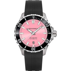 Als Taucheruhr in Reinform zeigt sich die R4DIVER aus der RÜSCHENBECK – THE WATCH Taucheruhrenkollektion. Mit einer extremen Wasserdichte von 50 bar ist sie absolut Tiefseetauglich, aber auch ein robuster Begleiter auf dem Festland. Das schwarze Kautschukband wird mit einer Sicherheitsfaltschließe geschlossen. Die Superluminova Beschichtung auf dem Zifferblatt in Pink sorgt für ein edles Nachleuchten der Uhr im dunkeln. R4DIVER - Funktion: Stunde, Minute, Sekunde, Datum. Ø 42 mm, Edelstahl 316L, Automatik, 42 Stunden Gangreserve, White Superluminova Appliken. Einseitig drehbare Lünette mit Keramik-Inlay, automatisches Helium-Ventil. Beidseitig entspiegeltes Saphirglas, verschraubter Gehäuseboden. Verschraubte Krone, wasserdicht bis 500 m (50 bar),Kautschukband mit Sicherheitsfaltschließe.