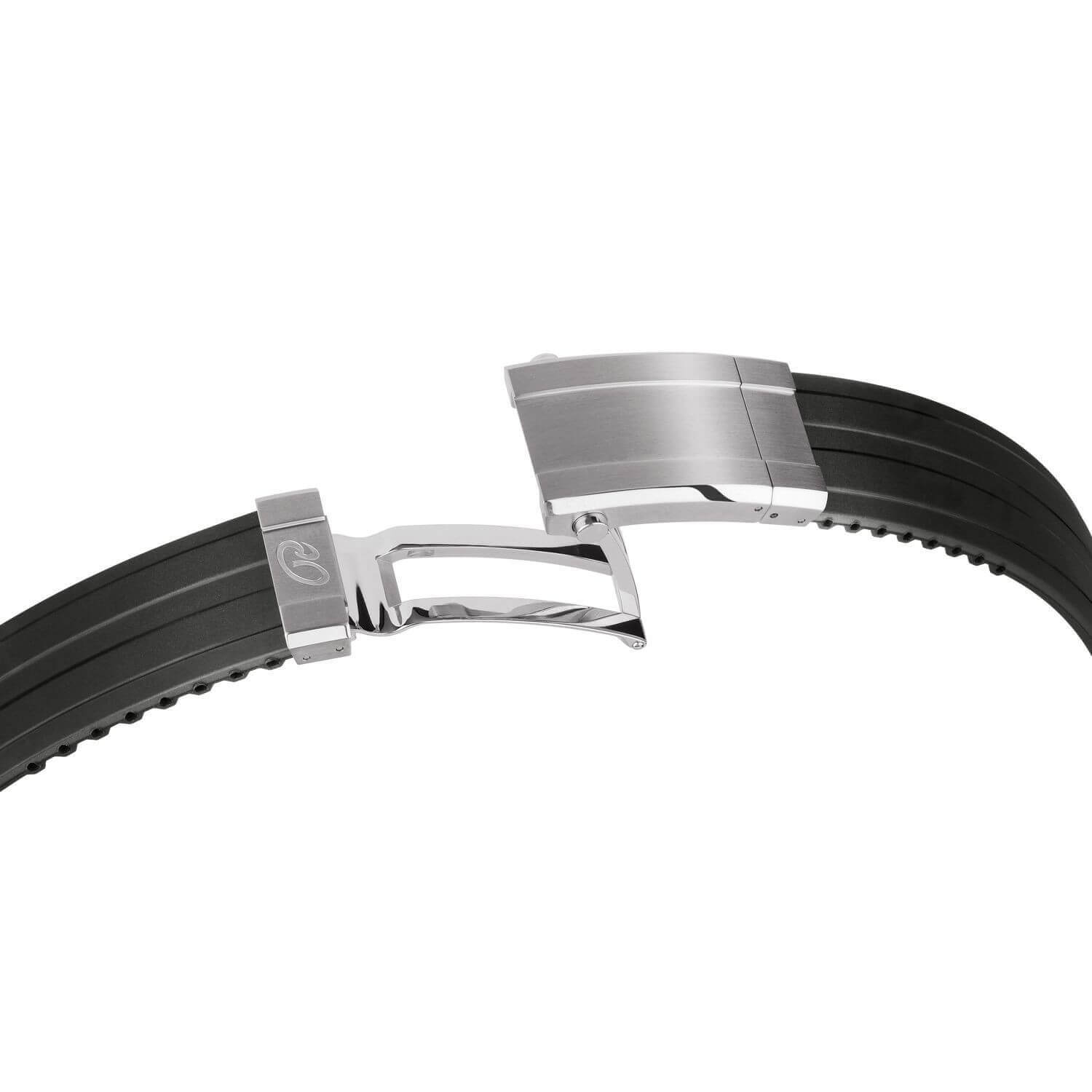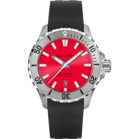 Als Taucheruhr in Reinform zeigt sich die R4DIVER aus der RÜSCHENBECK – THE WATCH Taucheruhrenkollektion. Mit einer extremen Wasserdichte von 50 bar ist sie absolut Tiefseetauglich, aber auch ein robuster Begleiter auf dem Festland. Das schwarze Kautschukband wird mit einer Sicherheitsfaltschließe geschlossen. Die Superluminova Beschichtung auf dem Zifferblatt in Rot sorgt für ein edles Nachleuchten der Uhr im dunkeln. R4DIVER - Funktion: Stunde, Minute, Sekunde, Datum. Ø 42 mm, Edelstahl 316L, Automatik, 42 Stunden Gangreserve, White Superluminova Appliken. Einseitig drehbare Stahl-Lünette, automatisches Helium-Ventil. Beidseitig entspiegeltes Saphirglas, verschraubter Gehäuseboden. Verschraubte Krone, wasserdicht bis 500 m (50 bar), Kautschukband mit Sicherheitsfaltschließe.