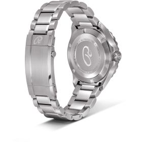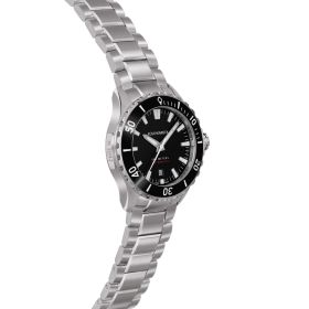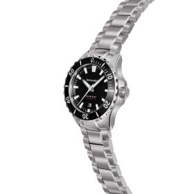 Als Taucheruhr in Reinform zeigt sich die silberne R4DIVER aus der RÜSCHENBECK Kollektion mit dem Zifferblatt in schwarz. Mit einer extremen Wasserdichte von 50 bar ist sie absolut Tiefseetauglich, aber auch ein robuster Begleiter auf dem Festland. Das Edelstahl-Metallarmband wird mit einer Sicherheitsfaltschließe geschlossen. Die Superluminova Beschichtung auf dem Zifferblatt sorgt für ein edles Nachleuchten der Uhr im dunkeln. R4DIVER - Funktion: Stunde, Minute, Sekunde, Datum. Ø 42 mm, Edelstahl 316L, Automatik, 42 Stunden Gangreserve, White Superluminova Appliken. Einseitig drehbare Lünette mit Keramik-Inlay, automatisches Helium-Ventil. Beidseitig entspiegeltes Saphirglas, verschraubter Gehäuseboden. Verschraubte Krone, wasserdicht bis 500 m (50 bar), Edelstahlband mit Sicherheitsfaltschließe und R-Link Verlängerungselement.