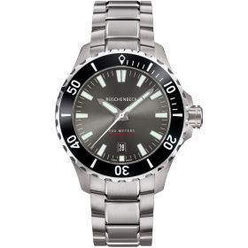 Als Taucheruhr in Reinform zeigt sich die silberne R4DIVER aus der RÜSCHENBECK Kollektion mit dem grauen Zifferblatt. Mit einer extremen Wasserdichte von 50 bar ist sie absolut Tiefseetauglich, aber auch ein robuster Begleiter auf dem Festland. Das Edelstahl-Metallarmband wird mit einer Sicherheitsfaltschließe geschlossen. Die Superluminova Beschichtung auf dem Zifferblatt sorgt für ein edles Nachleuchten der Uhr im dunkeln. R4DIVER - Funktion: Stunde, Minute, Sekunde, Datum. Ø 42 mm, Edelstahl 316L, Automatik, 42 Stunden Gangreserve, White Superluminova Appliken. Einseitig drehbare Lünette mit Keramik-Inlay, automatisches Helium-Ventil. Beidseitig entspiegeltes Saphirglas, verschraubter Gehäuseboden. Verschraubte Krone, wasserdicht bis 500 m (50 bar), Edelstahlband mit Sicherheitsfaltschließe und R-Link Verlängerungselement.
