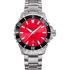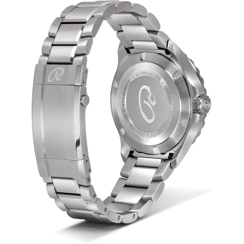 Als Taucheruhr in Reinform zeigt sich die R4DIVER aus der RÜSCHENBECK – THE WATCH Taucheruhrenkollektion. Mit einer extremen Wasserdichte von 50 bar ist sie absolut Tiefseetauglich, aber auch ein robuster Begleiter auf dem Festland. Das Edelstahlarmband wird mit einer Sicherheitsfaltschließe mitsamt integrierter Taucherverlängerung geschlossen. Die Superluminova Beschichtung auf dem Zifferblatt in Rot sorgt für ein edles Nachleuchten der Uhr im dunkeln. R4DIVER - Funktion: Stunde, Minute, Sekunde, Datum. Ø 42 mm, Edelstahl 316L, Automatik, 42 Stunden Gangreserve, White Superluminova Appliken. Einseitig drehbare Lünette mit Keramik-Inlay, automatisches Helium-Ventil. Beidseitig entspiegeltes Saphirglas, verschraubter Gehäuseboden. Verschraubte Krone, wasserdicht bis 500 m (50 bar), Edelstahlband mit Sicherheitsfaltschließe und R-Link Verlängerungselement.
