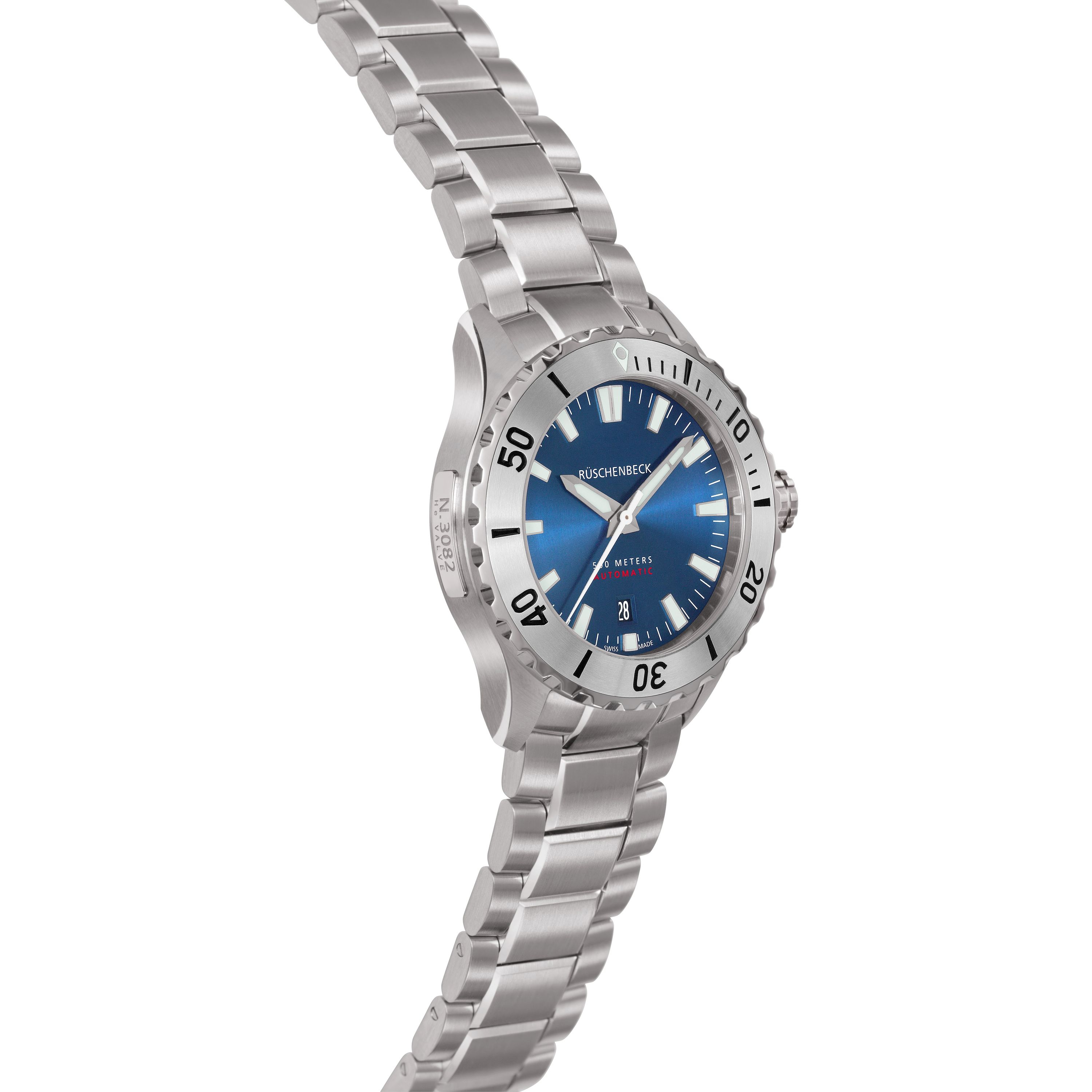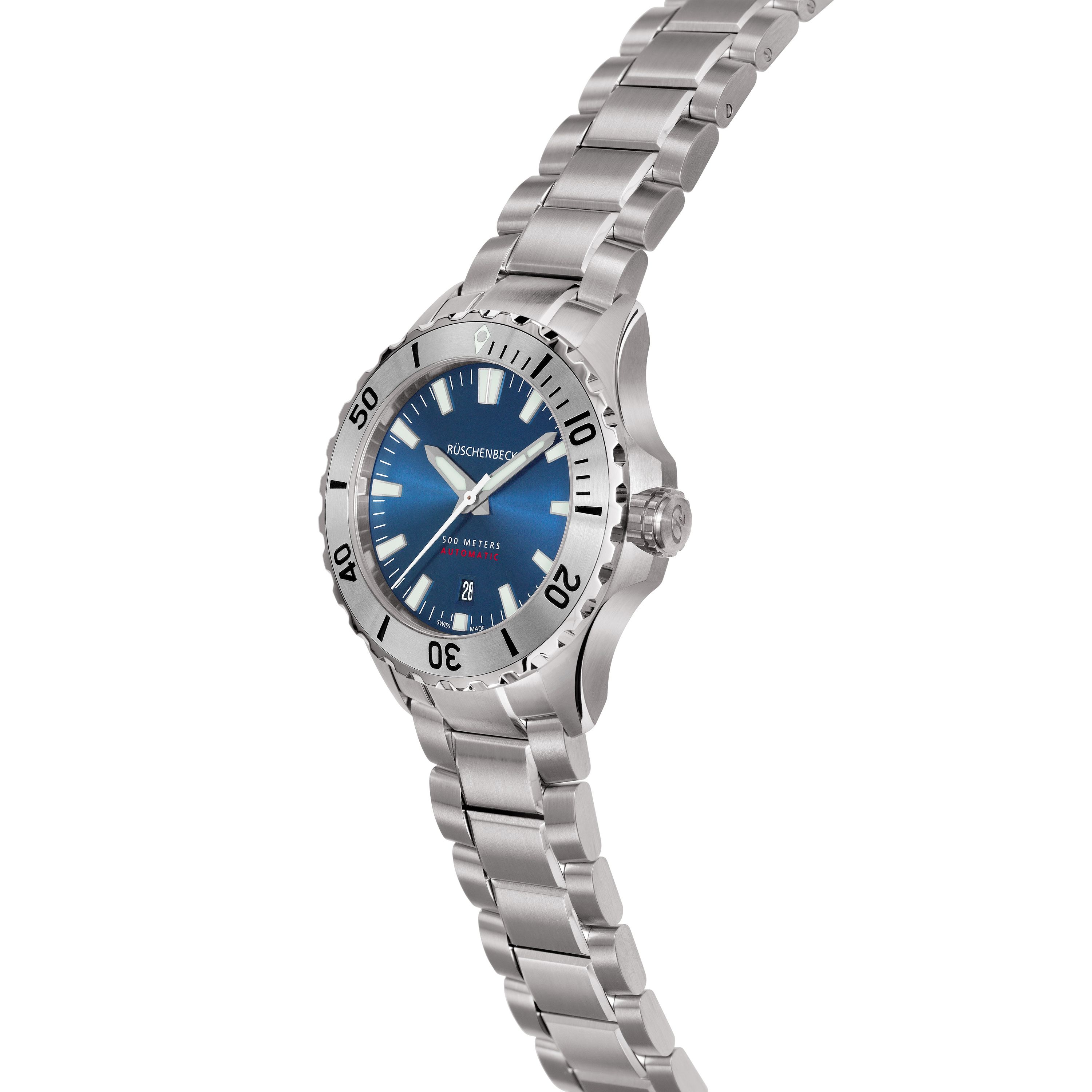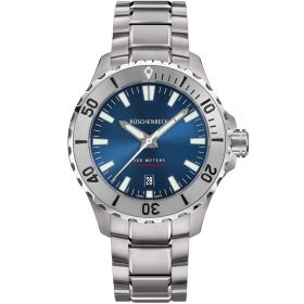 Als Taucheruhr in Reinform zeigt sich die R4DIVER aus der RÜSCHENBECK Kollektion mit blauem Zifferblatt und silbernen Edelstahl-Metallband. Mit einer extremen Wasserdichte von 50 bar ist sie absolut Tiefseetauglich, aber auch ein robuster Begleiter auf dem Festland. Die Superluminova Beschichtung auf dem Zifferblatt sorgt für ein edles Nachleuchten der Uhr im dunkeln. R4DIVER - Funktion: Stunde, Minute, Sekunde, Datum. Ø 42 mm, Edelstahl 316L, Automatik, 42 Stunden Gangreserve, White Superluminova Appliken. Einseitig drehbare Stahl-Lünette, automatisches Helium-Ventil. Beidseitig entspiegeltes Saphirglas, verschraubter Gehäuseboden. Verschraubte Krone, wasserdicht bis 500 m (50 bar), Edelstahlband mit Sicherheitsfaltschließe und R-Link Verlängerungselement.