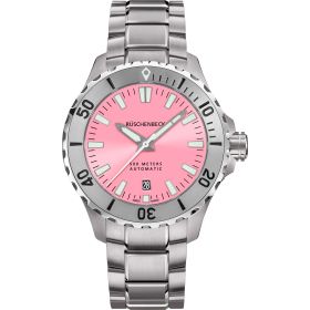 Als Taucheruhr in Reinform zeigt sich die R4DIVER aus der RÜSCHENBECK – THE WATCH Taucheruhrenkollektion. Mit einer extremen Wasserdichte von 50 bar ist sie absolut Tiefseetauglich, aber auch ein robuster Begleiter auf dem Festland. Das Edelstahlamrband wird mit einer Sicherheitsfaltschließe mitsamt integrierter Taucherverlängerung geschlossen. Die Superluminova Beschichtung auf dem Zifferblatt in Pink sorgt für ein edles Nachleuchten der Uhr im dunkeln. R4DIVER - Funktion: Stunde, Minute, Sekunde, Datum. Ø 42 mm, Edelstahl 316L, Automatik, 42 Stunden Gangreserve, White Superluminova Appliken. Einseitig drehbare Stahl-Lünette, automatisches Helium-Ventil. Beidseitig entspiegeltes Saphirglas, verschraubter Gehäuseboden. Verschraubte Krone, wasserdicht bis 500 m (50 bar), Edelstahlband mit Sicherheitsfaltschließe und R-Link Verlängerungselement.