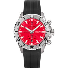 Die R5CHRONO mit Zifferblatt in Rot und schwarzem Kautschukband rundet die RÜSCHENBECK – THE WATCH Taucheruhrenkollektion ab. Als Chronograph ist sie ein wahrer Zeitmesser unter den RÜSCHENBECK Luxusuhren. Als Taucheruhr verfügt sie über eine extreme Wasserdichte von 50 bar. Das Kautschukarmband verfügt über einen Sicherheitsverschluss. Die Zeiger und Zifferblatt Applikationen der Luxustaucheruhr leuchten durch die Superluminova Veredelung im Dunkeln auf und kommen mit dem schwarzen Rahmen sehr edel zur Geltung. R5CHRONO, Funktion: Stunde, Minute, Sekunde , Datum, Chronograph. Ø 44 mm, Edelstahl 316L, Automatik, 48 Stunden Gangreserve, White Superluminova Appliken. Einseitig drehbare Lünette mit Keramik-Inlay, automatisches Helium-Ventil. Beidseitig entspiegeltes Saphirglas, verschraubter Gehäuseboden. Verschraubte Krone und Drücker, wasserdicht bis 500 m (50 bar), Kautschukband mit Sicherheitsfaltschließe.