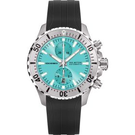 Die R5CHRONO mit Zifferblatt in Türkis und schwarzem Kautschukband rundet die RÜSCHENBECK – THE WATCH Taucheruhrenkollektion ab. Als Chronograph ist sie ein wahrer Zeitmesser unter den RÜSCHENBECK Luxusuhren. Als Taucheruhr verfügt sie über eine extreme Wasserdichte von 50 bar. Das Kautschukarmband verfügt über einen Sicherheitsverschluss. Die Zeiger und Zifferblatt Applikationen der Luxustaucheruhr leuchten durch die Superluminova Veredelung im Dunkeln auf und kommen mit dem silbernen Rahmen sehr edel zur Geltung. R5CHRONO, Funktion: Stunde, Minute, Sekunde , Datum, Chronograph. Ø 44 mm, Edelstahl 316L, Automatik, 48 Stunden Gangreserve, White Superluminova Appliken. Einseitig drehbare Stahl-Lünette, automatisches Helium-Ventil. Beidseitig entspiegeltes Saphirglas, verschraubter Gehäuseboden. Verschraubte Krone und Drücker, wasserdicht bis 500 m (50 bar), Kautschukband mit Sicherheitsfaltschließe.