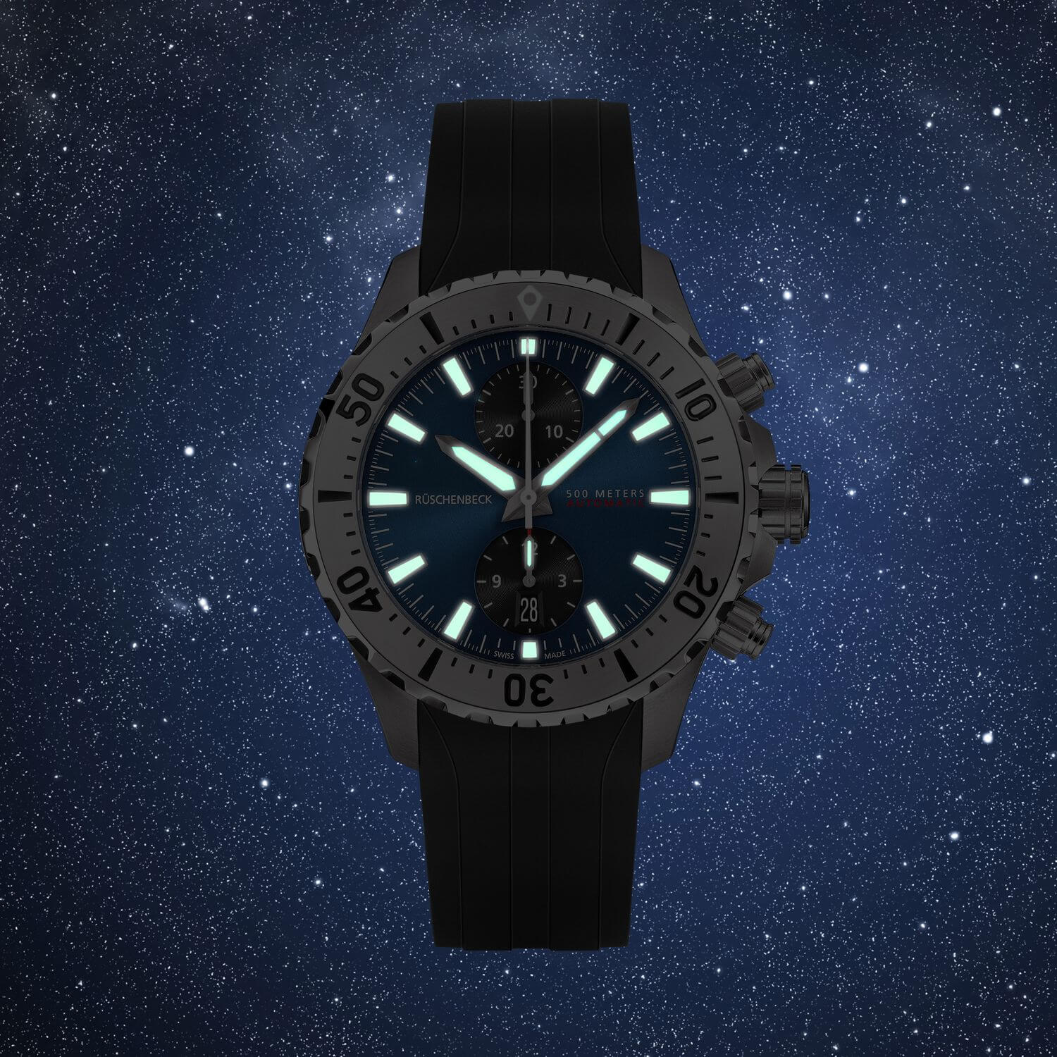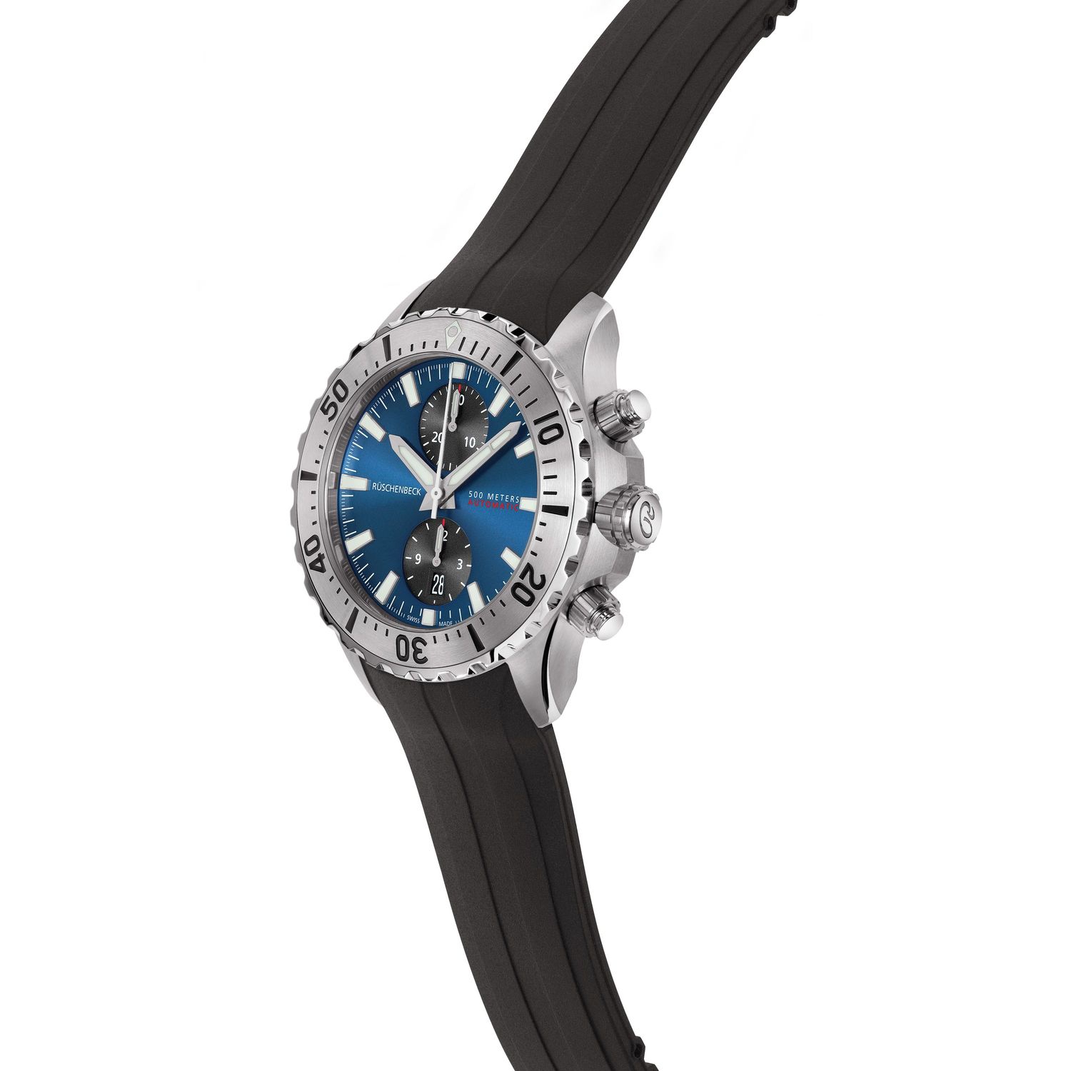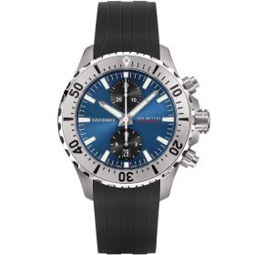 Die R5CHRONO mit blauem Zifferblatt und schwarzem Kautschukband rundet die RÜSCHENBECK - THE WATCH - Taucheruhrenkollektion ab. Als Chronograph ist sie ein wahrer Zeitmesser unter den RÜSCHENBECK Luxusuhren. Als Taucheruhr verfügt sie über eine extreme Wasserdichte von 50 bar. Das Kautschukarmband verfügt über einen Sicherheitsverschluss. Die Zeiger und Zifferblatt Applikationen der Luxustaucheruhr leuchten durch die Superluminova Veredelung im Dunkeln auf und kommen mit dem silbernen Rahmen sehr edel zur Geltung. R5CHRONO, Funktion: Stunde, Minute, Sekunde , Datum, Chronograph. Ø 44 mm, Edelstahl 316L, Automatik, 48 Stunden Gangreserve, White Superluminova Appliken. Einseitig drehbare Stahl-Lünette, automatisches Helium-Ventil. Beidseitig entspiegeltes Saphirglas, verschraubter Gehäuseboden. Verschraubte Krone und Drücker, wasserdicht bis 500 m (50 bar), Kautschukband mit Sicherheitsfaltschließe.