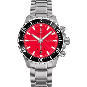 Die R5CHRONO mit Zifferblatt in Rot und Edelstahlband rundet die RÜSCHENBECK – THE WATCH Taucheruhrenkollektion ab. Als Chronograph ist sie ein wahrer Zeitmesser unter den RÜSCHENBECK Luxusuhren. Als Taucheruhr verfügt sie über eine extreme Wasserdichte von 50 bar. Das Edelstahlarmband verfügt über einen Sicherheitsverschluss mit Taucherverlängerung. Die Zeiger und Zifferblatt Applikationen der Luxustaucheruhr leuchten durch die Superluminova Veredelung im Dunkeln auf und kommen mit dem silbernen Rahmen sehr edel zur Geltung. R5CHRONO, Funktion: Stunde, Minute, Sekunde , Datum, Chronograph. Ø 44 mm, Edelstahl 316L, Automatik, 48 Stunden Gangreserve, White Superluminova Appliken. Einseitig drehbare Stahl-Lünette, automatisches Helium-Ventil. Beidseitig entspiegeltes Saphirglas, verschraubter Gehäuseboden. Verschraubte Krone und Drücker, wasserdicht bis 500 m (50 bar), Edelstahlband mit Sicherheitsfaltschließe und R-Link Verlängerungselement.