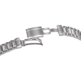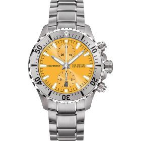Die R5CHRONO mit Zifferblatt in Gelb und Edelstahlband rundet die RÜSCHENBECK – THE WATCH Taucheruhrenkollektion ab. Als Chronograph ist sie ein wahrer Zeitmesser unter den RÜSCHENBECK Luxusuhren. Als Taucheruhr verfügt sie über eine extreme Wasserdichte von 50 bar. Das Edelstahlarmband verfügt über einen Sicherheitsverschluss mit Taucherverlängerung. Die Zeiger und Zifferblatt Applikationen der Luxustaucheruhr leuchten durch die Superluminova Veredelung im Dunkeln auf und kommen mit dem silbernen Rahmen sehr edel zur Geltung. R5CHRONO, Funktion: Stunde, Minute, Sekunde , Datum, Chronograph. Ø 44 mm, Edelstahl 316L, Automatik, 48 Stunden Gangreserve, White Superluminova Appliken. Einseitig drehbare Stahl-Lünette, automatisches Helium-Ventil. Beidseitig entspiegeltes Saphirglas, verschraubter Gehäuseboden. Verschraubte Krone und Drücker, wasserdicht bis 500 m (50 bar), Edelstahlband mit Sicherheitsfaltschließe und R-Link Verlängerungselement.
