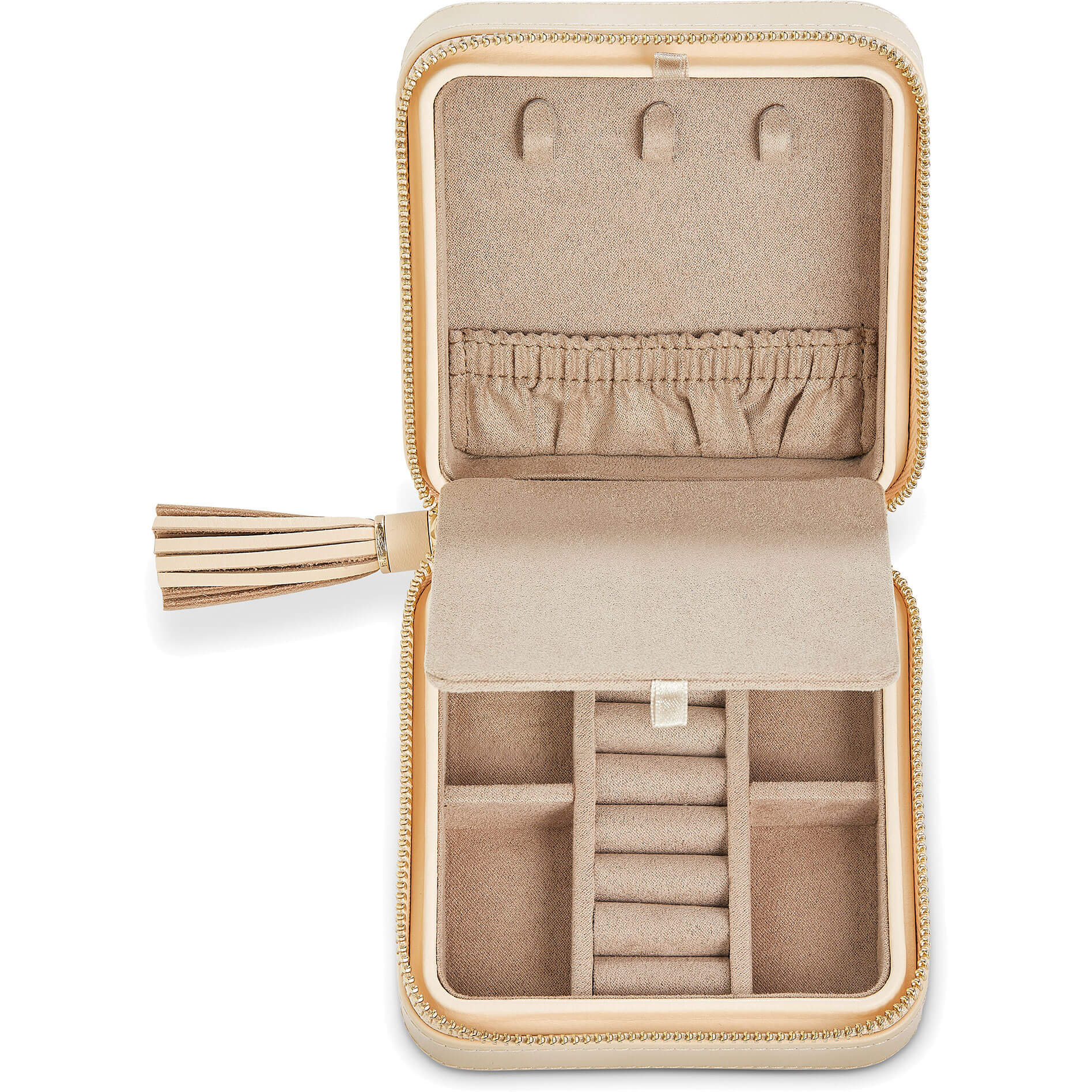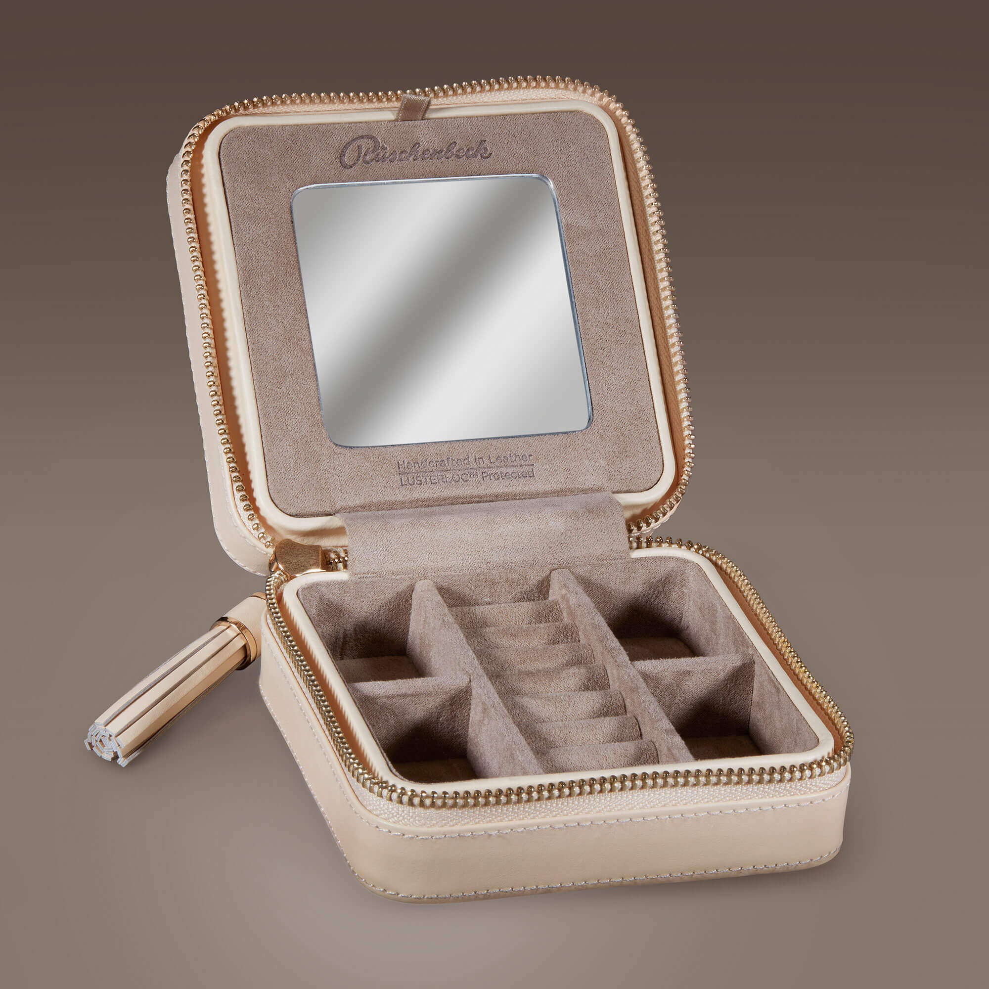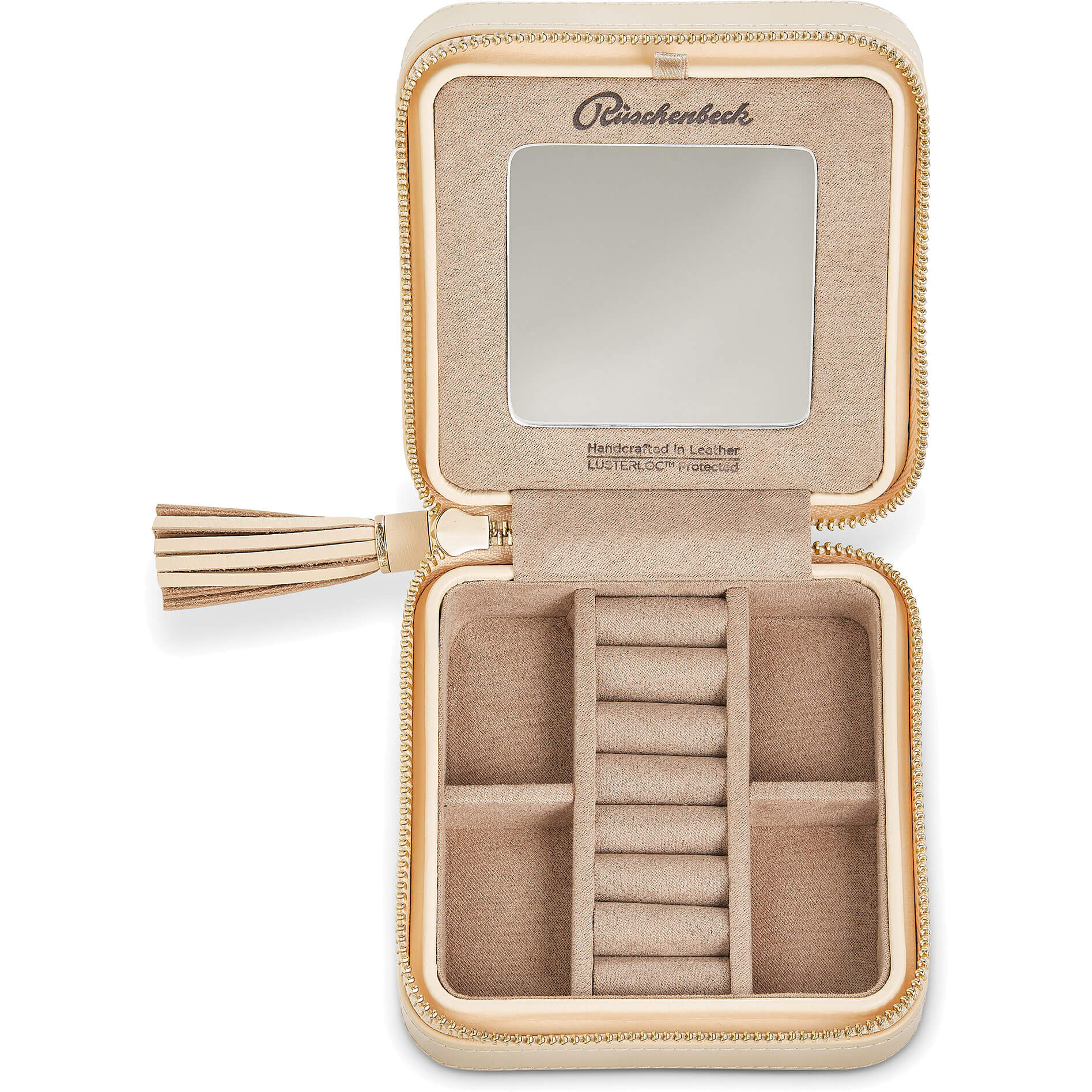 Kleines Schmuck Etui aus Leder in Beige mit integriertem Spiegel. Der perfekte Ort zur Schmuckaufbewahrung Ihrer Lieblingstücke. Das Reise Etui kann per umlaufendem Reißverschluss verschlossen werden. Weiche und hochwertige Innenfütterung mit Rüschenbeck-Schriftzug. Spezielle Beschichtung der Innenseite, durch welche Ihre Schmuckstücke bis zu 35 Jahre vor Verfärbungen und Anlaufen geschützt sind. Abmessungen ca. 13x12x6 cm (BxLxH).Produktspezifikationen