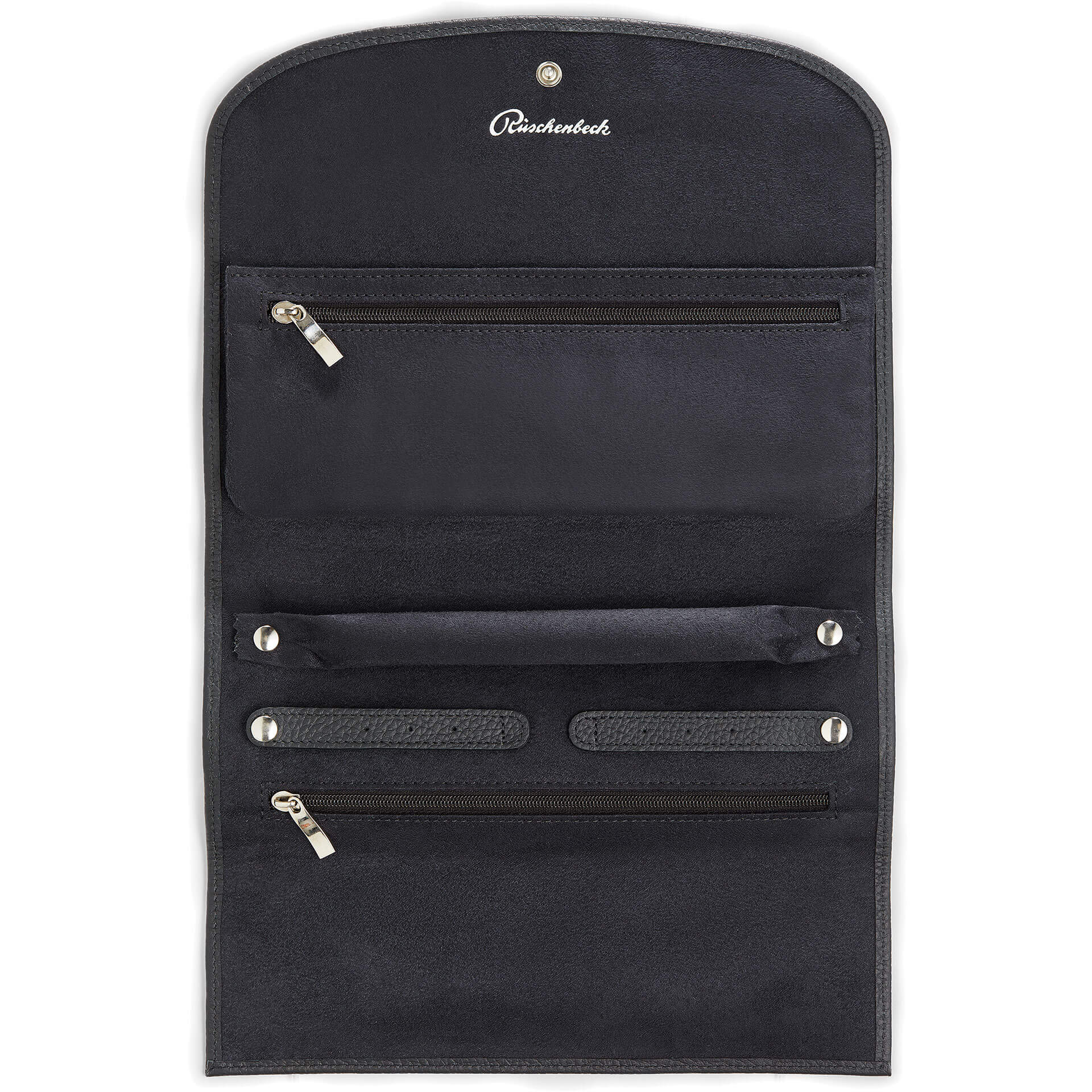 Großes Schmucketui aus feinstem Leder in Schwarz. Der perfekte Ort zur Schmuckaufbewahrung Ihrer Lieblingstücke. Auf der Außenseite befindet sich eine Rüschenbeck „R“-Prägung. Das Etui kann per Druckknopf verschlossen werden. Weiche und hochwertige Innenfütterung mit Rüschenbeck-Schriftzug. Diese Schmuckrolle verfügt über zwei Reißverschlusstaschen, gelochte Lederstreifen für Ohrringe und einen Halter für Ringe, damit Sie Ihre Lieblingsschmuckstücke auf Reisen mitnehmen können. Separate Bereiche für Ringe, Colliers, Armbänder und vieles mehr. Maße: 23x10 cm (LxB).Produktspezifikationen