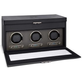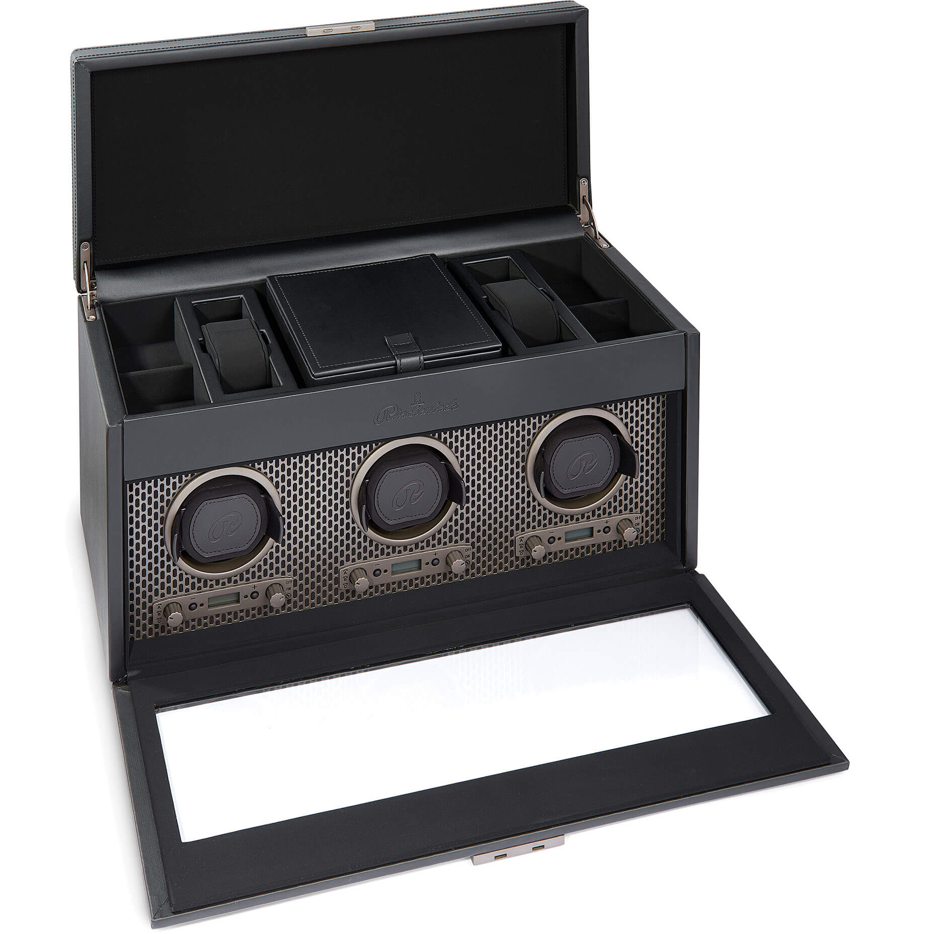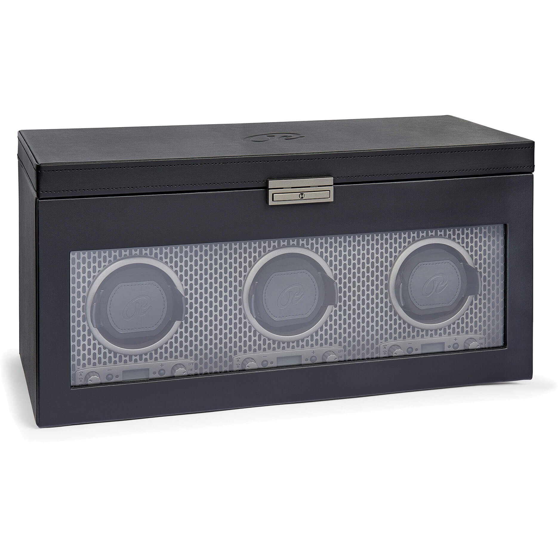 Großer Uhrenbeweger mit Platz für drei Uhren. Ein Uhrenbeweger gehört zur Grundaustattung aller Uhrenliebhaber. Dieser hochwertige und optisch ansprechende Uhrenbeweger ist aus Leder gefertigt und bietet Platz für bis zu drei Uhren. Das Rüschenbeck-R ist dezent auf der Oberseite geprägt. Der Uhrenbeweger kann mit AA-Batterien oder per Kabel aufgeladen werden. Batterien sind nicht enthalten.Produktspezifikationen