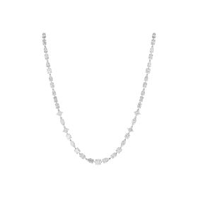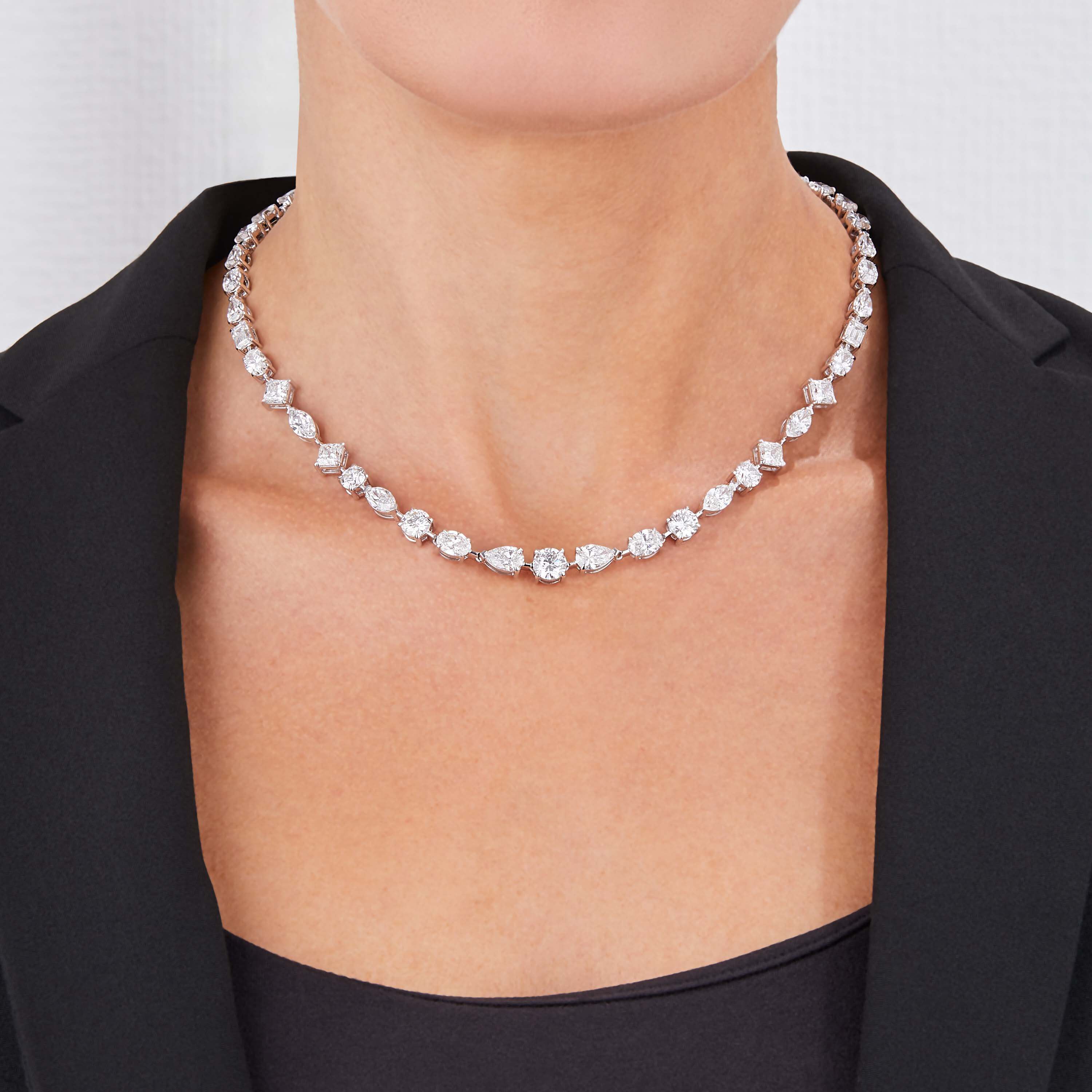 Collier aus 750/- Weißgold mit Diamanten im Tropfen-Schliff (9,41 ct.) LG, Diamanten im Princess-Schliff (4,16 ct.) LG, ovalen Diamanten (10,33 ct.) LG, Diamanten im Navette-Schliff (3,61 ct.) LG, Diamanten im Emerald-Schliff (1,51 ct.) LG und Brillanten (11,30 ct.) LGLänge 45 cm
