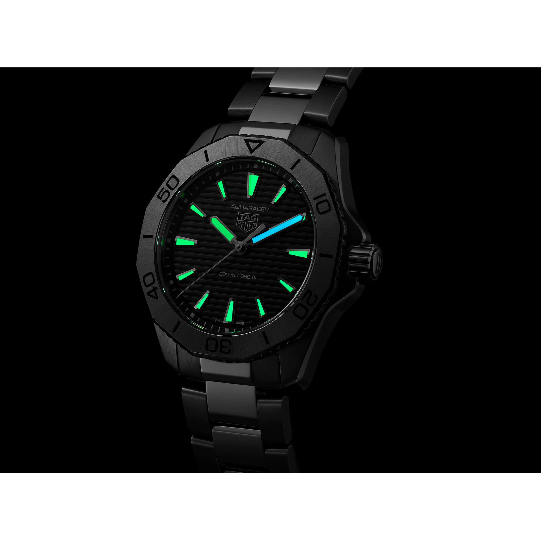 TAG Heuer Aquaracer Professional 200 Quarzuhr - Durchmesser 40 mm WBP1110.BA0627 - Zifferblatt schwarz. Die TAG Heuer Aquaracer ist ein zuverlässiges Modell, das allen Bedingungen standhält. Diese vielseitige Uhr mit Gehäuse und Armband aus Edelstahl ist bereit, sich jeder Herausforderung zu stellen. Sie bietet dabei eine optimierte Ergonomie und Verarbeitung, die höchsten Komfort und Eleganz versprechen. Mit ihrem raffinierten 40 mm großen Gehäuse aus Edelstahl und der dazu passenden Lünette, die unter allen Bedingungen absoluten Komfort bietet, ist diese TAG Heuer Aquaracer gebaut, um allen Bedingungen zu trotzen. Das schwarze gebürstete Zifferblatt mit Sonnenstrahleneffekt ist mit rhodinierten Zeigern und Indizes ausgestattet, die mit weißer SuperLuminova® gefüllt und zu jeder Tageszeit gut ablesbar sind. Das schlanke Armband aus Edelstahl bietet höchsten Tragekomfort und verfügt über eine Faltschließe mit Justierungssystem und doppelten Sicherheitsdrückern.