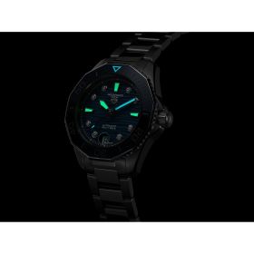 Diese TAG Heuer Aquaracer Professional 300 mit dem Automatikwerk Calibre 5 und einem blau lackierten Zifferblatt mit Wellenfinish ist eine Aufforderung, über sich hinauszuwachsen. Gewappnet für die tiefsten Meere, ein neuer Maßstab für Vielseitigkeit. Eine leuchtend blaue einseitig drehbare Lünette aus Keramik ergänzt sich hervorragend mit dem robusten Gehäuse und dem schönen Zifferblatt. 8 elegante VS-Diamanten (0,078 ct) sorgen für zusätzliche Eleganz. Eine 60-Minuten-Skala hilft beim Messen der verstrichenen Tauchzeit. Getreu dem legendären Aquaracer Erbe kombiniert das neue schlanke 36-mm-Gehäuse gebürstete und polierte Oberflächen mit einer präzisen Geometrie. Das druckfeste konische Armband aus Edelstahl wird mit zwei Sicherheitsdrückern an der Schließe gesichert und verfügt über ein Feineinstellsystem. Eine treue Begleiterin für jeden Taucher.